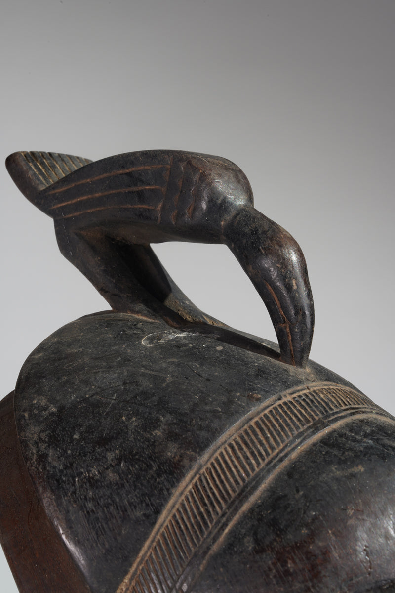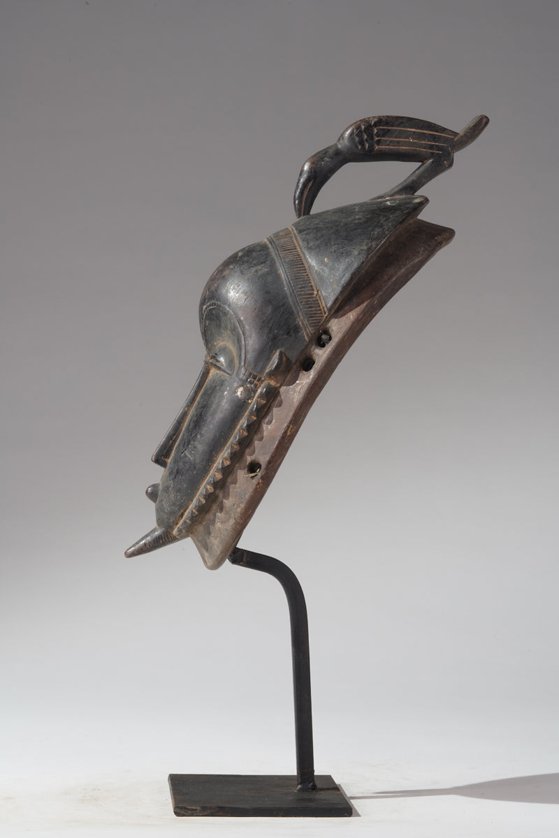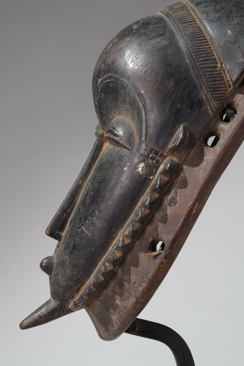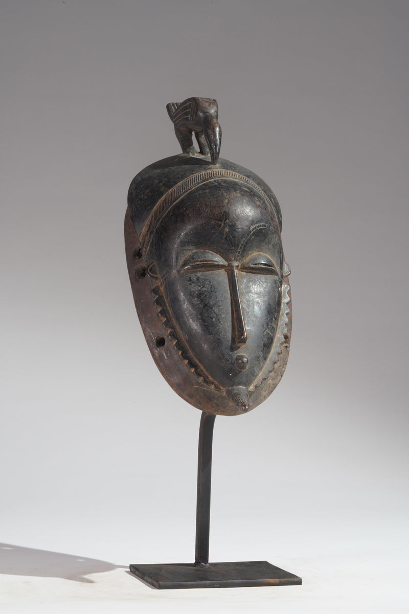 A Yaure mask called "Masque de réjouissances" (fertility-mask), collected in the region of Bouaflé, provenance Abdoulaye Bakayoko, Abidjan, Abdoulaye Bakayoko is a distinguished antique art dealer based in Abidjan, Côte d'Ivoire, renowned for his expertise in traditional West African art. He serves as the President of the Union Nationale des Antiquaires de Côte d'Ivoire (UNACI), the national association representing antique dealers in the Ivory Coast. Mr. Bakayoko is internationally recognized for his deep knowledge of African tribal art, with a particular focus on the cultural artifacts of Côte d'Ivoire. His collection encompasses a wide range of traditional pieces, including masks and statues from various ethnic groups such as the Dan, Bété, and Baoulé peoples.