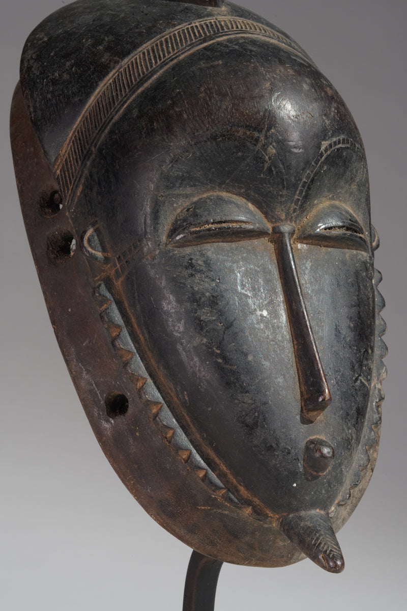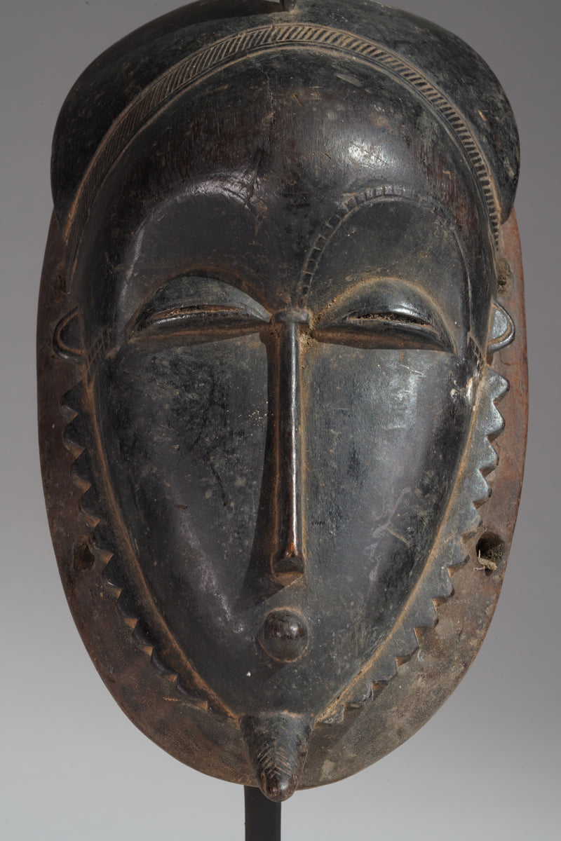 The Yaure (also Yohure) are geographically and linguistically situated between the Baule, an Akan language group to the east, and the Guro and Gban (Gagu), southern Mande-speaking peoples to the west. Depending upon their proximity to these neighbors, the inhabitants of Yaure villages are either primarily Baule or Mande speaking. The style of their masks reflects artistic borrowings and influences in the region. For example, the characteristic zigzag beard and scalloped hairline that appear on Baule masks are also found on masks from both the Baule and Guro.