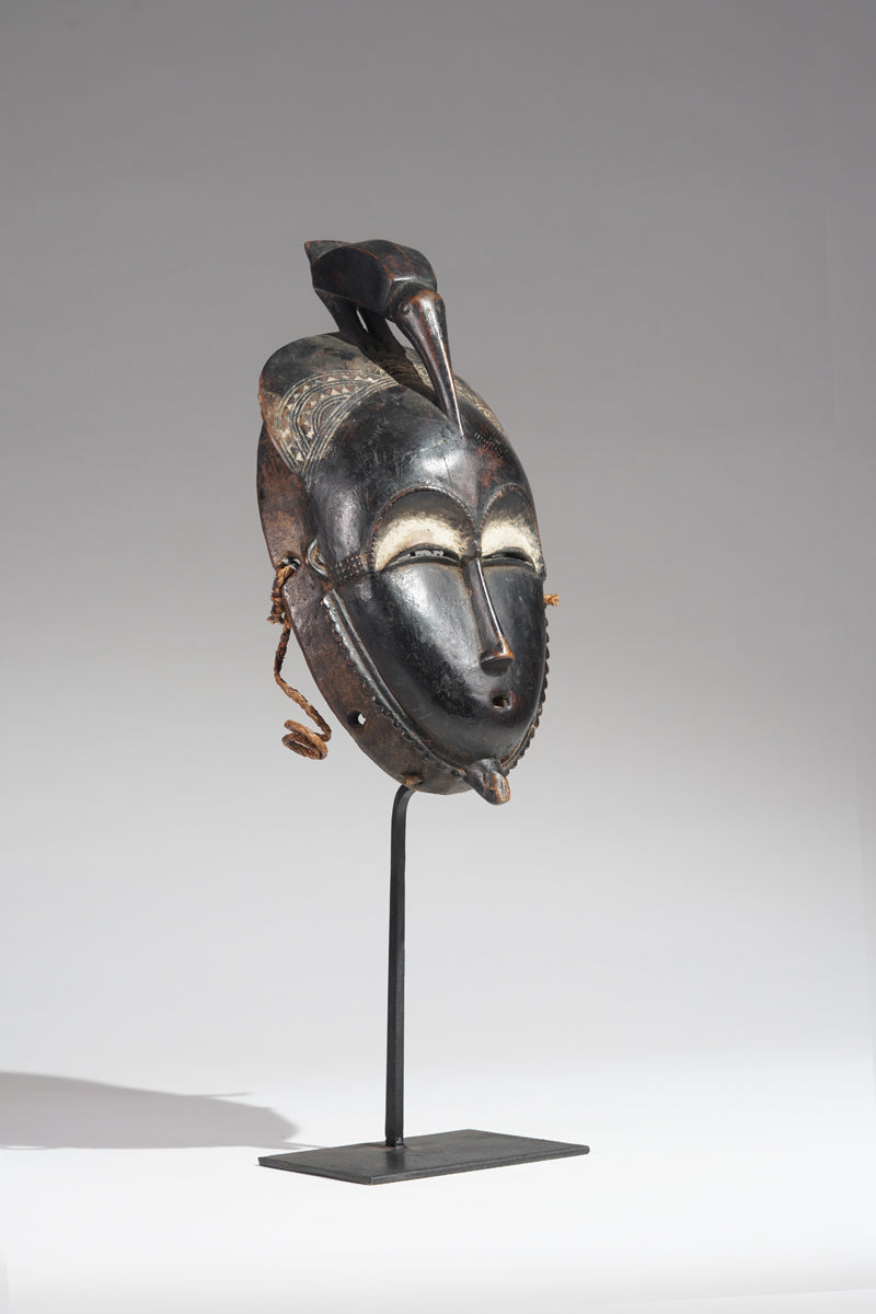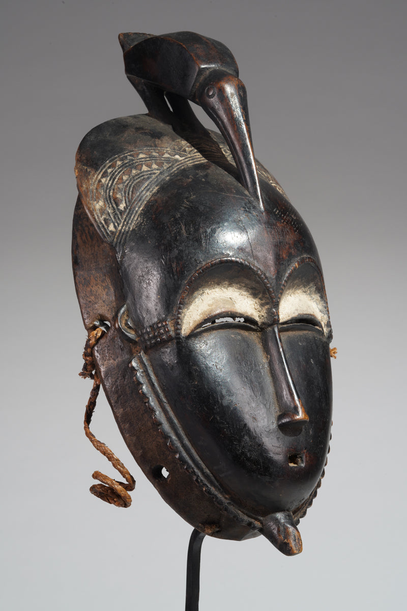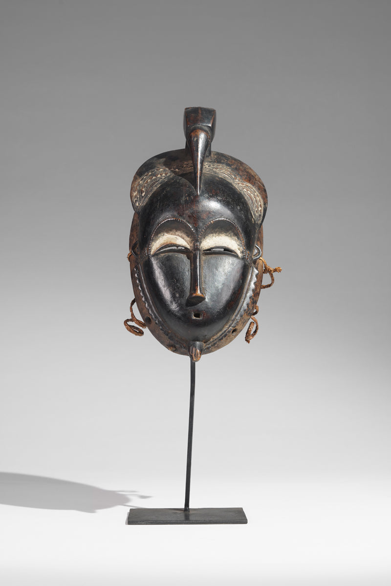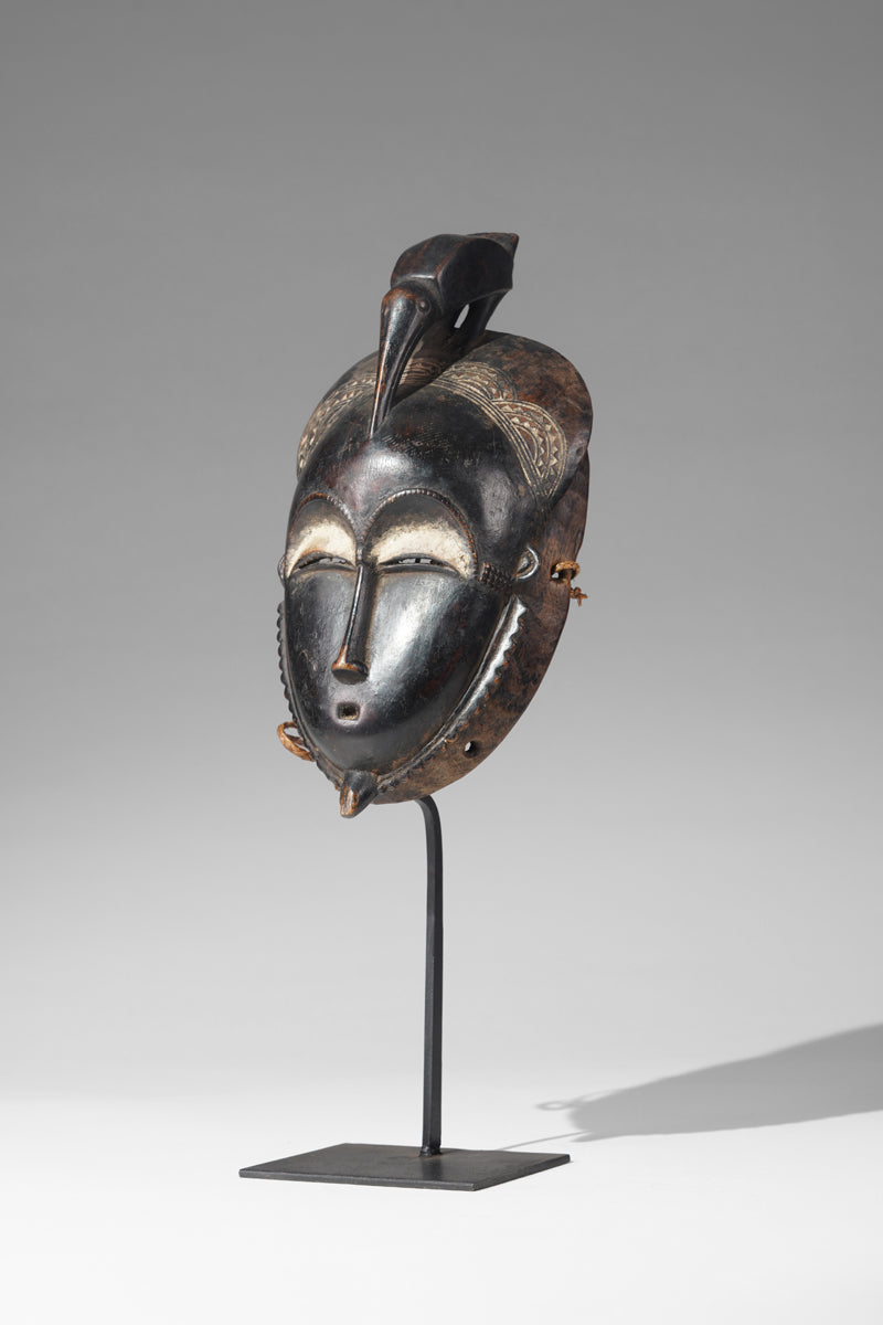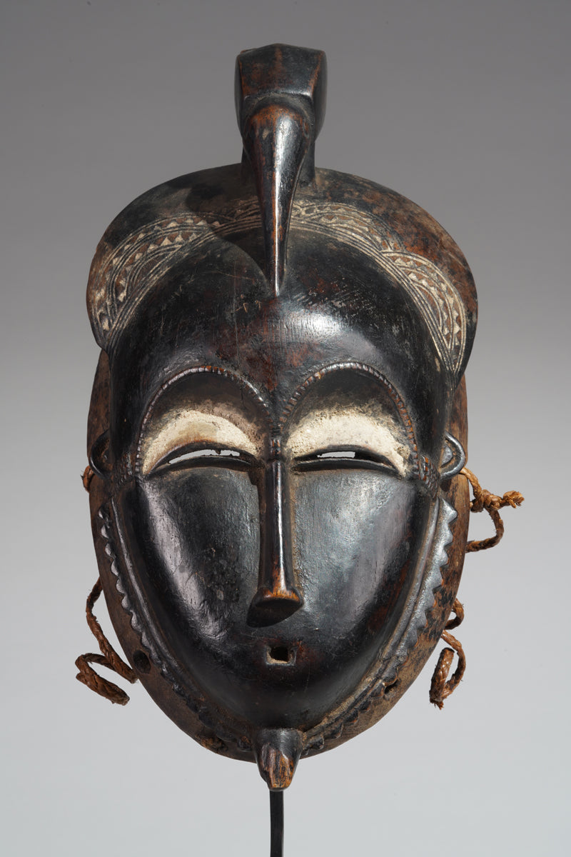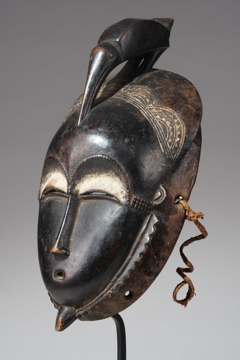 Characteristically, Yaure masks are oval-faced with delicately arched eyebrows, almond-shaped eyes, fine noses, and closed or slightly parted mouths, often conveying serenity and restraint. Many include elaborate coiffures or vertical elements above the head, which may symbolize birds or abstract spiritual entities. A distinctive trait of Yaure masks is the use of a central ridge running vertically down the face, and a refined interplay between black and reddish-brown tones, often polished to a soft sheen.