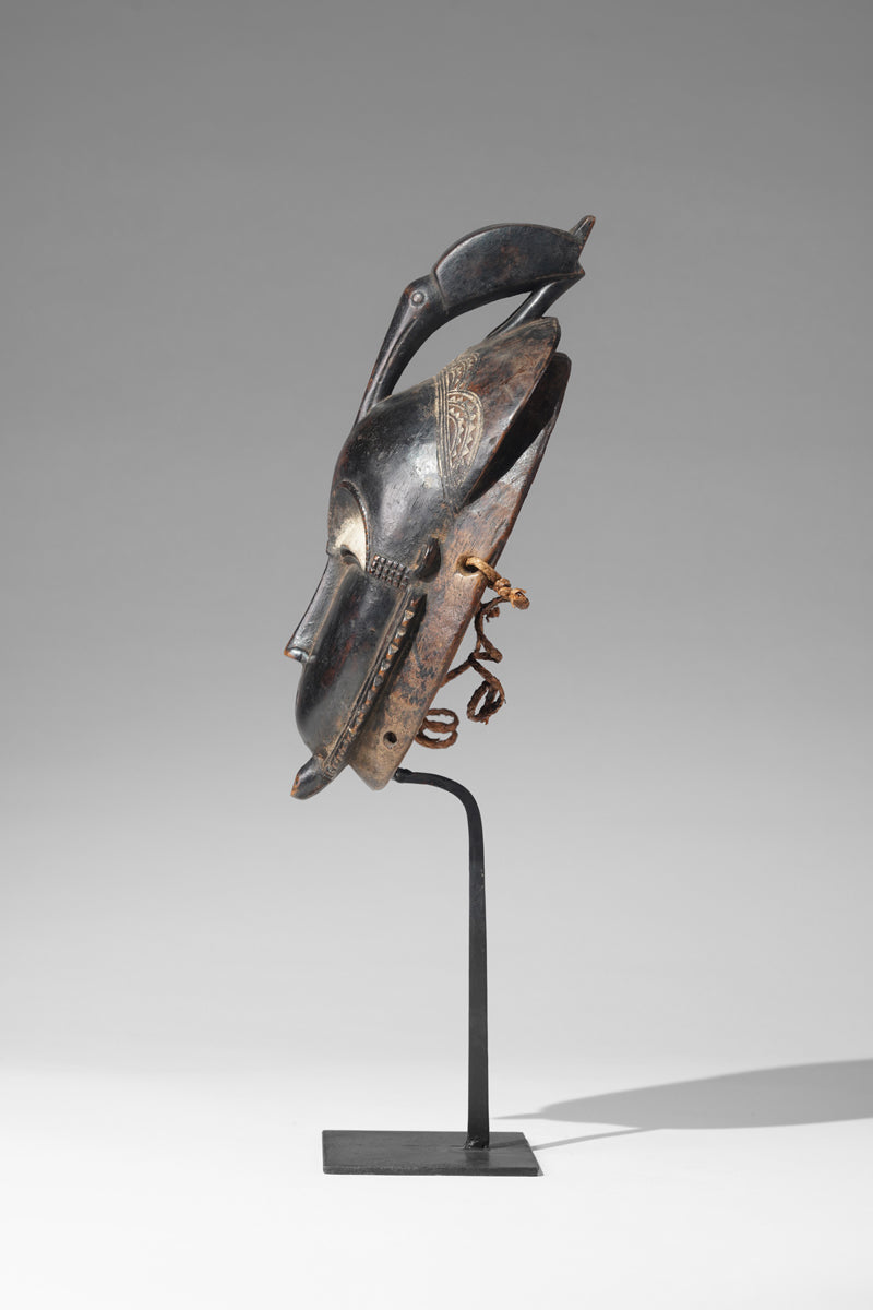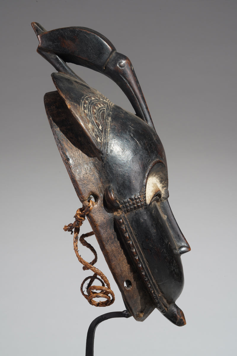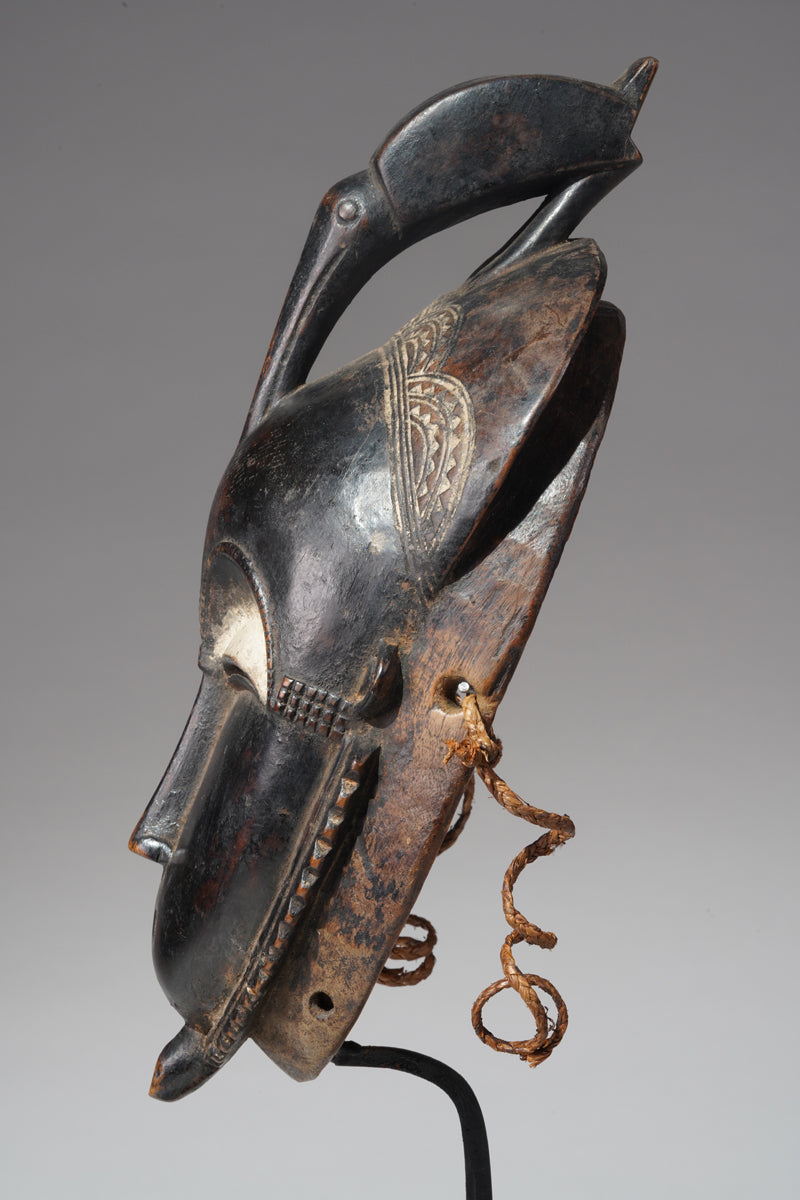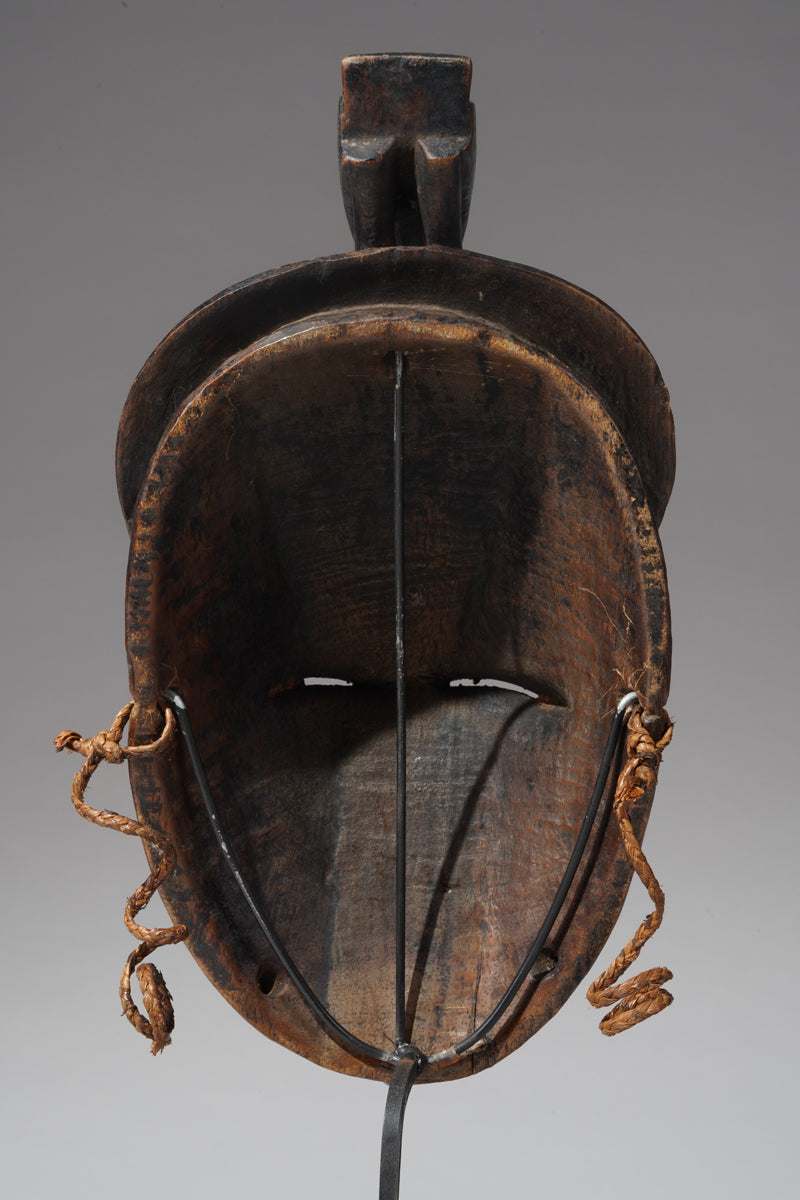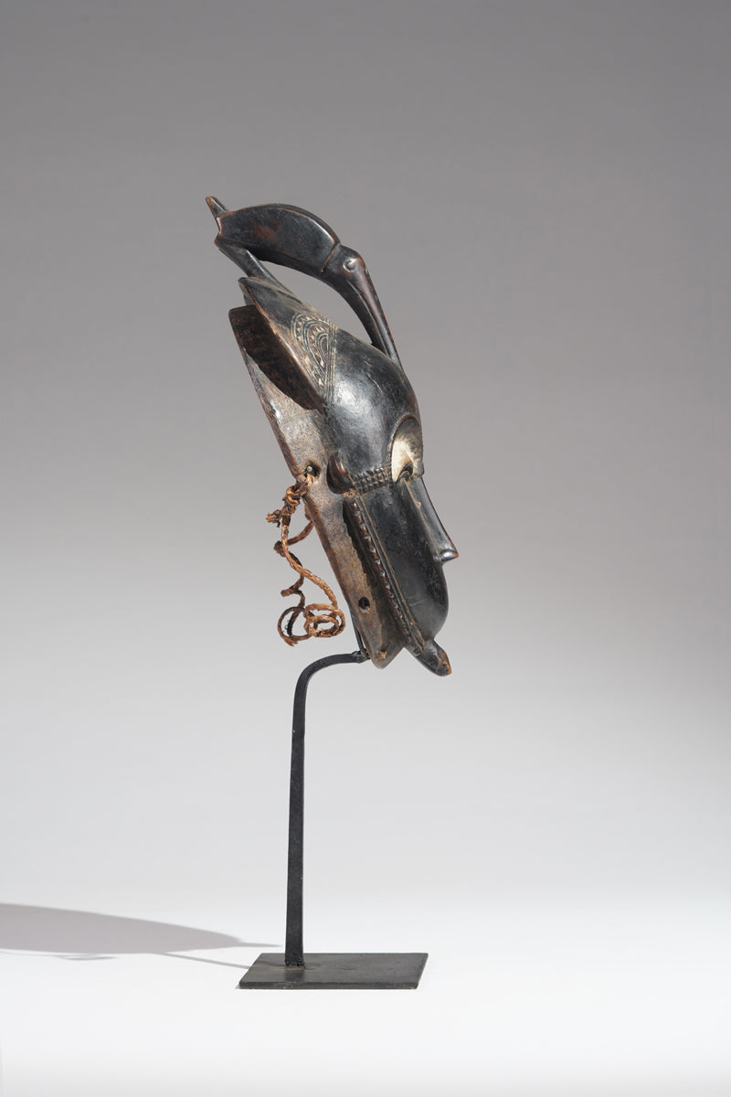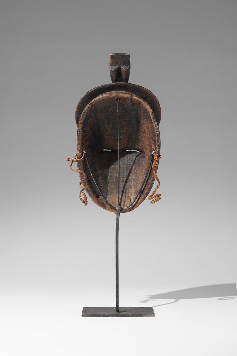 Characteristically, Yaure masks are oval-faced with delicately arched eyebrows, almond-shaped eyes, fine noses, and closed or slightly parted mouths, often conveying serenity and restraint. Many include elaborate coiffures or vertical elements above the head, which may symbolize birds or abstract spiritual entities. A distinctive trait of Yaure masks is the use of a central ridge running vertically down the face, and a refined interplay between black and reddish-brown tones, often polished to a soft sheen.