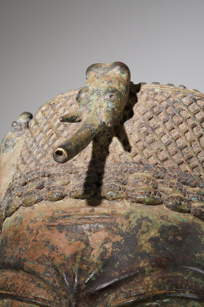 A Yoruba bronze mask collected in Ibadan, Nigeria, then fascial plane surmounted with an elephant head, oxidized, partly greenish patina, probably 18th century.