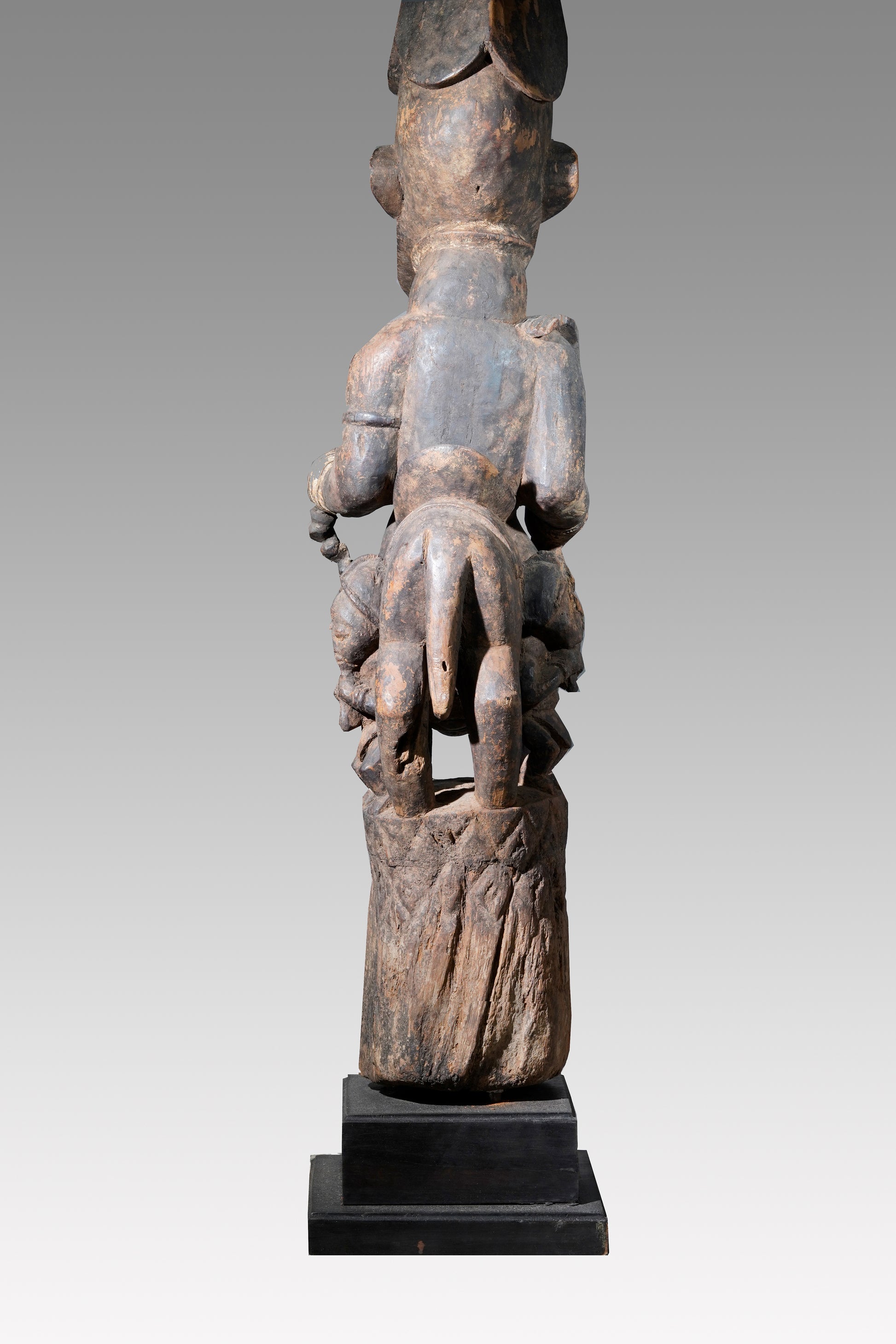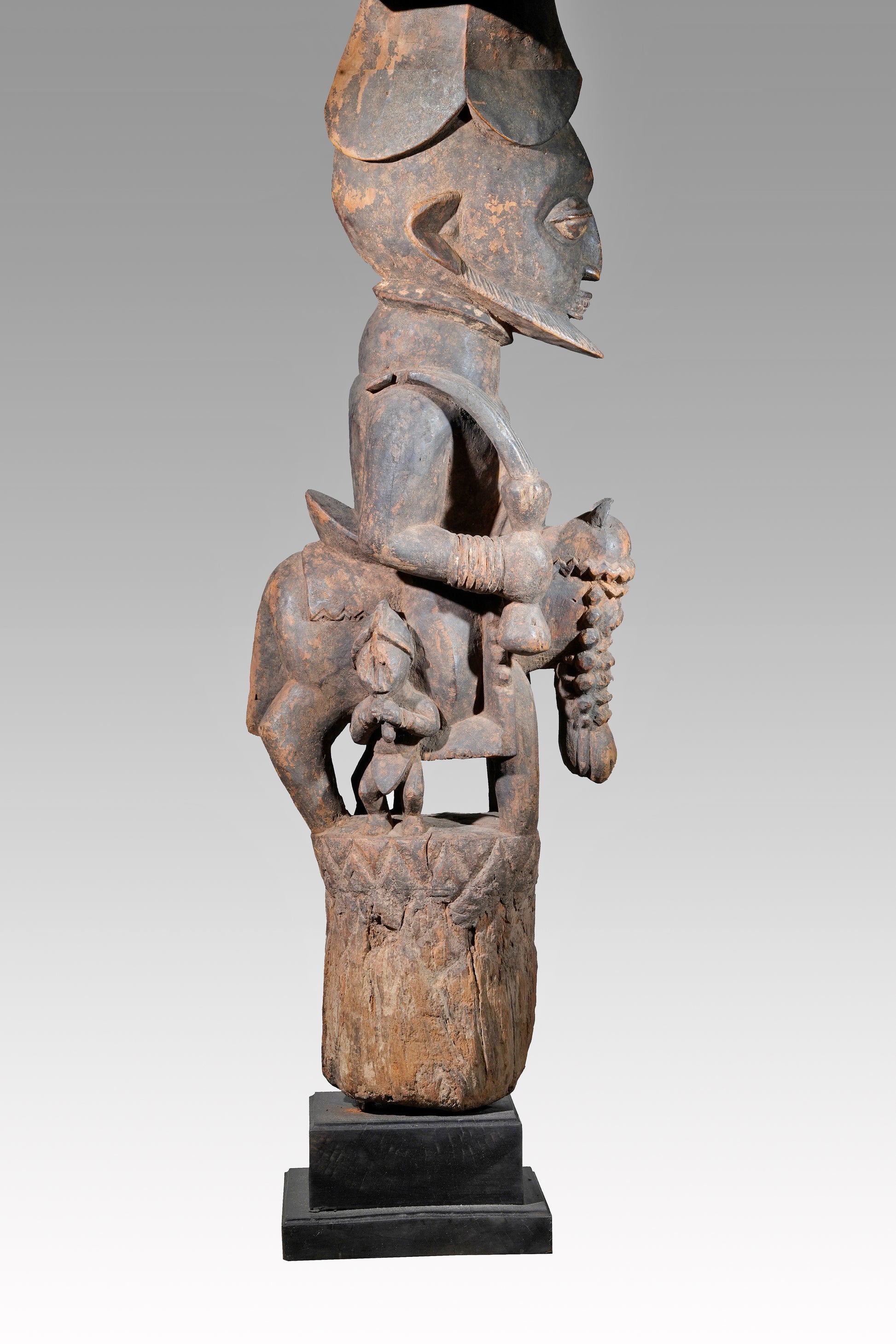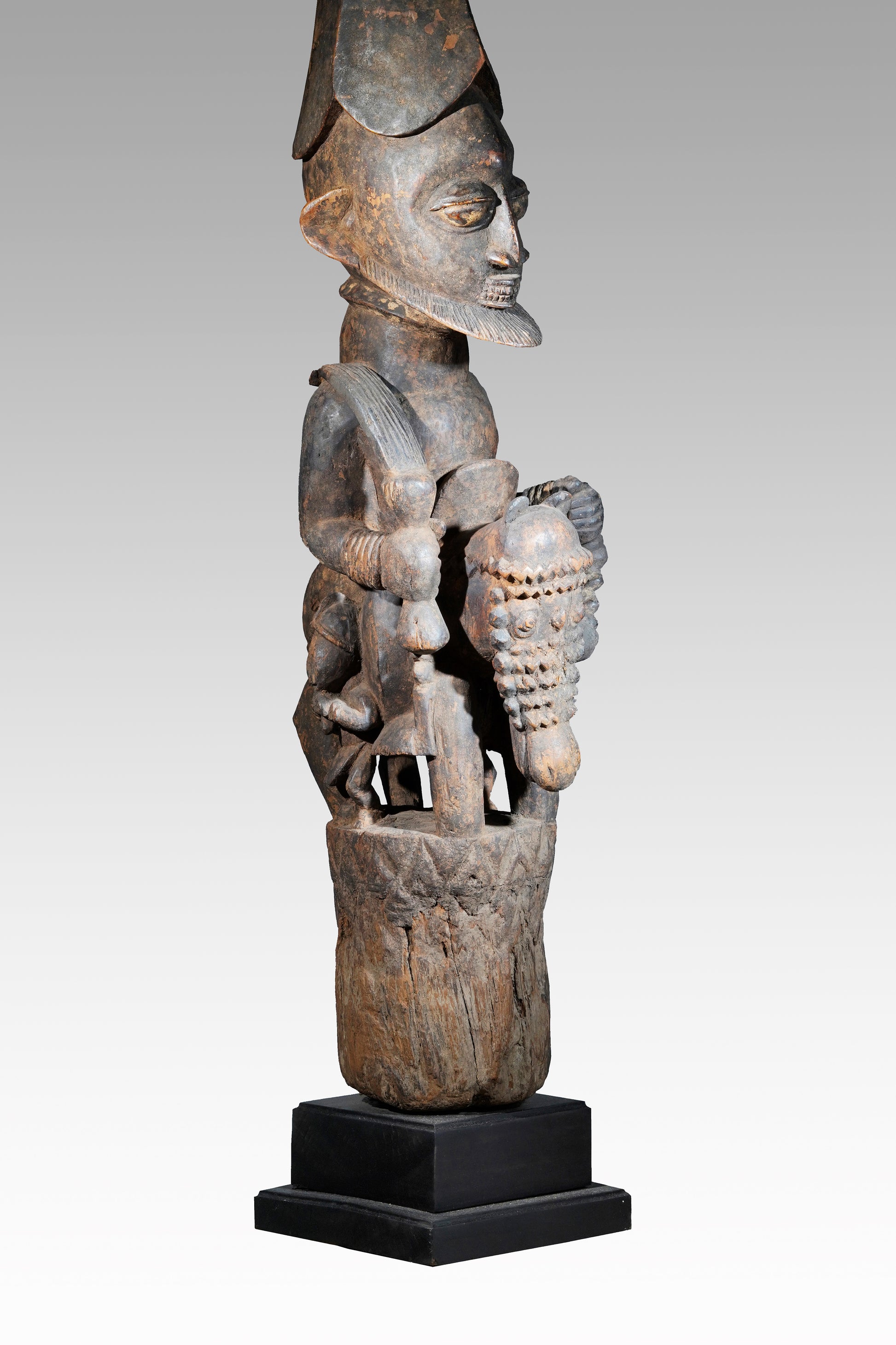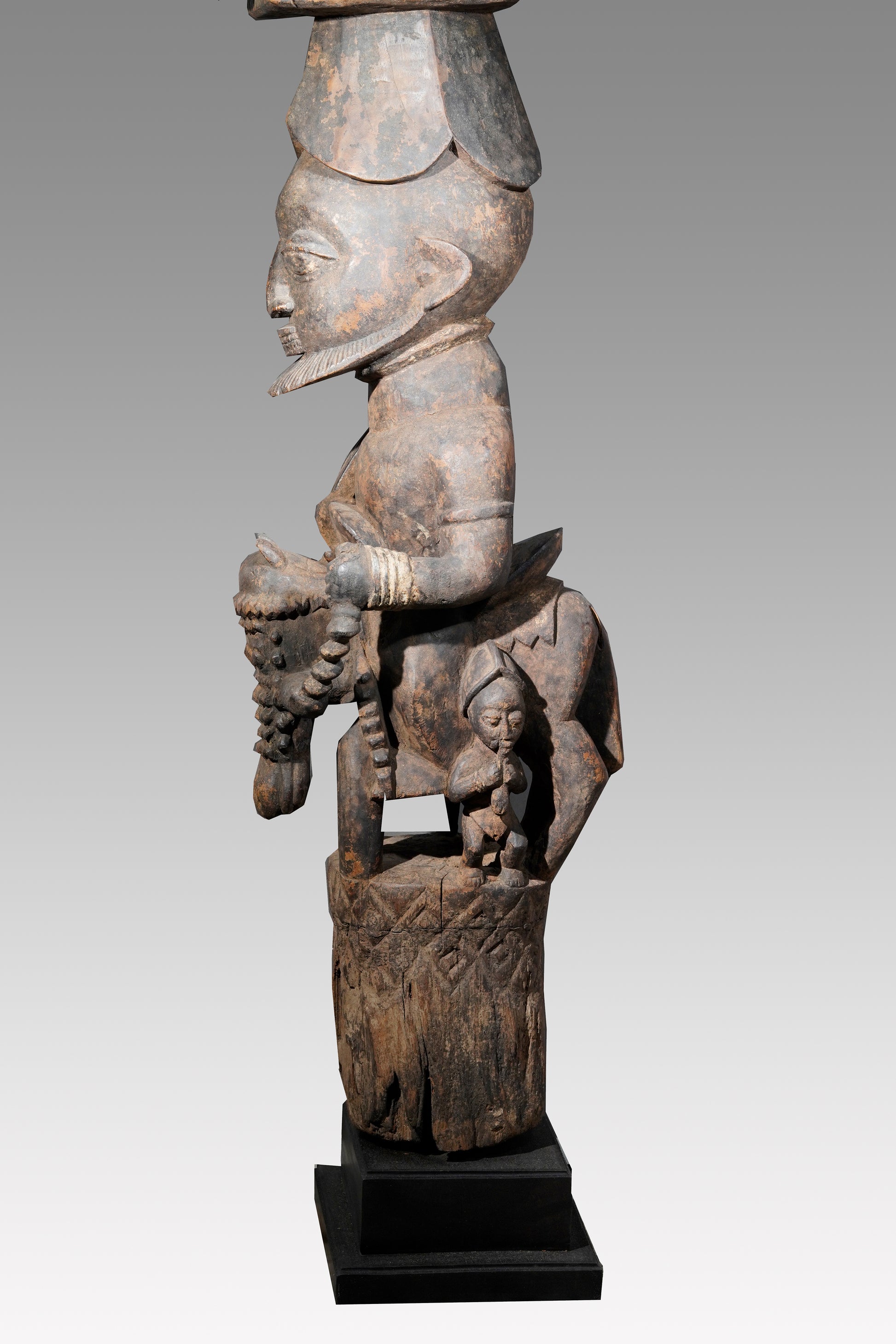 A Veranda post most likely by Agbonbiofe Adeshina (Efon-Alaye, c. 1880 - 1945). It seems to be an early work, we suggest a date well before 1912. The figures are not yet as "sharp-edged" as in his later work, the heads are still somewhat rounder and do not yet sit on the later gently curved neck. Everything seems a little squat, but Adeshina's very special expression is already clearly discernible. It is the curved hairline resp. head crest, the pursed lips, the horses' "knobbly" nose, their small ears, the beaded bridle. It is extremely unusual that the king was depicted twice on top of each other on a veranda post. This form of depiction is utterly unique. A truly special piece in a beautiful state of preservation.