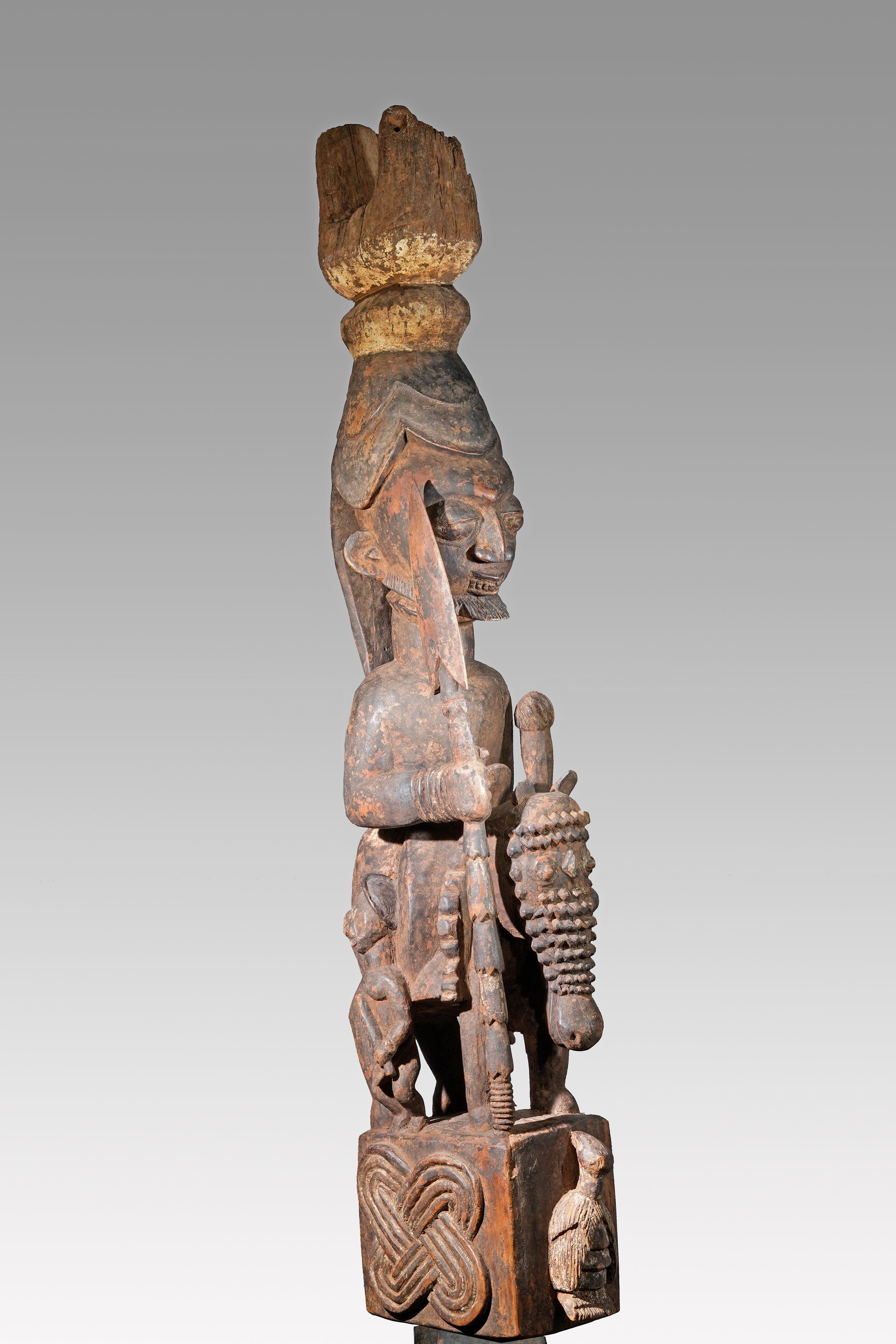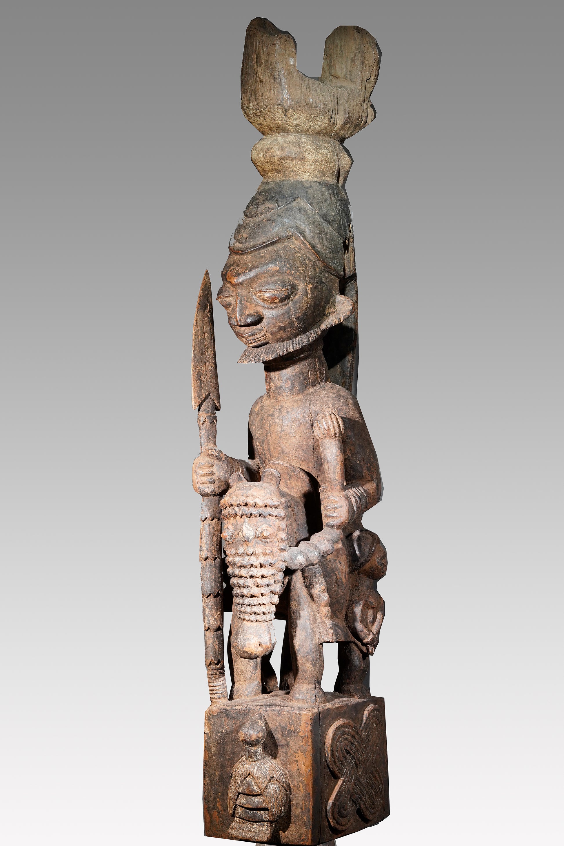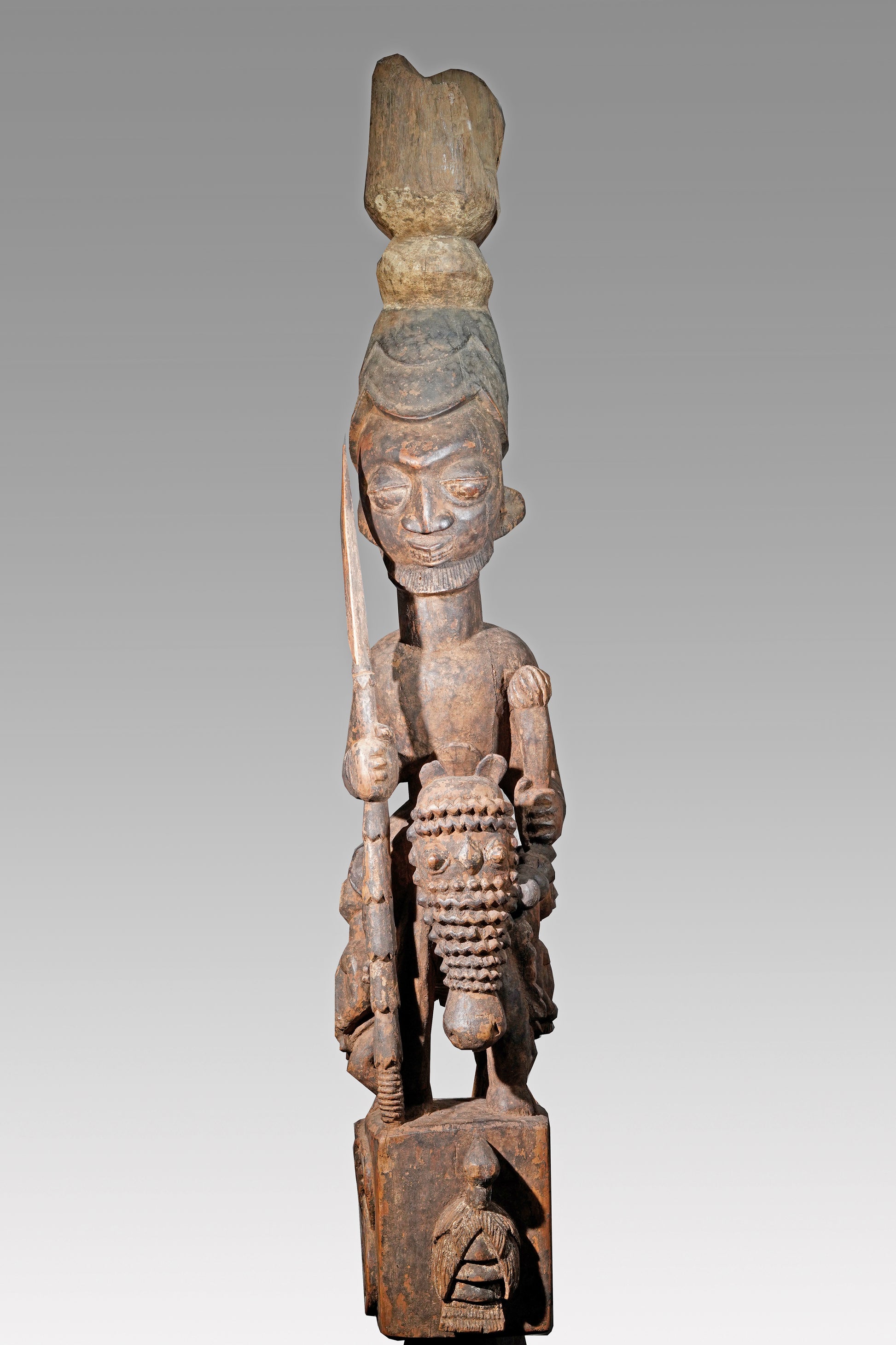 A Veranda post most likely by Agbonbiofe Adeshina (Efon-Alaye, c. 1880 - 1945). It seems to be an early work, we suggest a date well before 1912. The figures are not yet as "sharp-edged" as in his later work, the heads are still somewhat rounder and do not yet sit on the later gently curved neck. Everything seems a little squat, but Adeshina's very special expression is already clearly discernible. It is the curved hairline resp. head crest, the pursed lips, the horses' "knobbly" nose, their small ears, the beaded bridle. It is extremely unusual that the king was depicted twice on top of each other on a veranda post. This form of depiction is utterly unique. A truly special piece in a beautiful state of preservation.