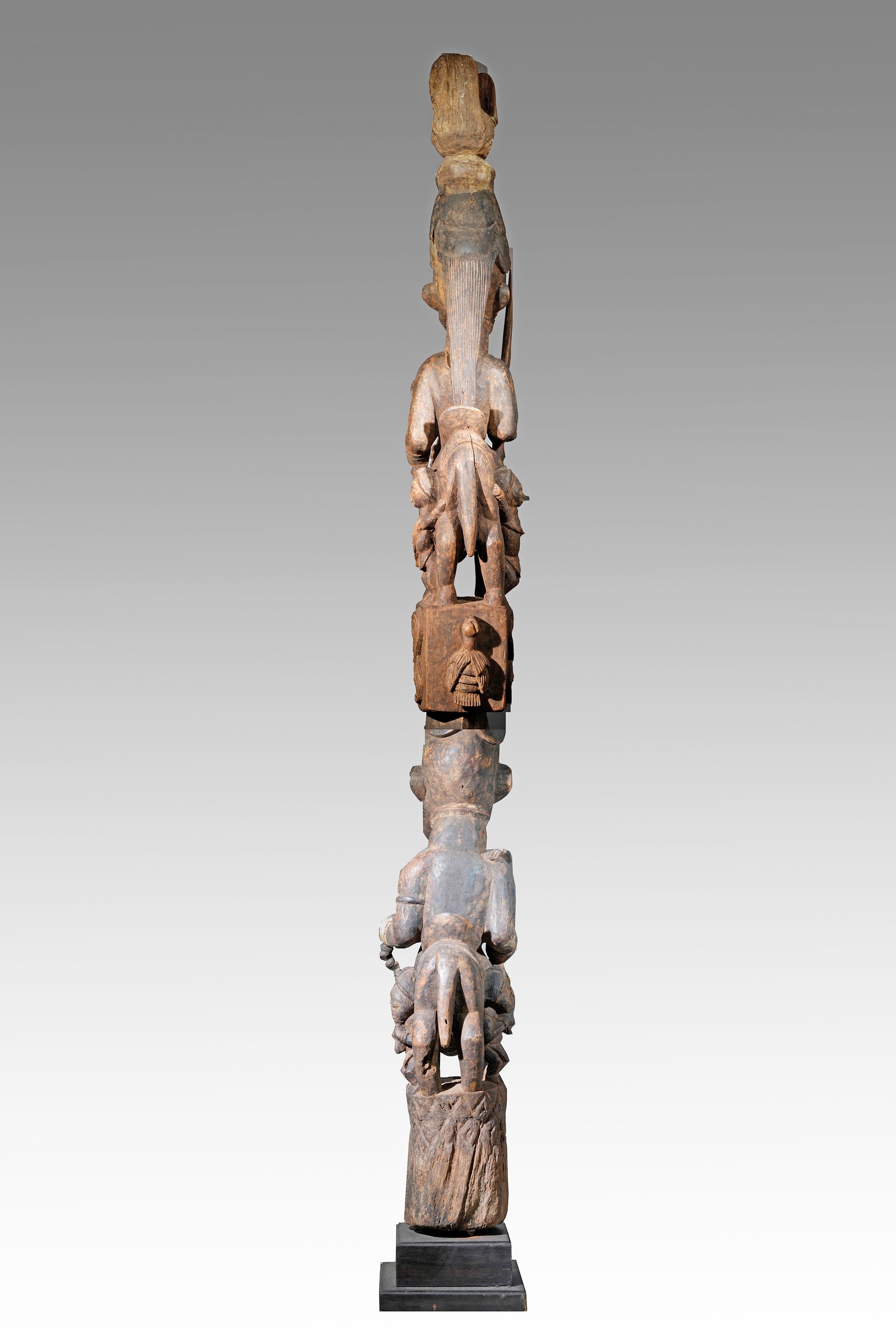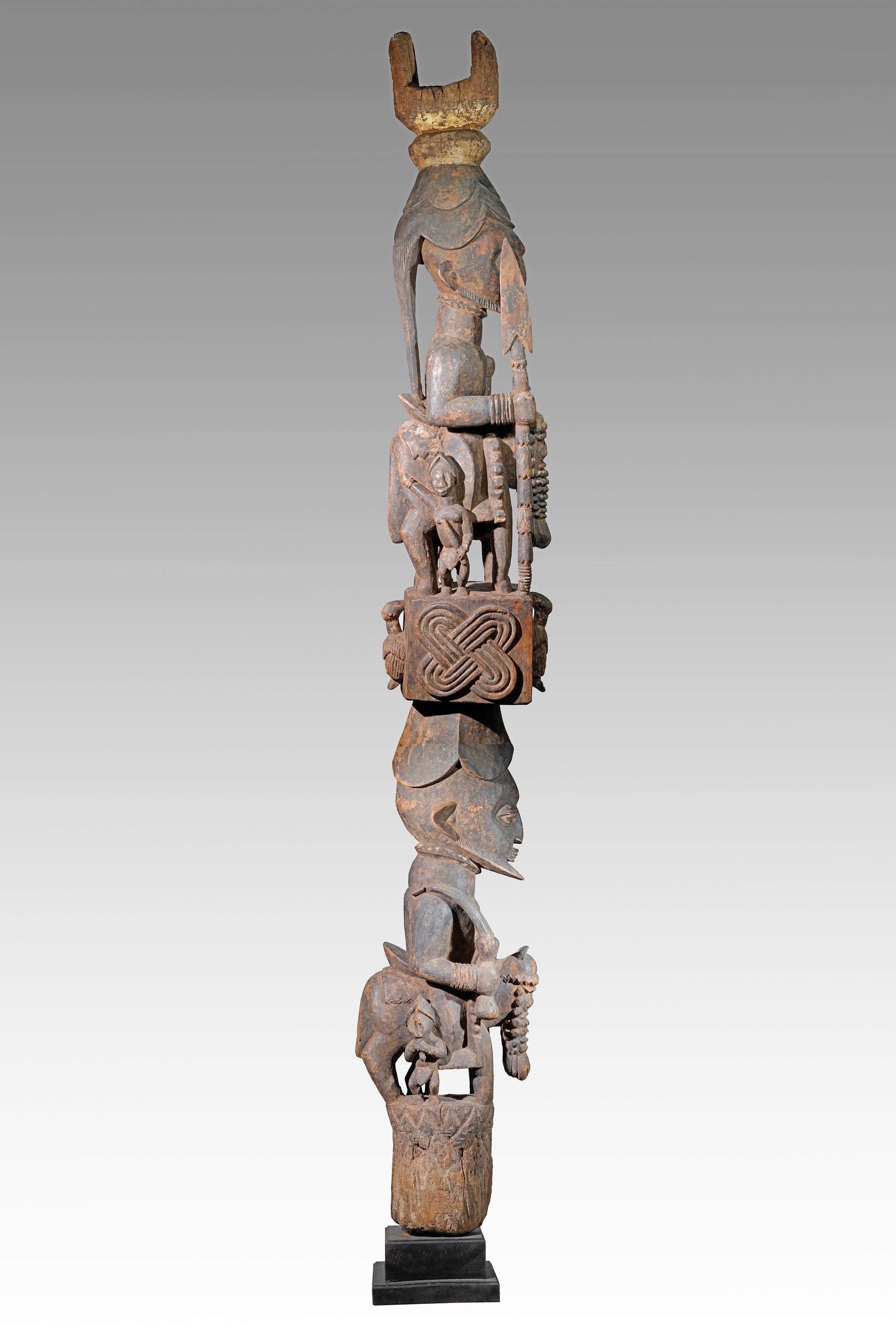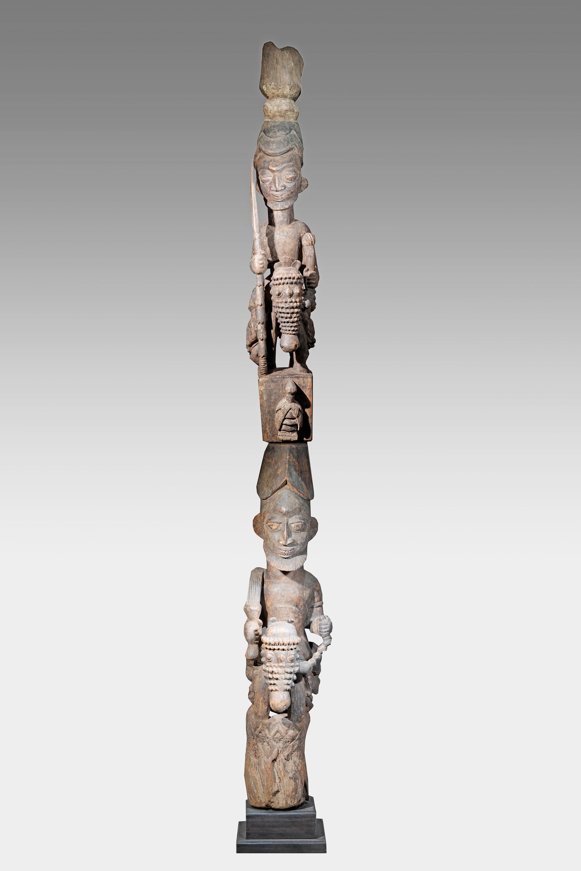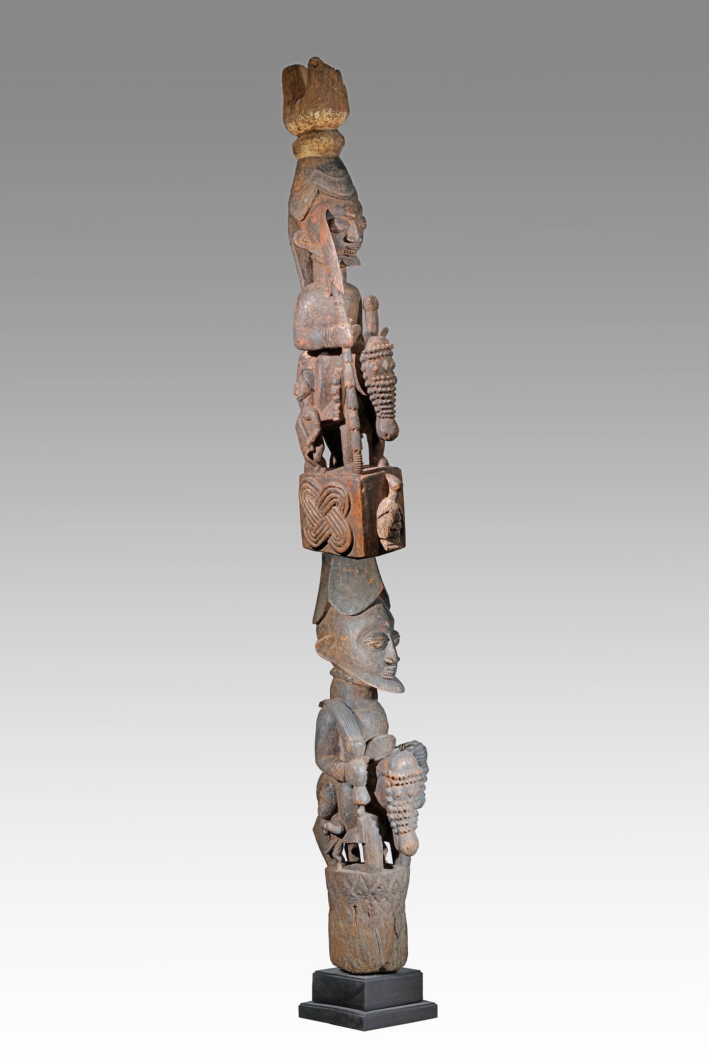 A Veranda post most likely by Agbonbiofe Adeshina (Efon-Alaye, c. 1880 - 1945). It seems to be an early work, we suggest a date well before 1912. The figures are not yet as "sharp-edged" as in his later work, the heads are still somewhat rounder and do not yet sit on the later gently curved neck. Everything seems a little squat, but Adeshina's very special expression is already clearly discernible. It is the curved hairline resp. head crest, the pursed lips, the horses' "knobbly" nose, their small ears, the beaded bridle. It is extremely unusual that the king was depicted twice on top of each other on a veranda post. This form of depiction is utterly unique. A truly special piece in a beautiful state of preservation.