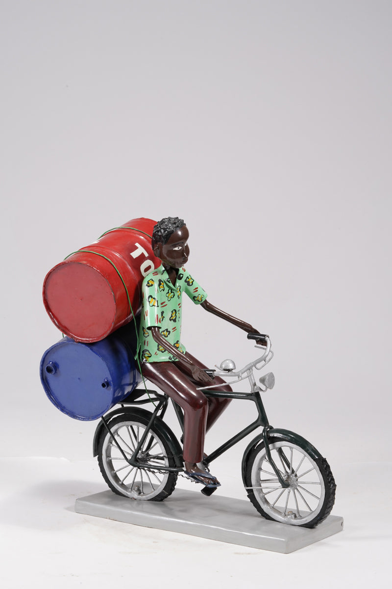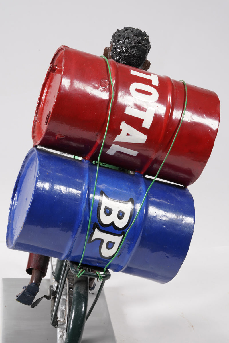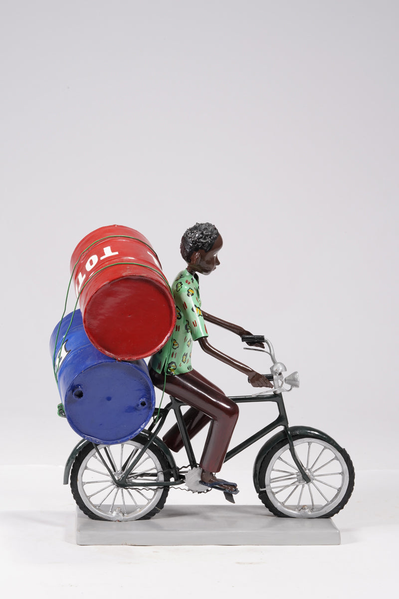 A young man on a bike trasporting petroleum barrels