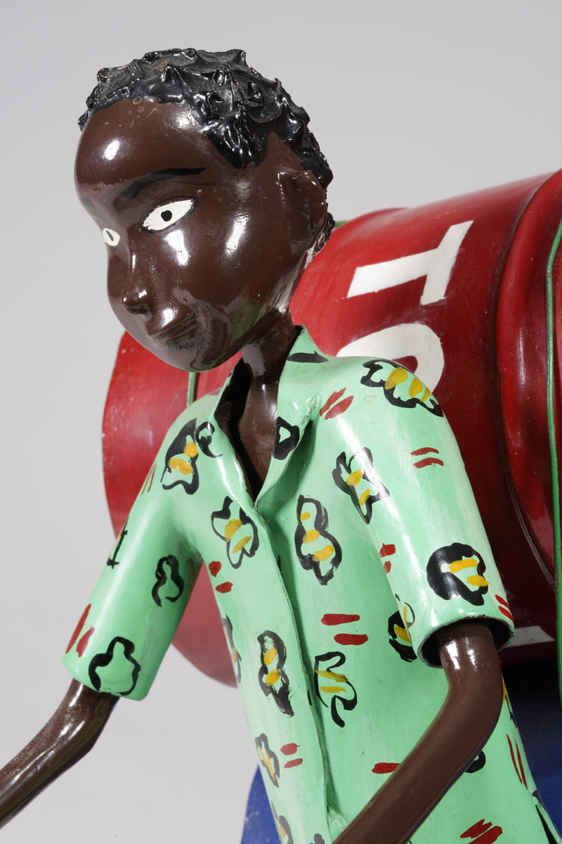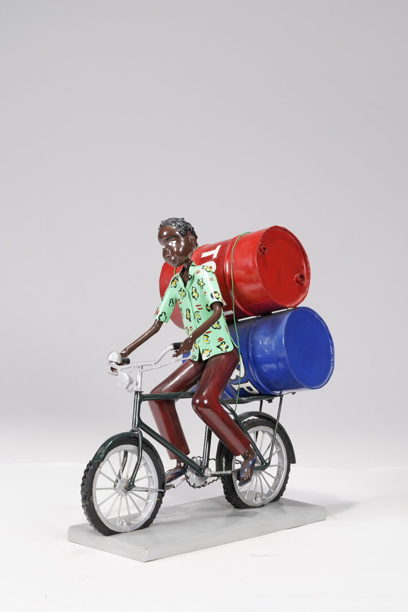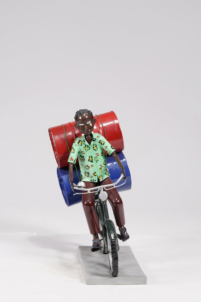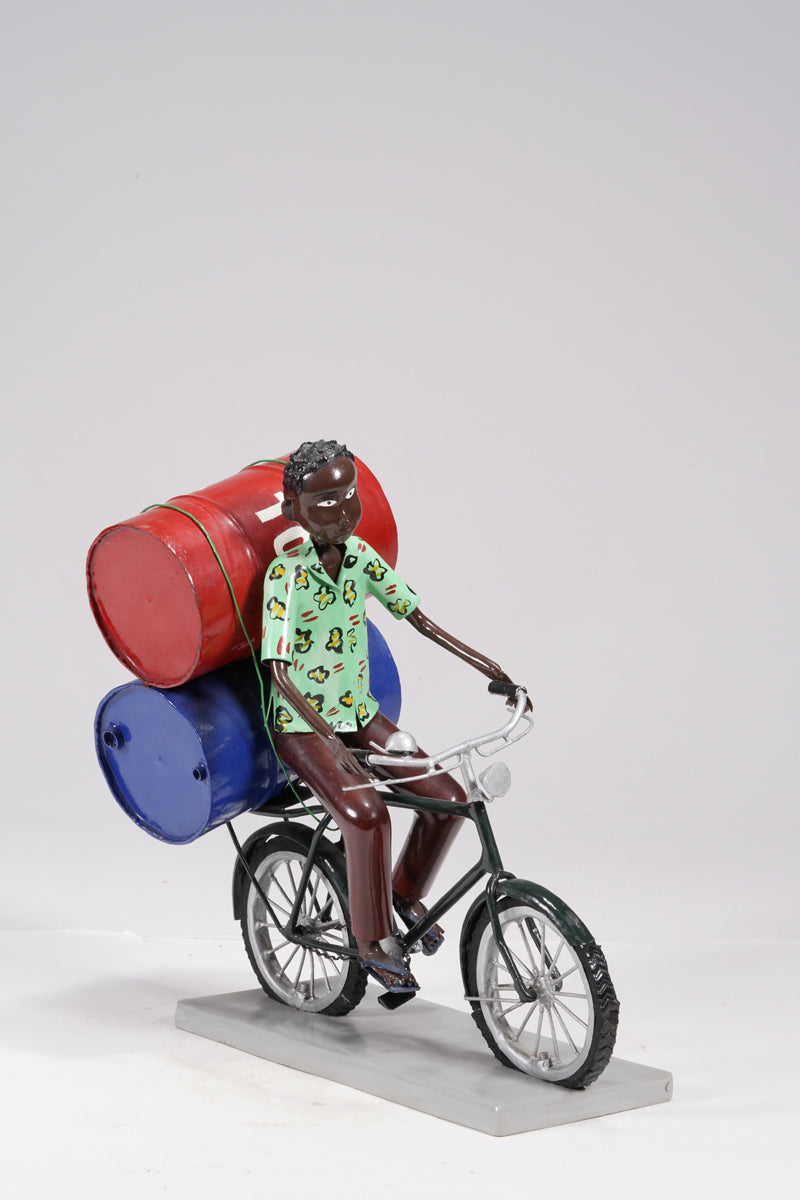 A young man on a bike trasporting petroleum barrels