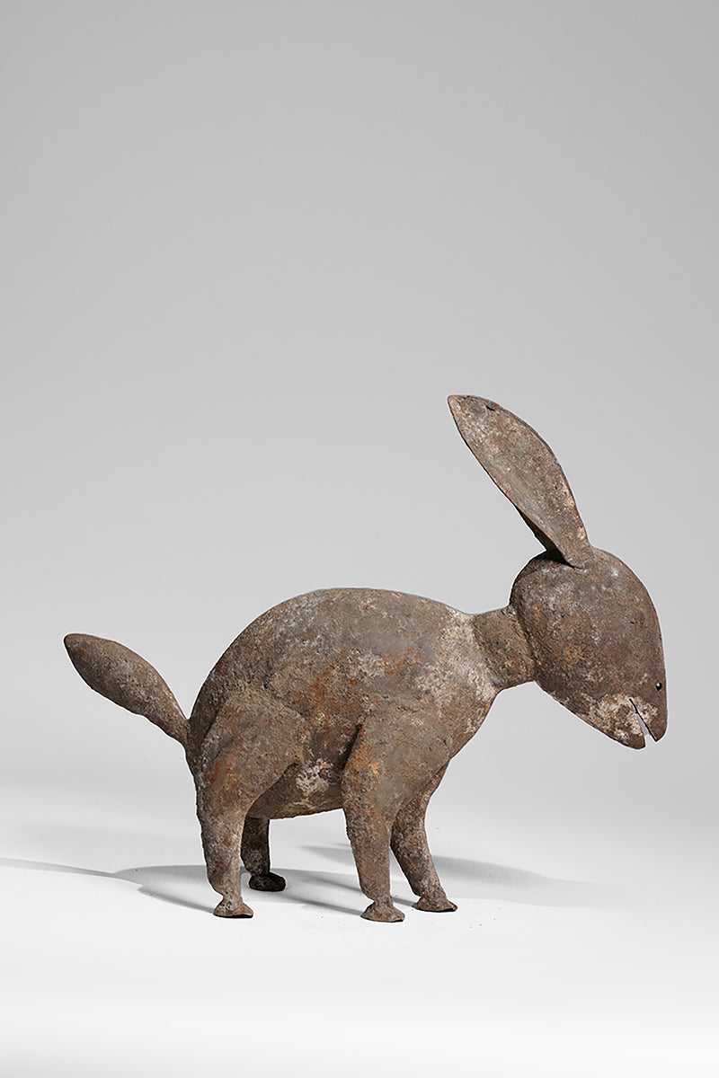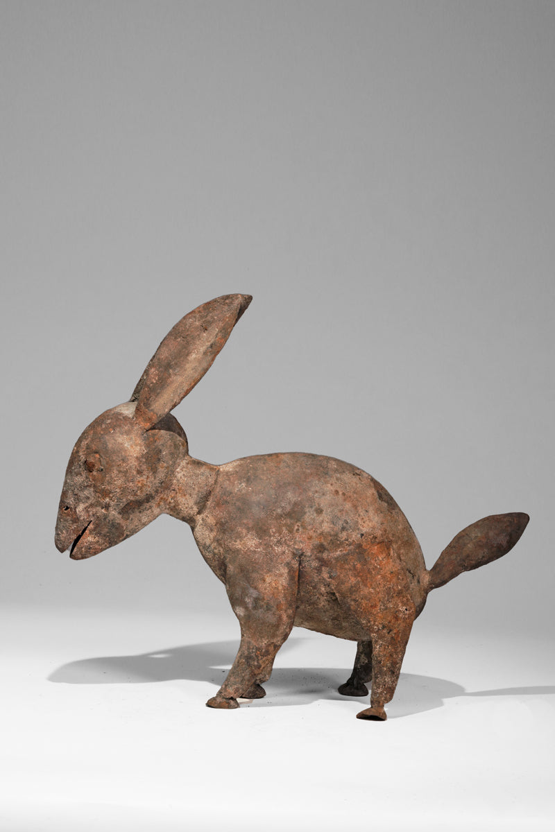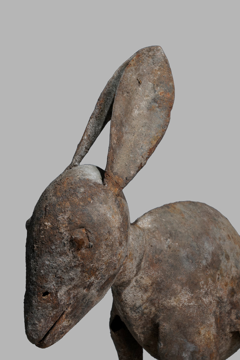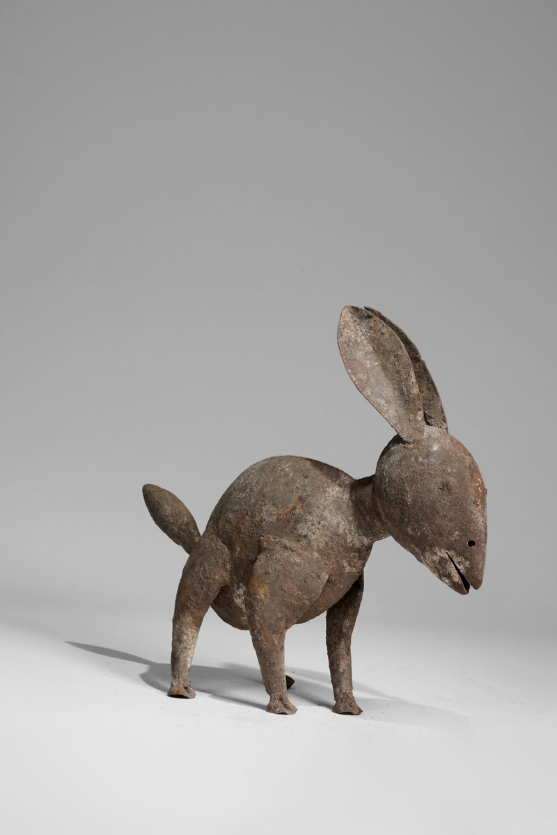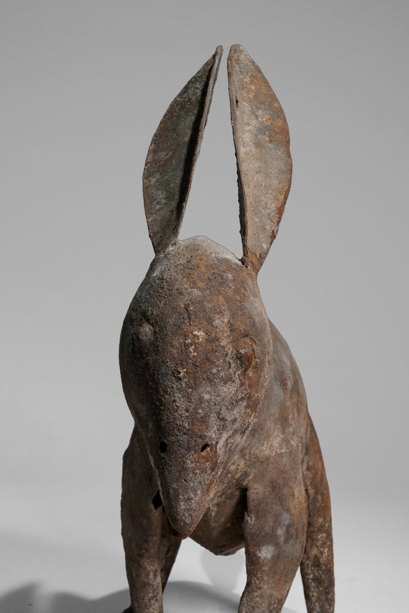 A zoomorphic Dogon bronze sculpture of a rabbit with interesting physiognomy such as the foot position and body posture signaling an inquisitive perseverance, with a rounded back and the large head slightly protruding, slightly open mouth, long ears, round beady eyes and pierced nostrils; encrusted age patina on the bronze surface.
