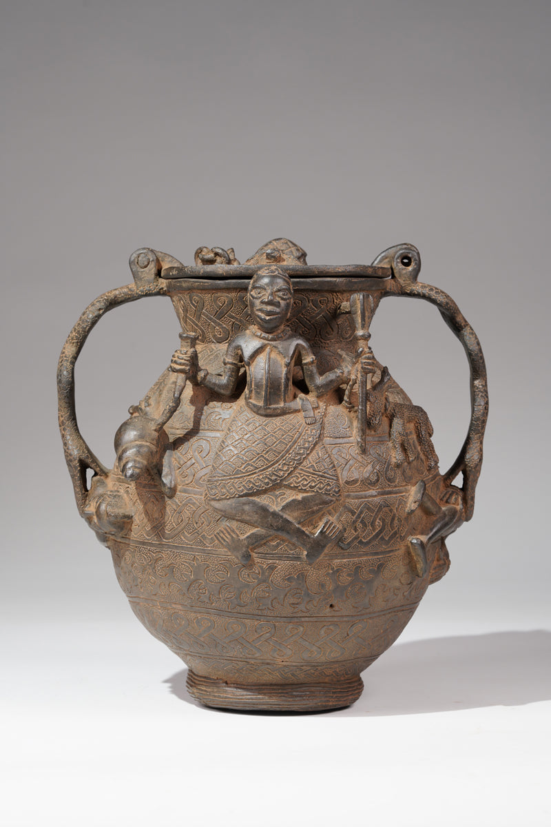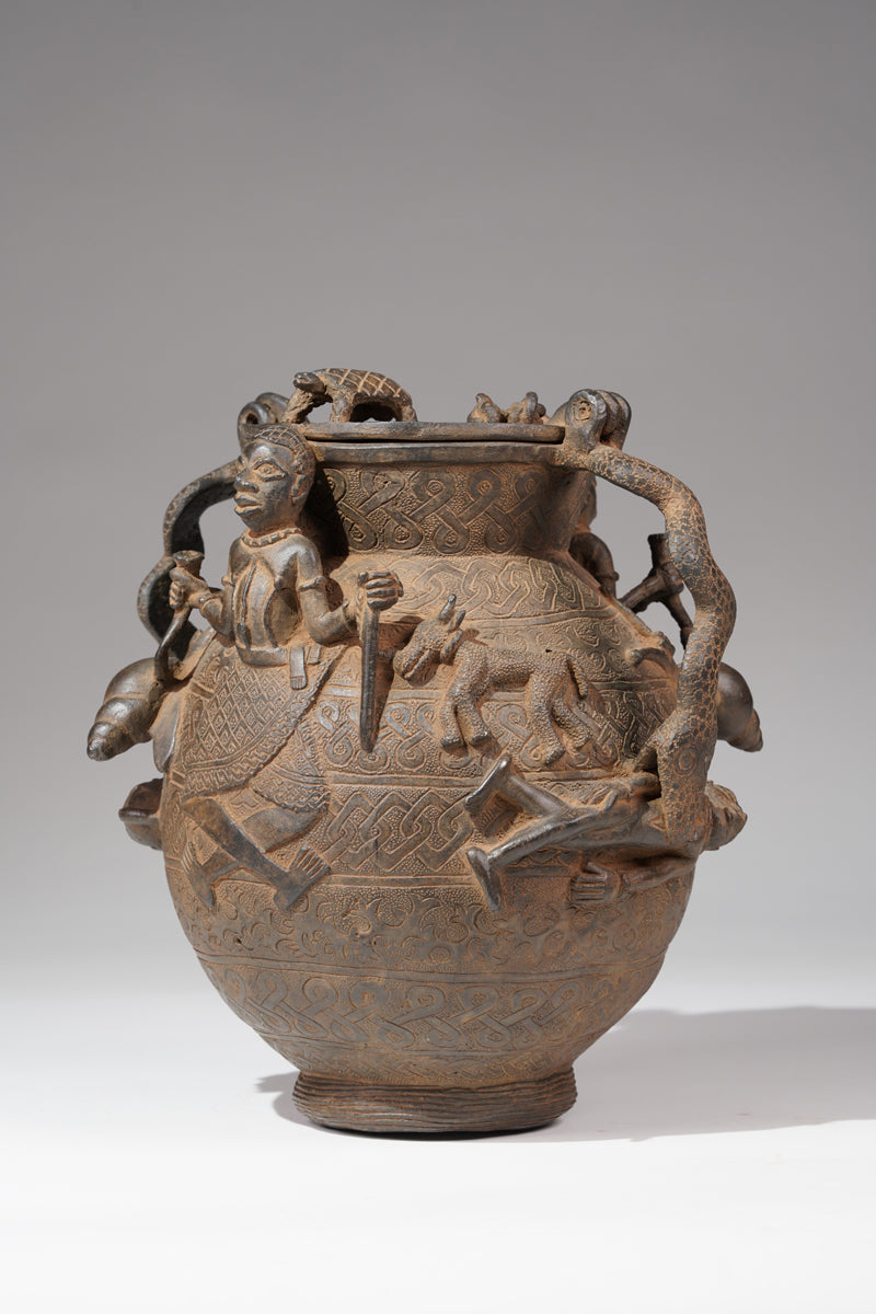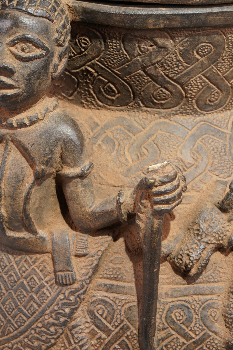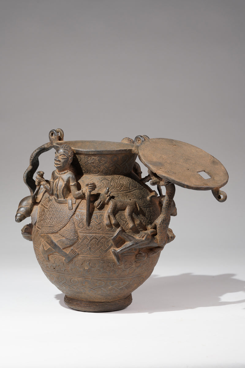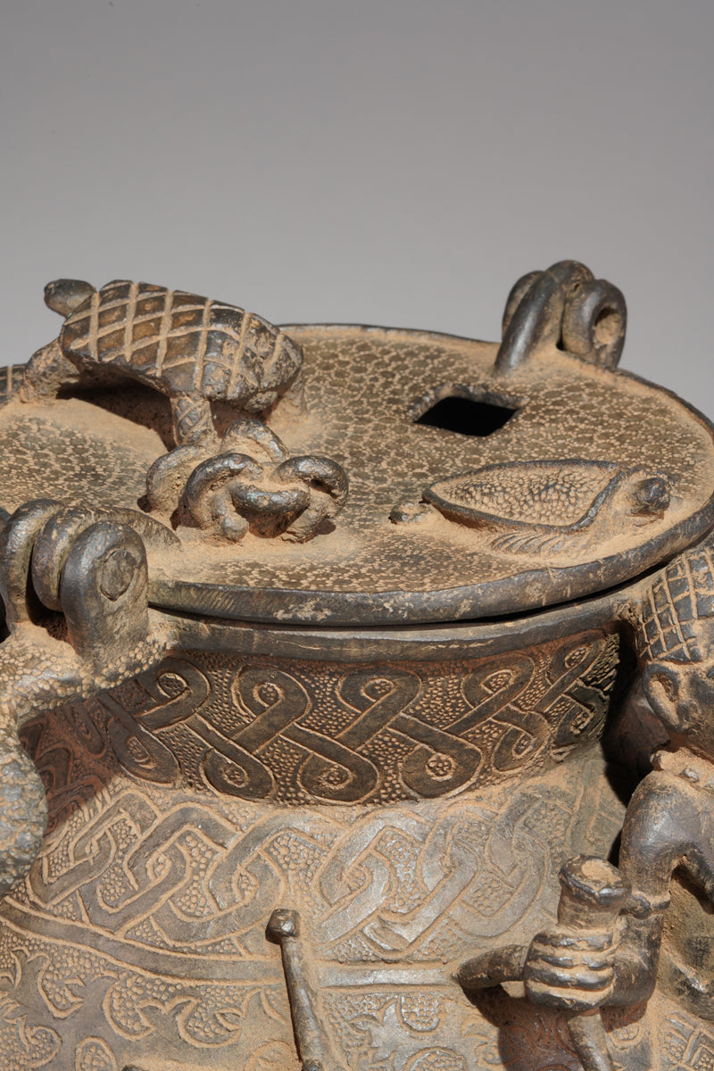An Akhẹ-Osun (Osun pot) in good condition, only the chain is missing. decorated with different figures and animals, the handles in shape of serpents, fetching the related men.