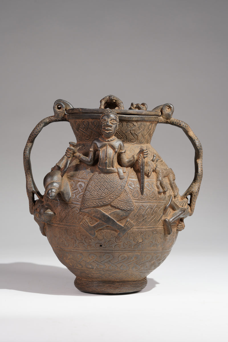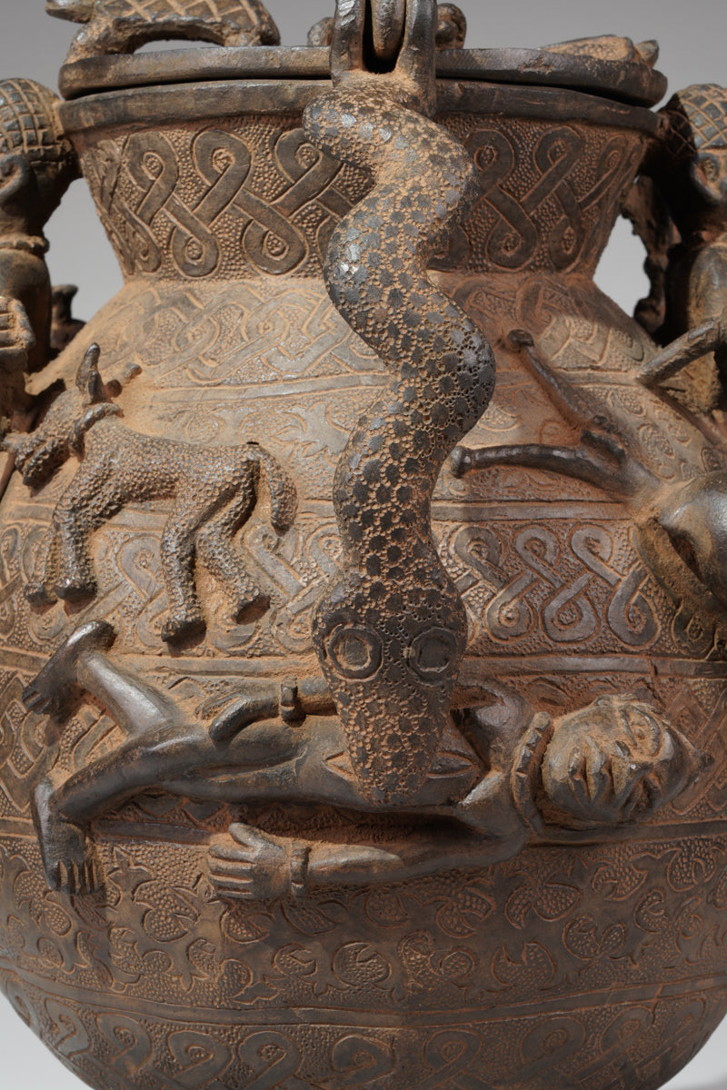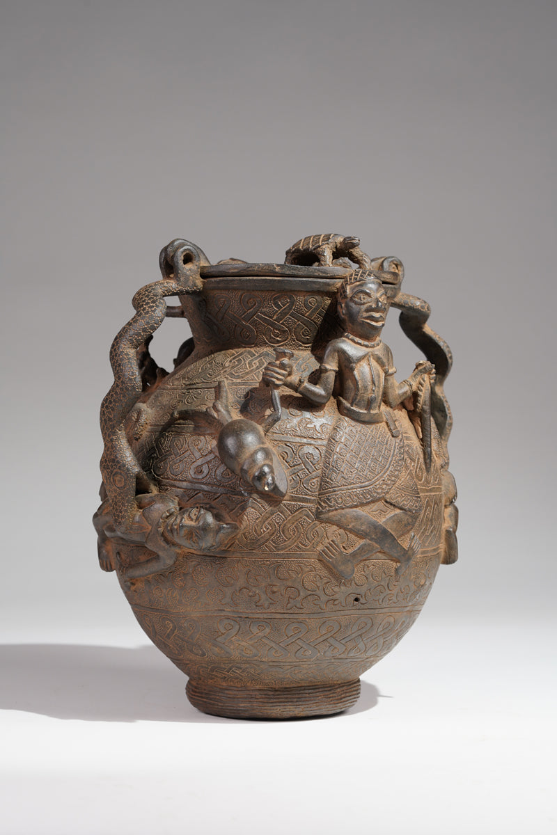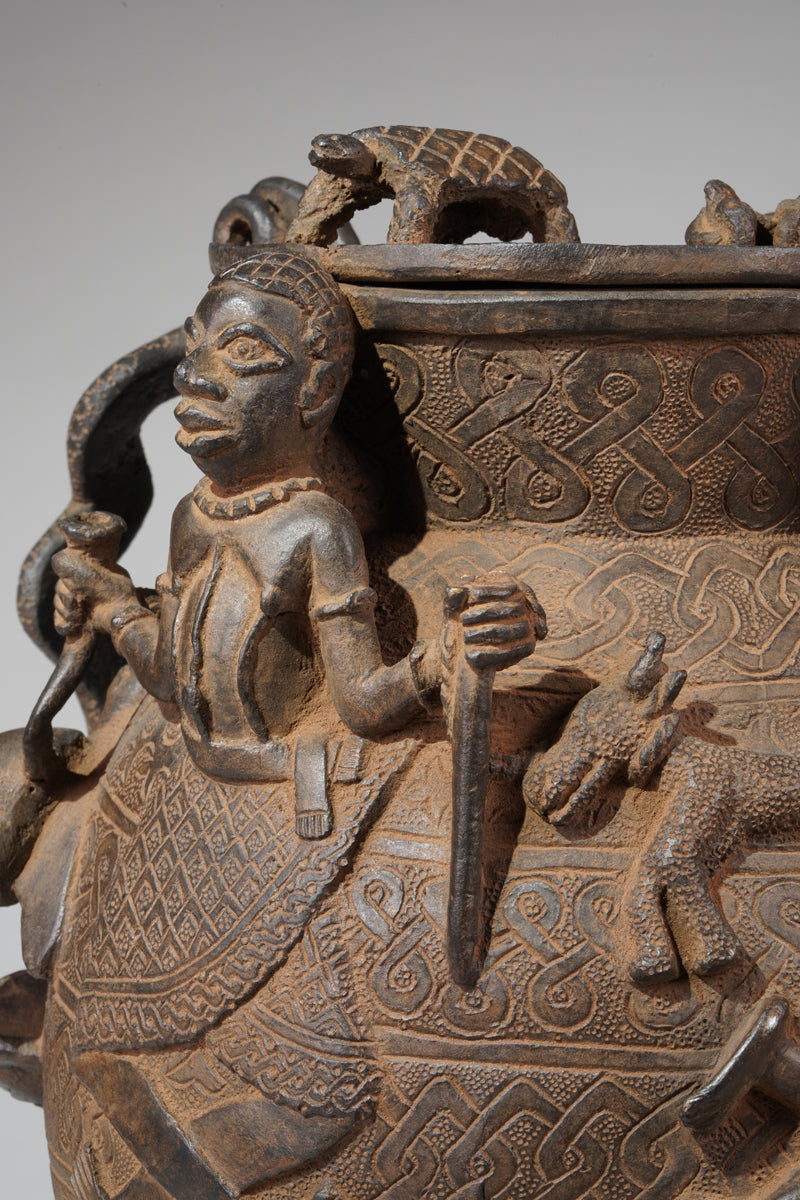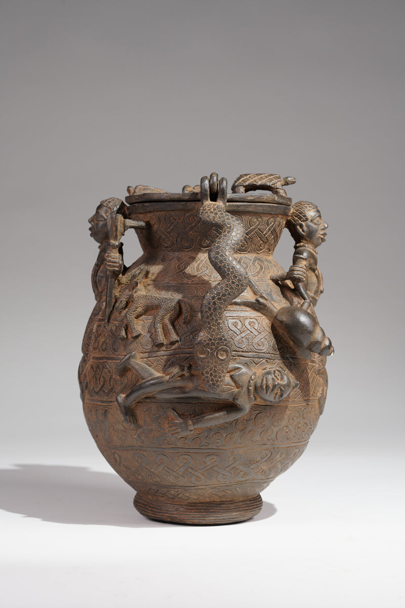 An Akhẹ-Osun (Osun pot) in good condition, only the chain is missing. decorated with different figures and animals, the handles in shape of serpents, fetching the related men.