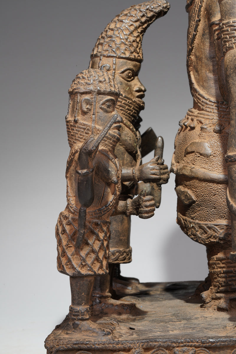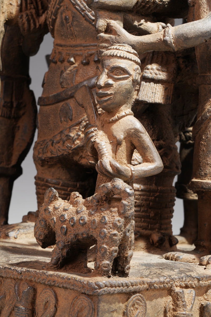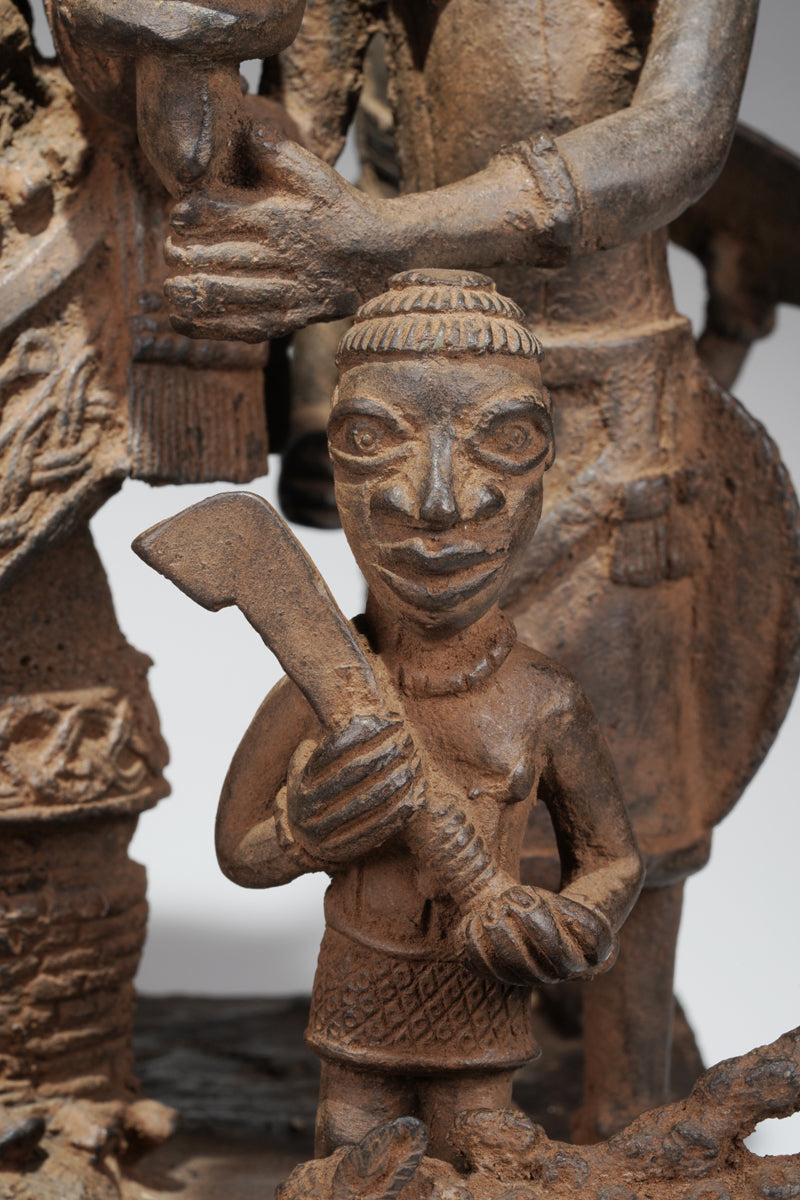 This altar group of King Ewuakpe is exemplary of the individualization of Benin's art. It was in the center of the memorial altar that Akenzua I erected for his father, and illustrates the eventful history of the king, his deposition, and reinstatement. Ewuakpe is not depicted with the full insignia of royal power - like Akenzua I in his altar group - but with a European-looking hat. However, he is wearing a large royal pearl and a high collar. The two accompanying figures are unadorned; they are interpreted as the two slaves with whom, according to oral tradition, he left the palace alone after he was deposed. The pestle in his right hand, decorated with powerful symbols, refers to the peaceful reconciliation of the reinstated king with the warriors and city lordss.