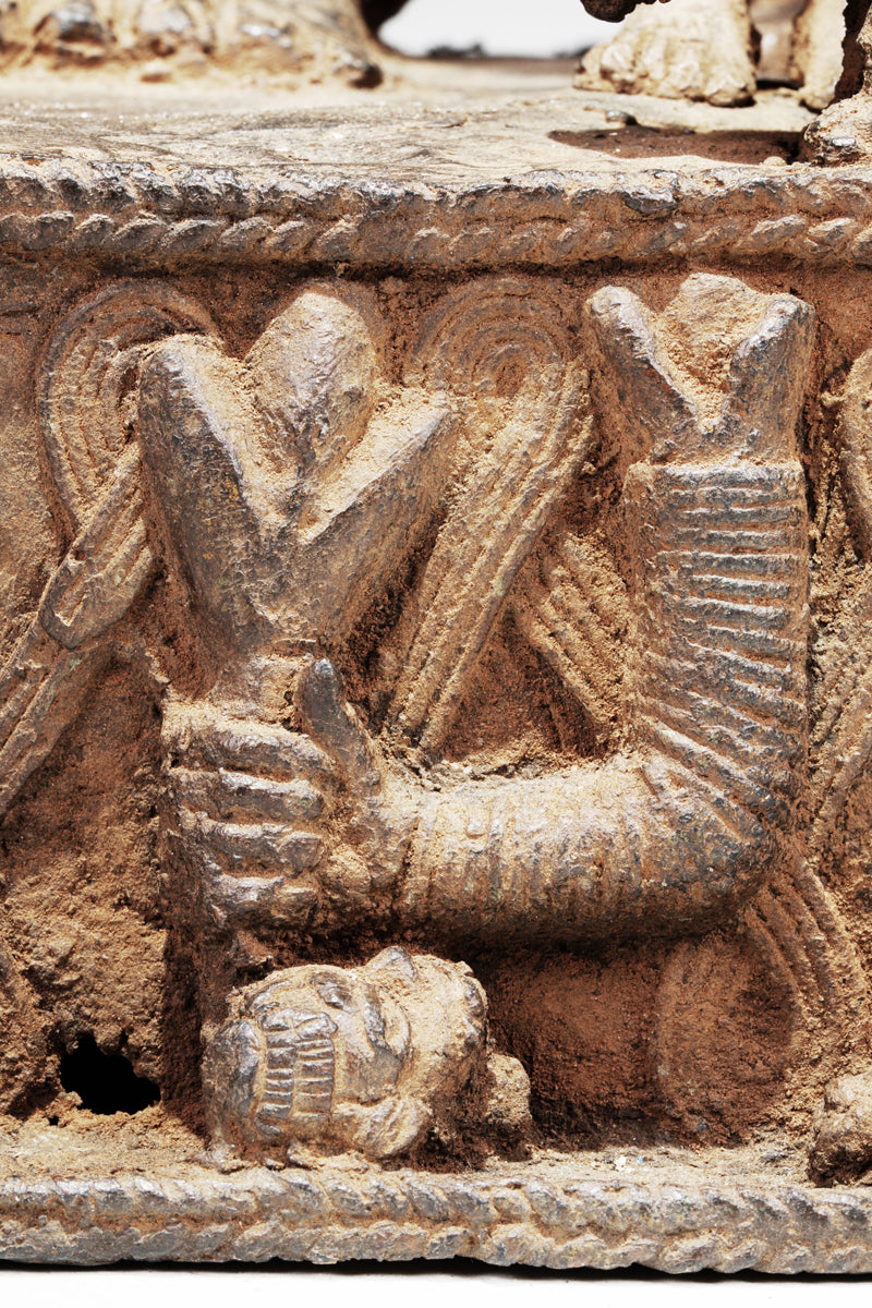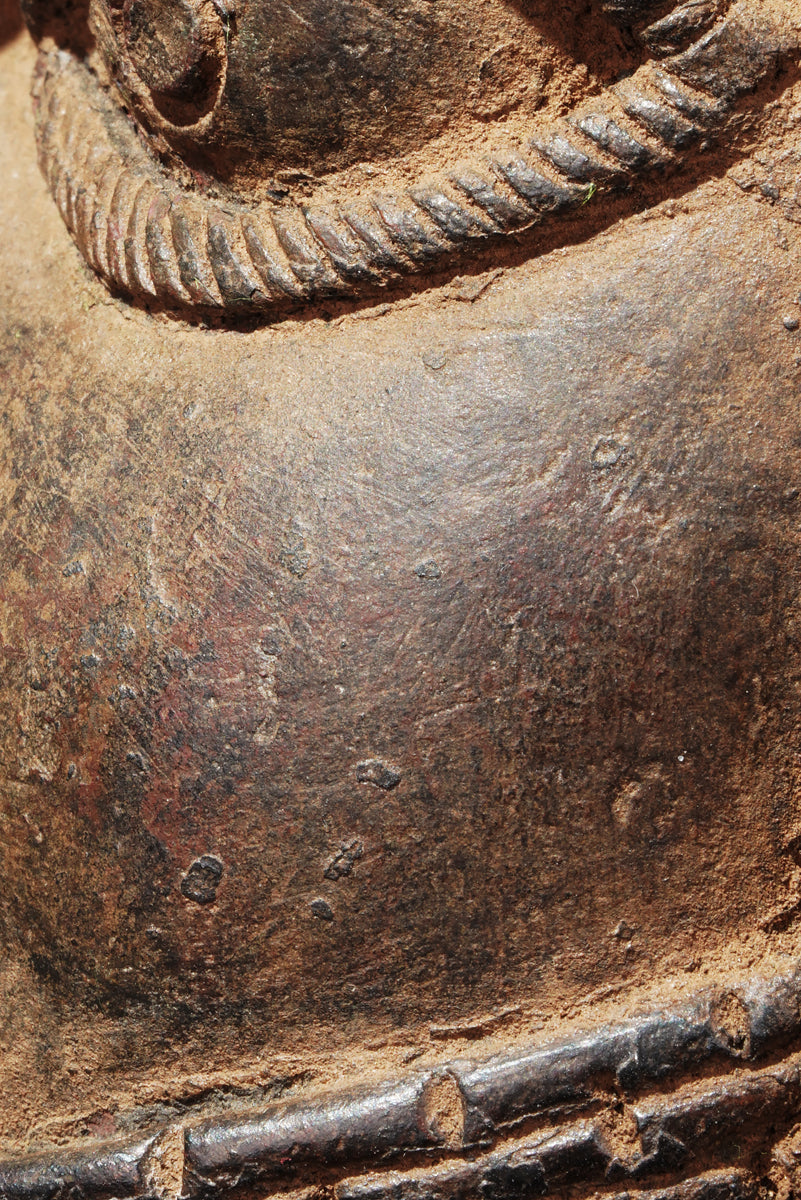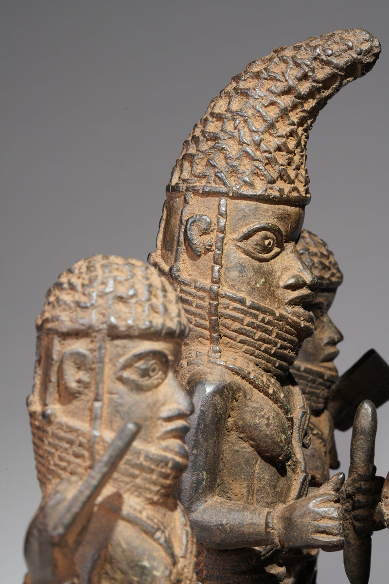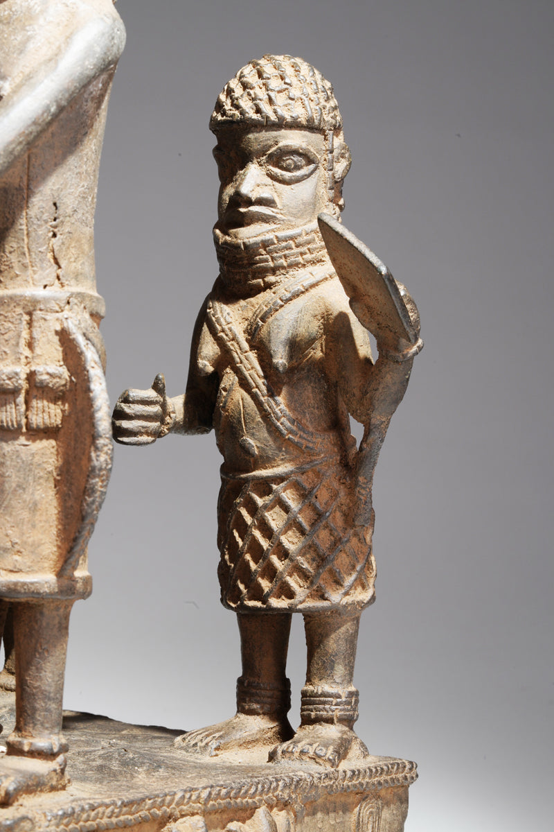This altar group of King Ewuakpe is exemplary of the individualization of Benin's art. It was in the center of the memorial altar that Akenzua I erected for his father, and illustrates the eventful history of the king, his deposition, and reinstatement. Ewuakpe is not depicted with the full insignia of royal power - like Akenzua I in his altar group - but with a European-looking hat. However, he is wearing a large royal pearl and a high collar. The two accompanying figures are unadorned; they are interpreted as the two slaves with whom, according to oral tradition, he left the palace alone after he was deposed. The pestle in his right hand, decorated with powerful symbols, refers to the peaceful reconciliation of the reinstated king with the warriors and city lordss.