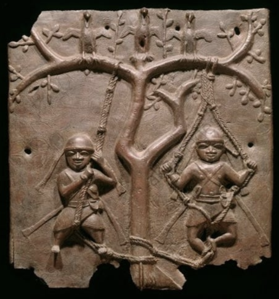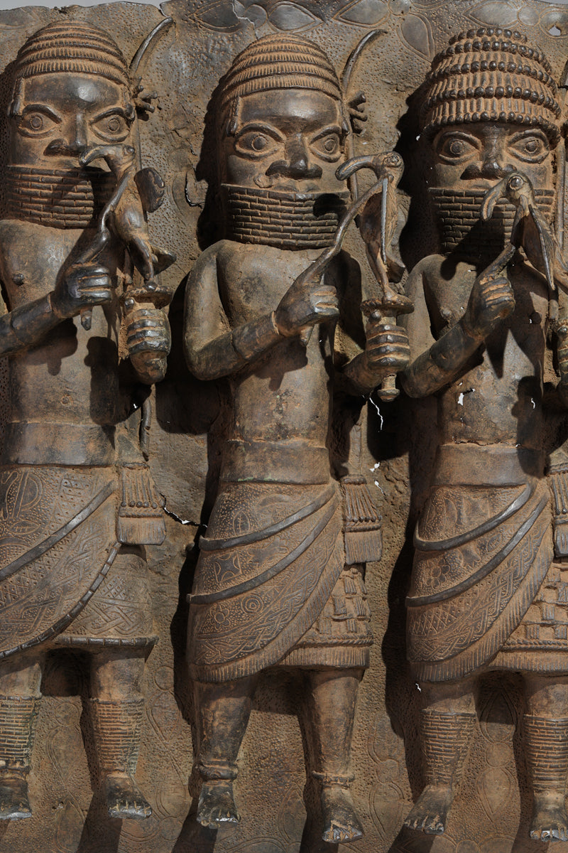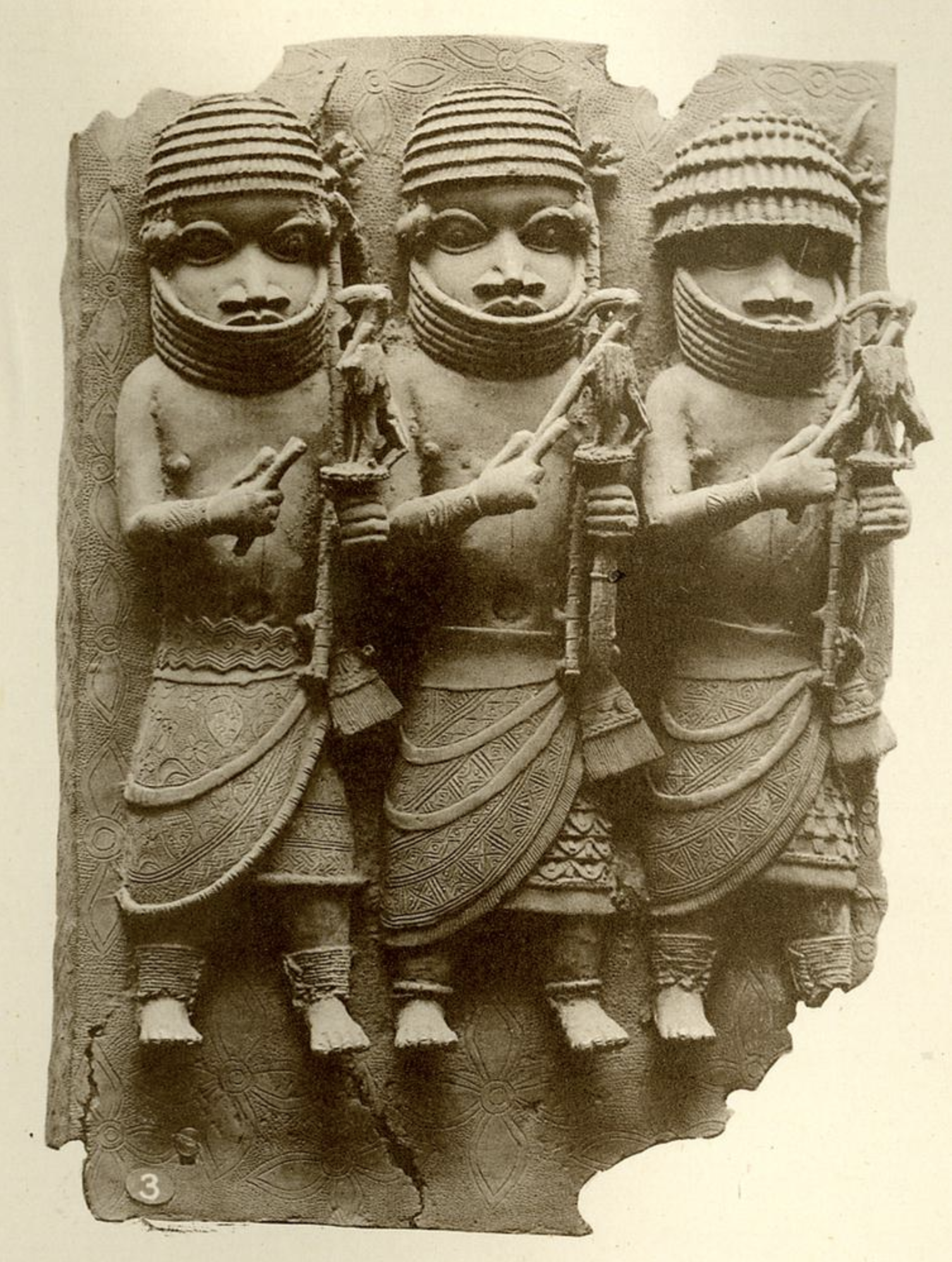 In the corpus of court art from the Benin City kingdom (present‑day Nigeria) one finds a notable relief plaque described in the collection of the British Museum as having three standing courtiers, facing front, each holding a “bird of prophecy idiophone” in their left hand and a striker in their right.