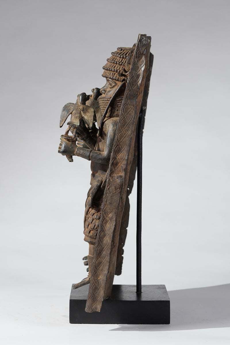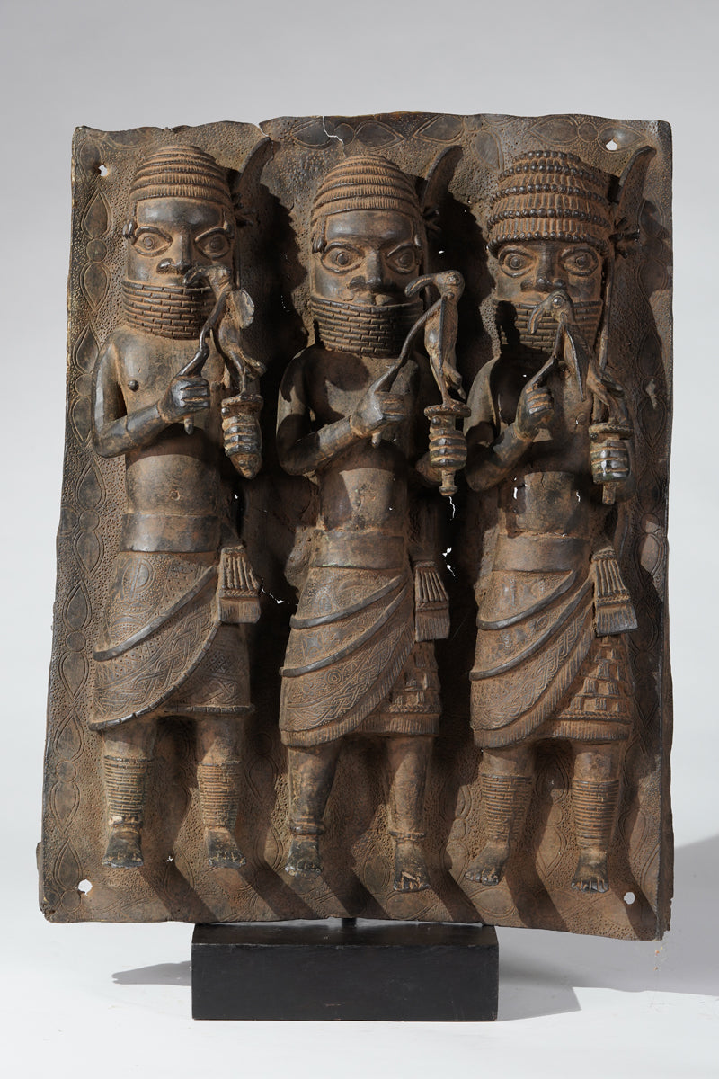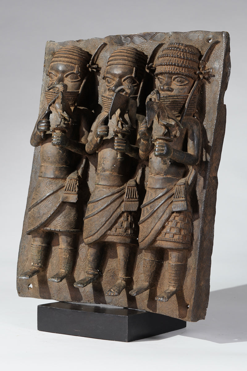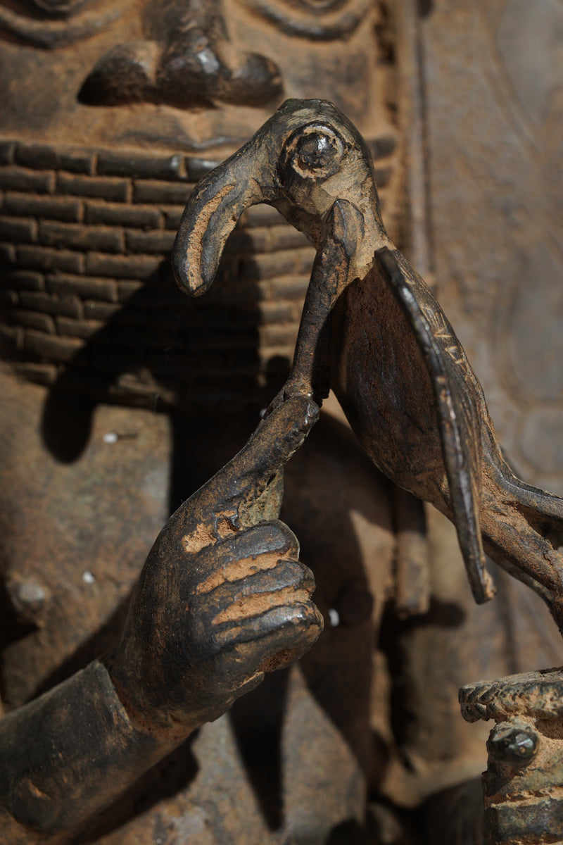 The plate you describe (“three high‑ranking personalities with eagles in their hands”) aligns well with this form, though I note some distinctions: the bird in the published example is more often called a “bird of prophecy idiophone” rather than a literal eagle, which suggests a symbolic function rather than strict zoological representation. The motif is connected with a key event in Benin’s history: according to tradition, during the early sixteenth‑century reign of Oba Esigie a bird cried a portent of disaster, the Oba had it killed, turned victory into ritual, and the bird symbol became cast in bronze for the annual Ugie Oro ceremony.