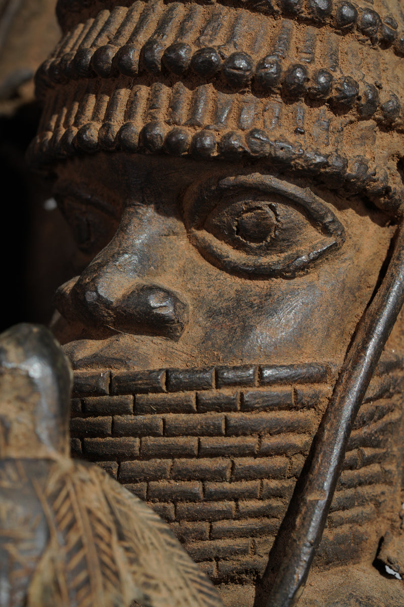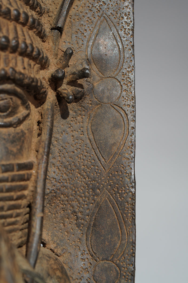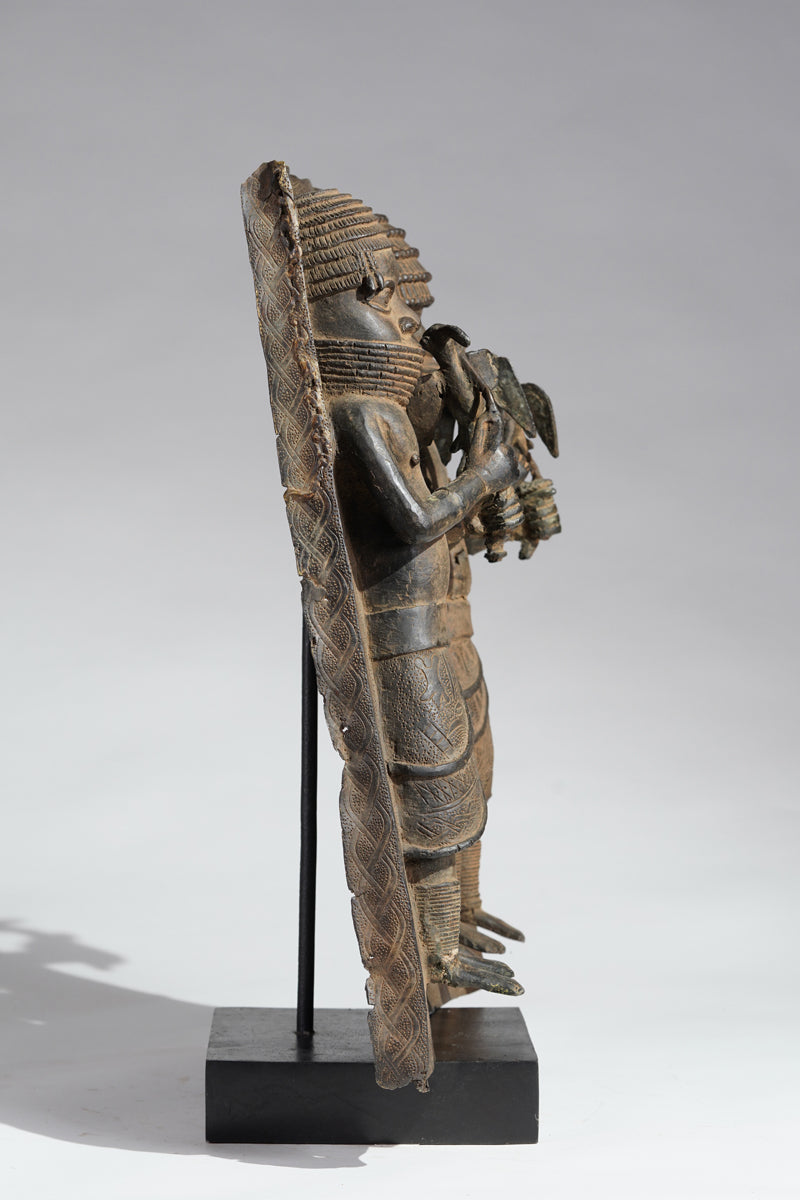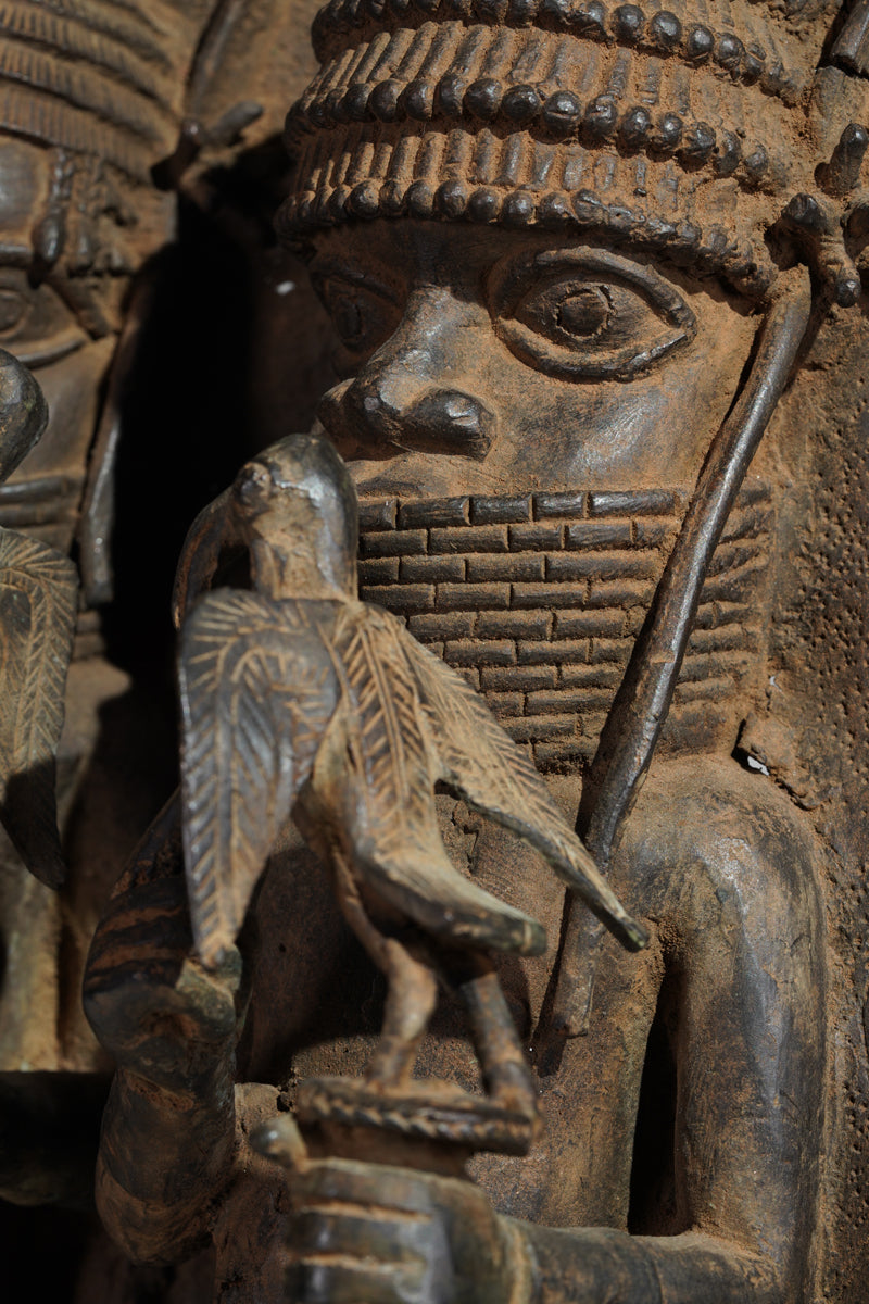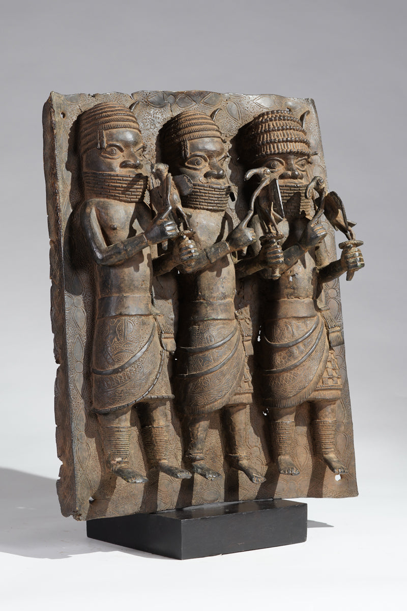 The plate you describe (“three high‑ranking personalities with eagles in their hands”) aligns well with this form, though I note some distinctions: the bird in the published example is more often called a “bird of prophecy idiophone” rather than a literal eagle, which suggests a symbolic function rather than strict zoological representation. The motif is connected with a key event in Benin’s history: according to tradition, during the early sixteenth‑century reign of Oba Esigie a bird cried a portent of disaster, the Oba had it killed, turned victory into ritual, and the bird symbol became cast in bronze for the annual Ugie Oro ceremony.