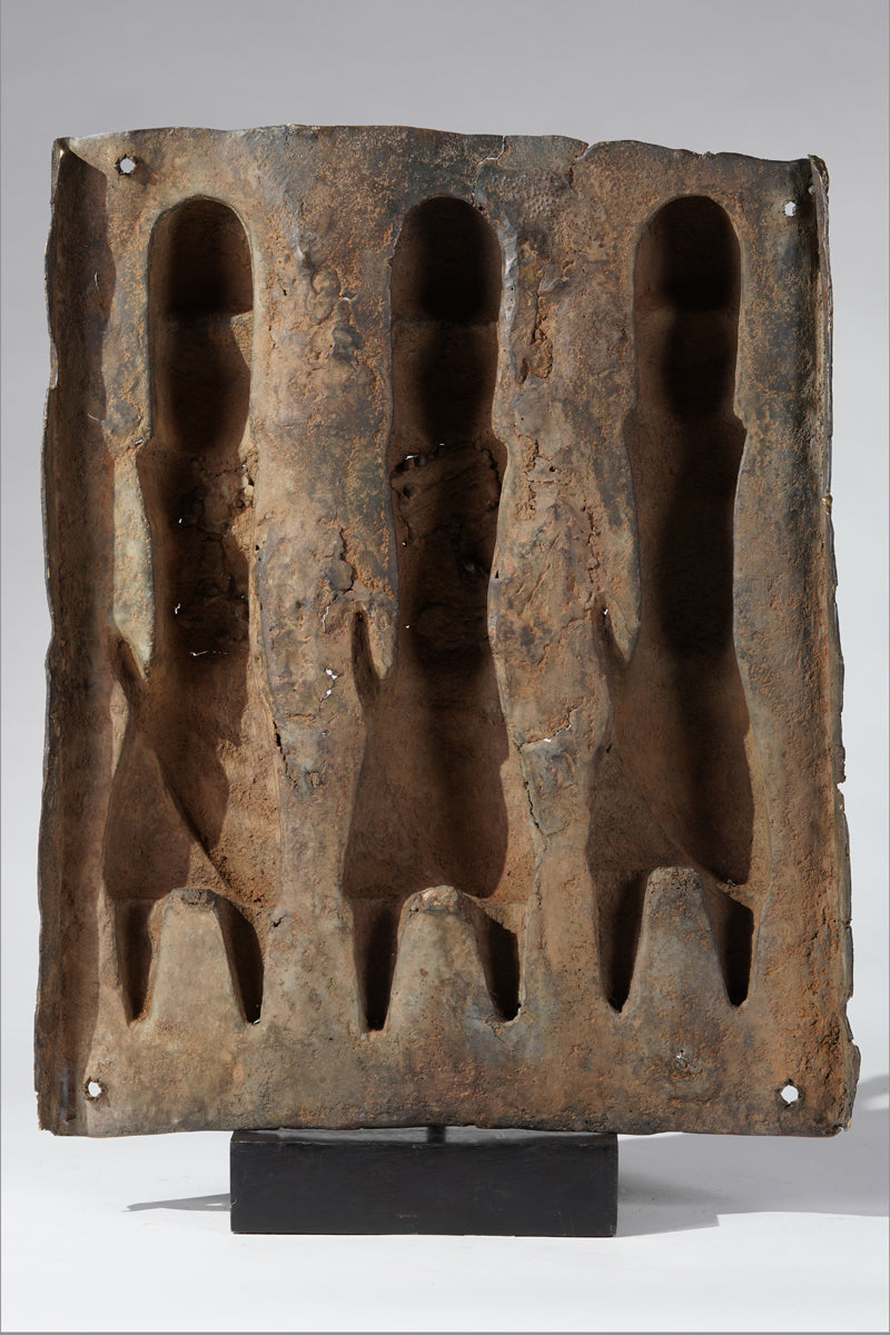 In scholarship the plate is often dated to the sixteenth to seventeenth centuries, made using the lost‑wax casting technique, brass or bronze alloy, and originally mounted on a palace pillar.The three figures are distinguished by regalia: deep beaded collars, tiered hairstyles, sashes, etc.—markers of high status in the Edo court. The background of the plaque is decorated with the “river‑leaf” motif (Edo: ebe‑ame) and stippling.
