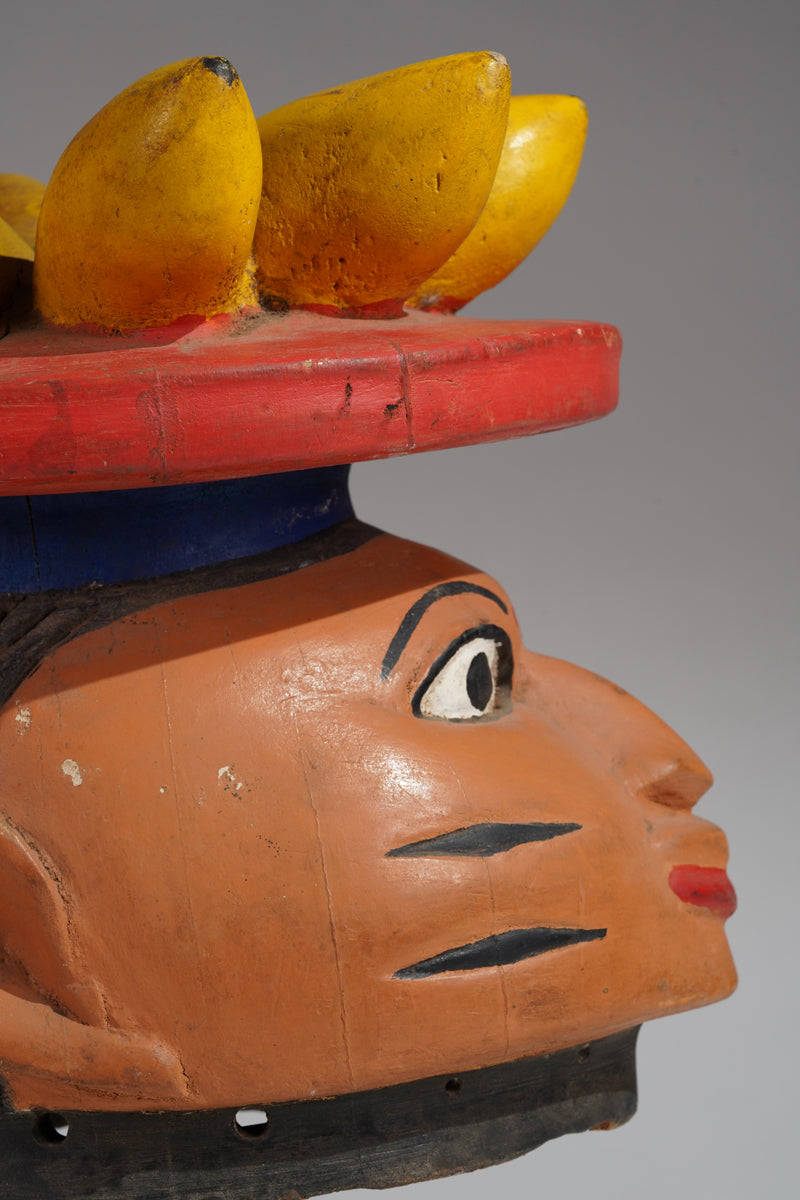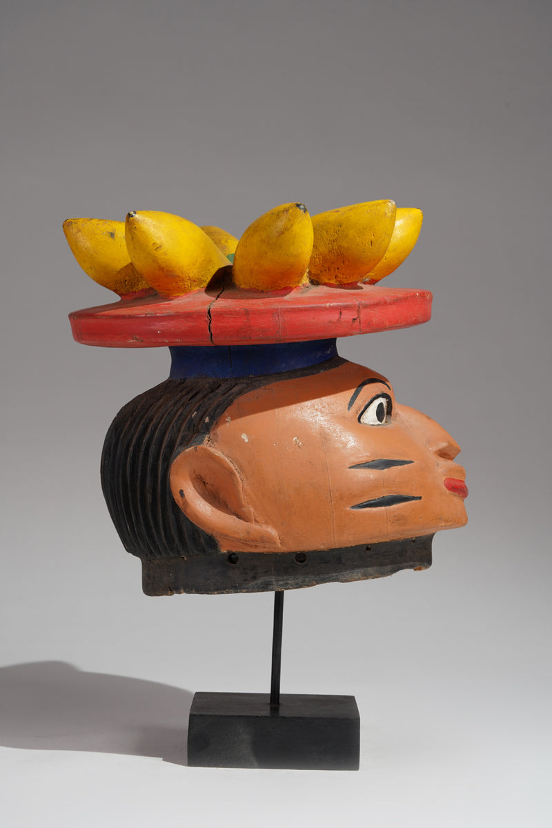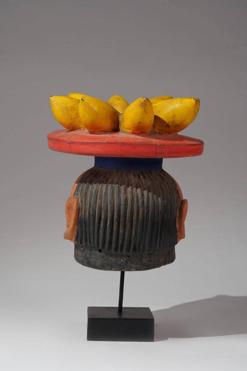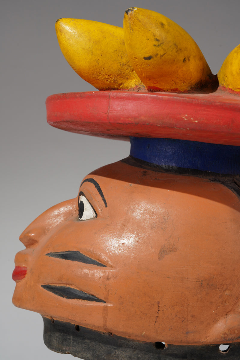 The Gelede takes place every year after the harvests, at important events and during drought or epidemics and is characterized by carved masks, dances and chants, sung in the Yoruba language and retracing the history and myths of the Yoruba-Nago people. The ceremony usually takes place at night on a public square and the dancers prepare in a nearby house. The singers and the drummers are the first to appear. They are accompanied by an orchestra and followed by the masked dancers wearing splendid costumes. There is a great deal of preparatory craftwork involved, especially mask carving and costume making. The performances convey an oral heritage that blends epic and lyric verses, which employ a good deal of irony and mockery, supported by satirical masks. Figures of animals are often used, such as the serpent, a symbol of power, or the bird, the messenger of the “mothers”. The community is divided into groups of men and women led by a male and a female head. It is the only known masked society, which is also governed by women. Although the Gelede has nowadays adapted to a more patriarchal society, the oral heritage and dances can be considered as a testimony of the former matriarchal order.