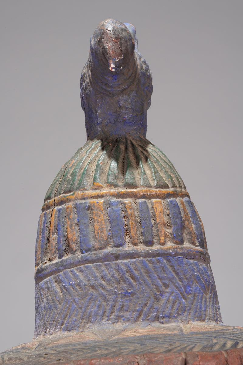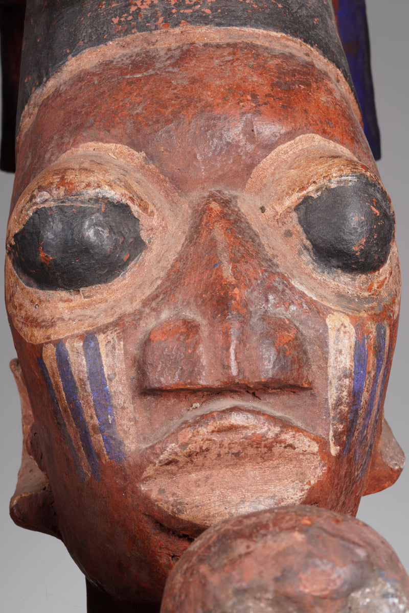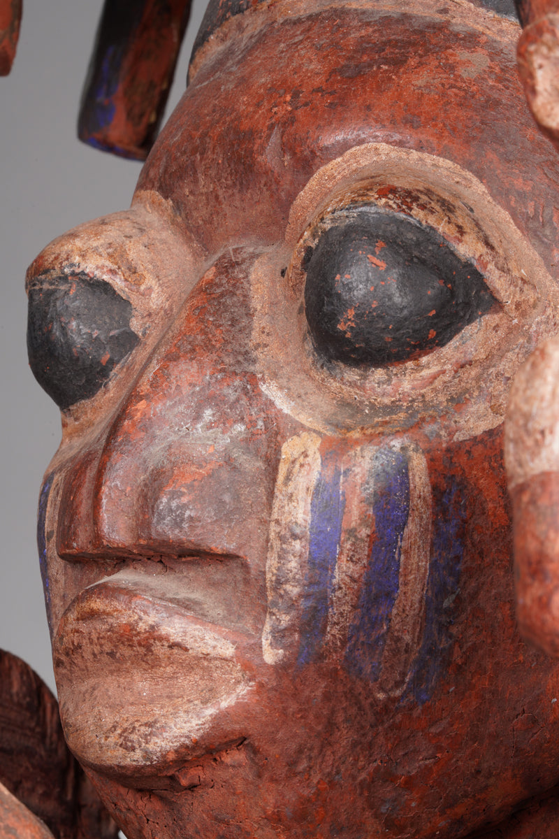 An amazing Yoruba horseman sculpture, featuring a male figure on horseback, presumably a chief, flanked by numerous attendents, surmounted with a hatlike helmet an an abract bird, painted with red, ocher and bueish pigmnt. Collected in the Ketu region, Nigeria.