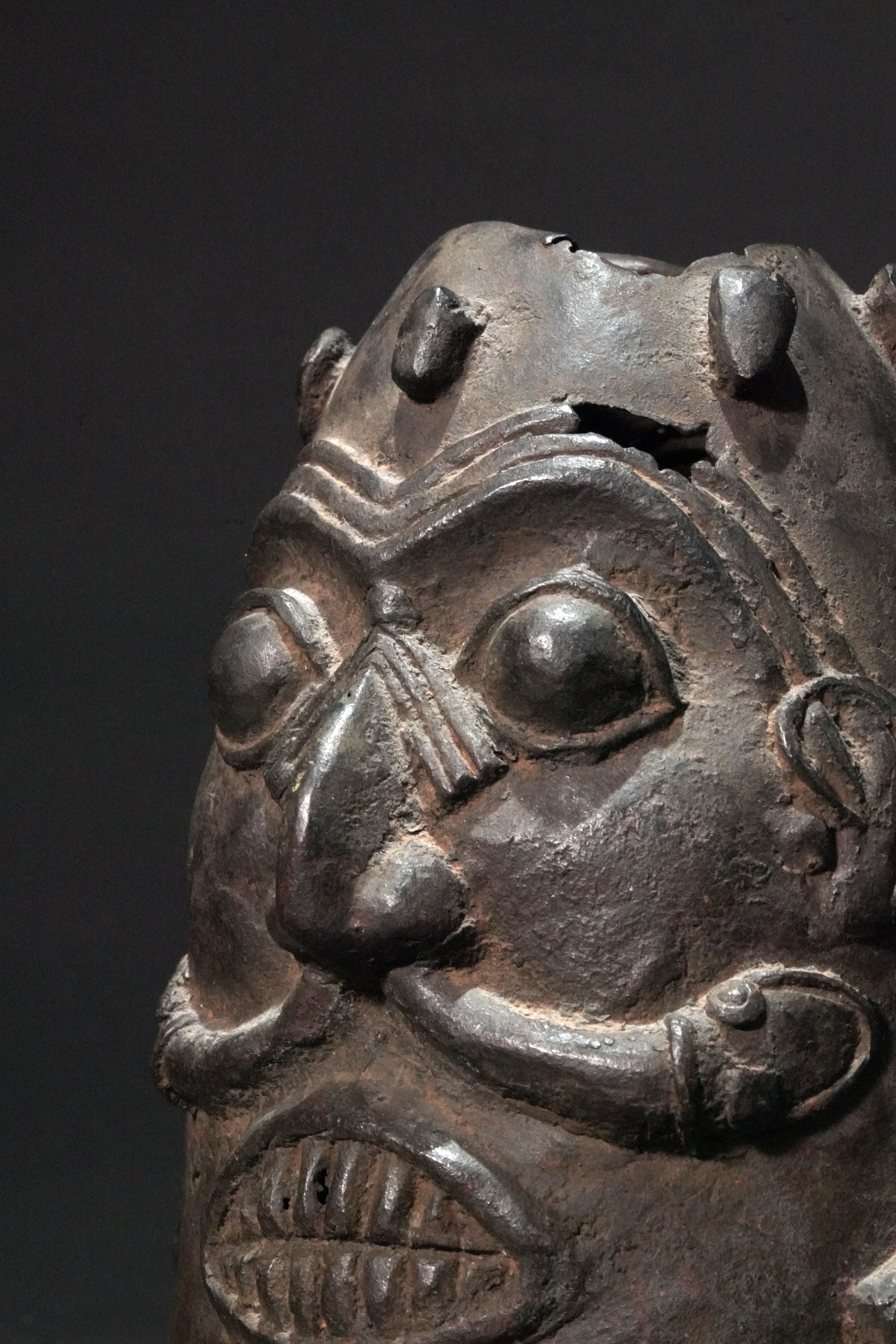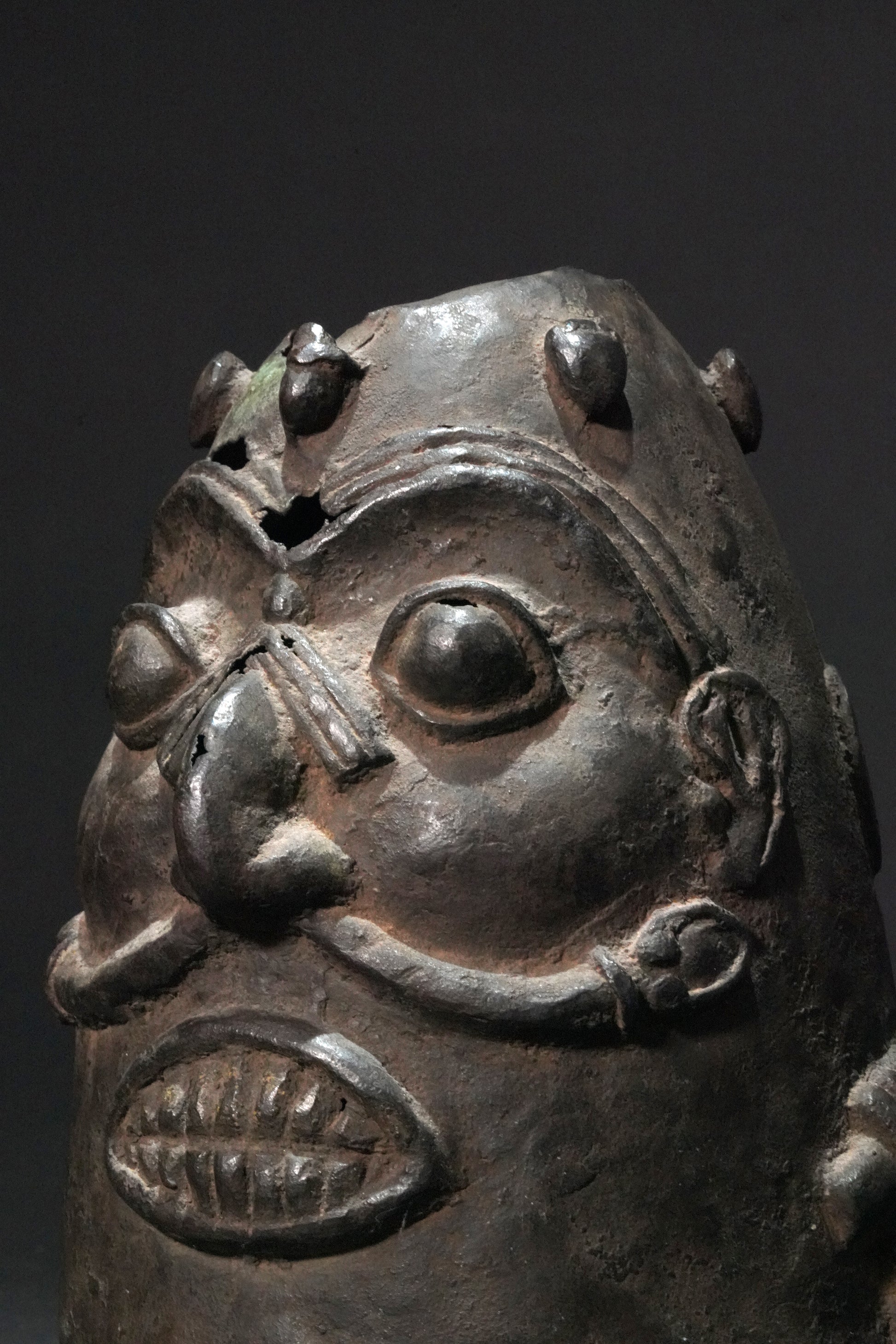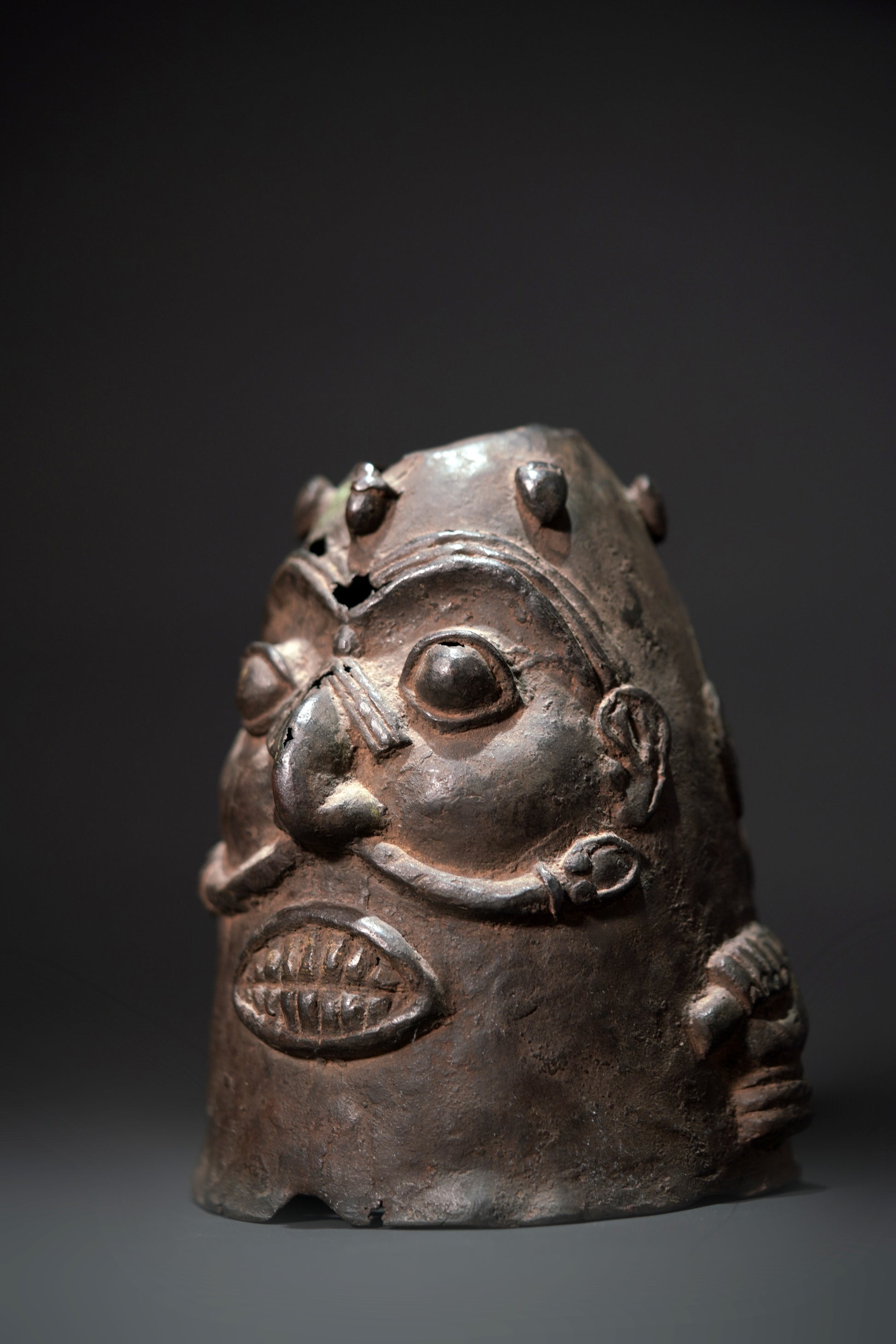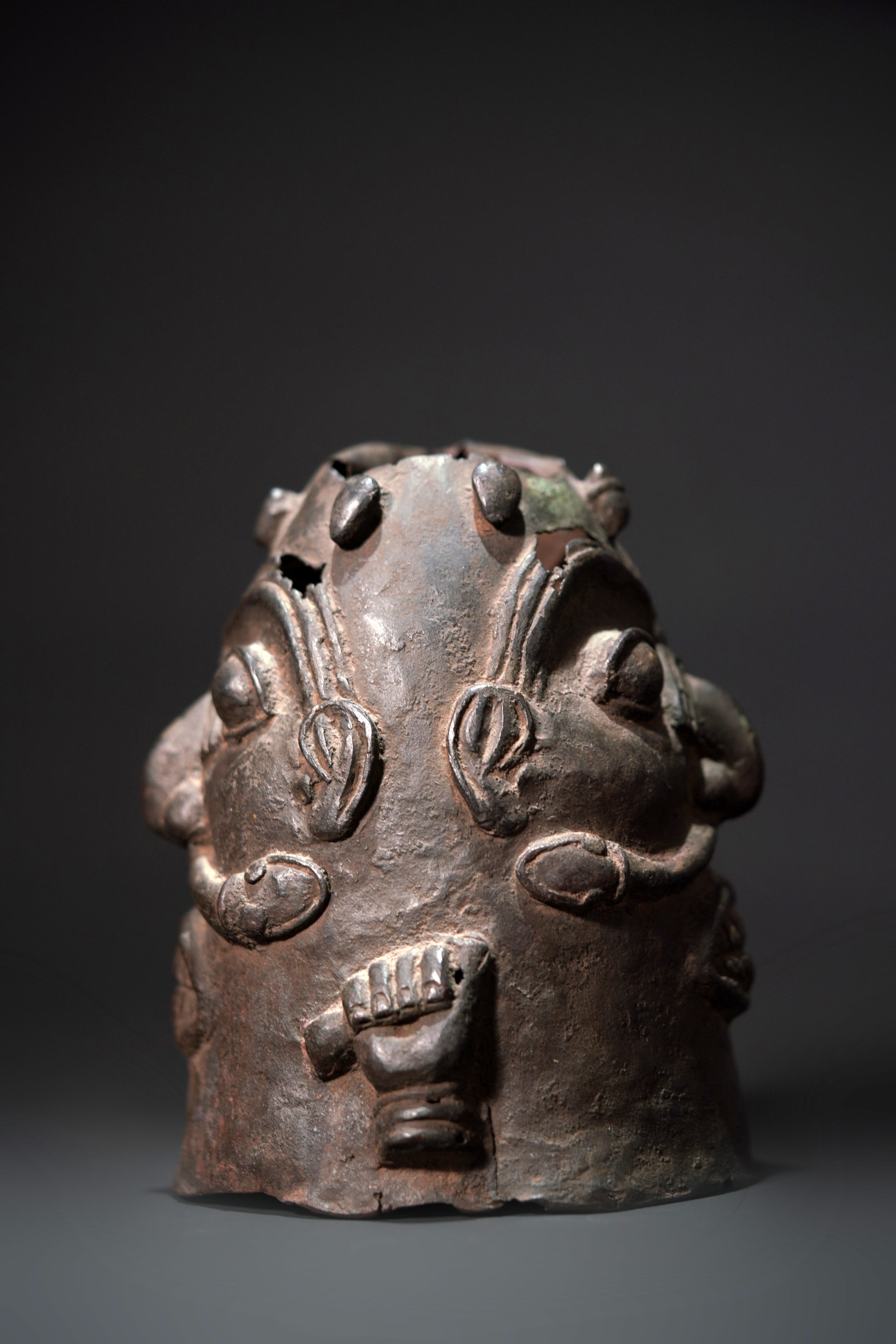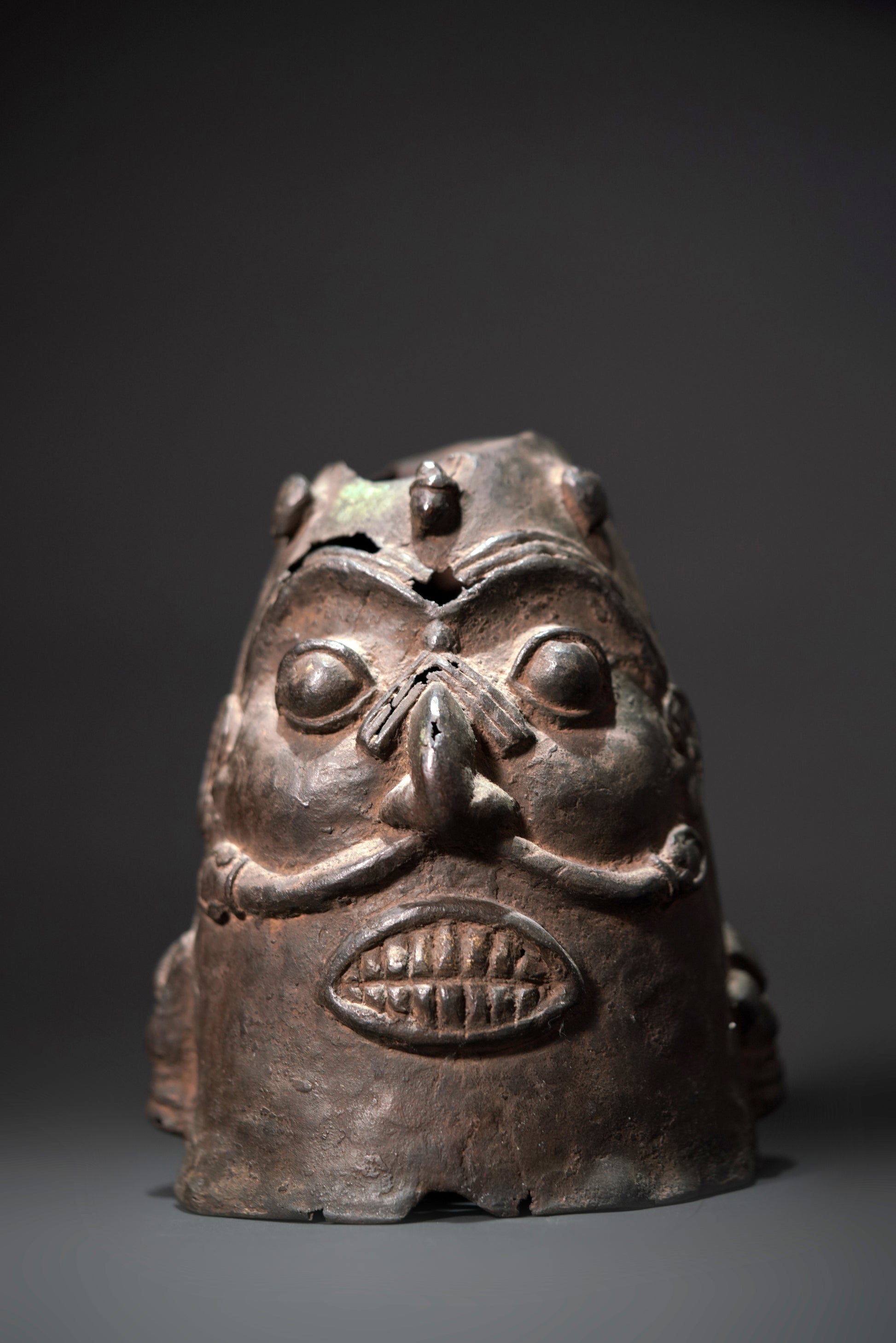 An early double-faced Benin bronze head with bared teeth, the nose broad, curved and protruding, framed by large bulging eyes, snakes winding out of the nostrils, between the faces on each side is a hand holding a short object, above the faces are small feet arranged in a circle; thin-walled with several cracks and small holes, greenish encrusted patina of different layers. From a German private collection.