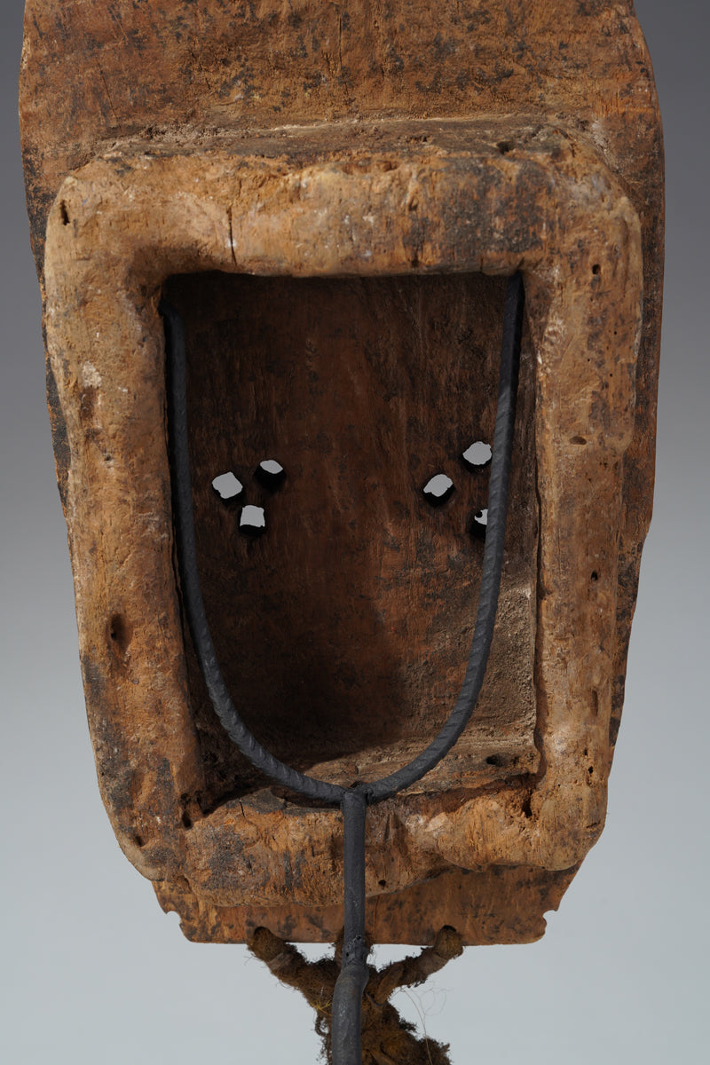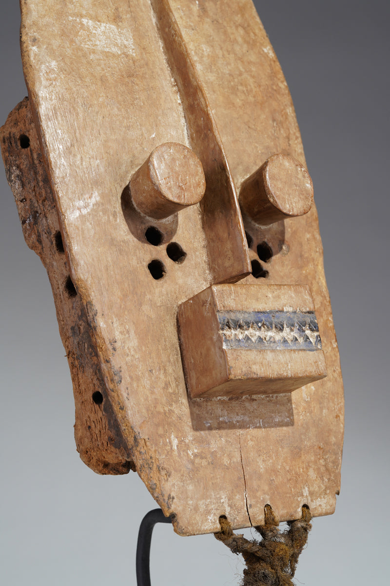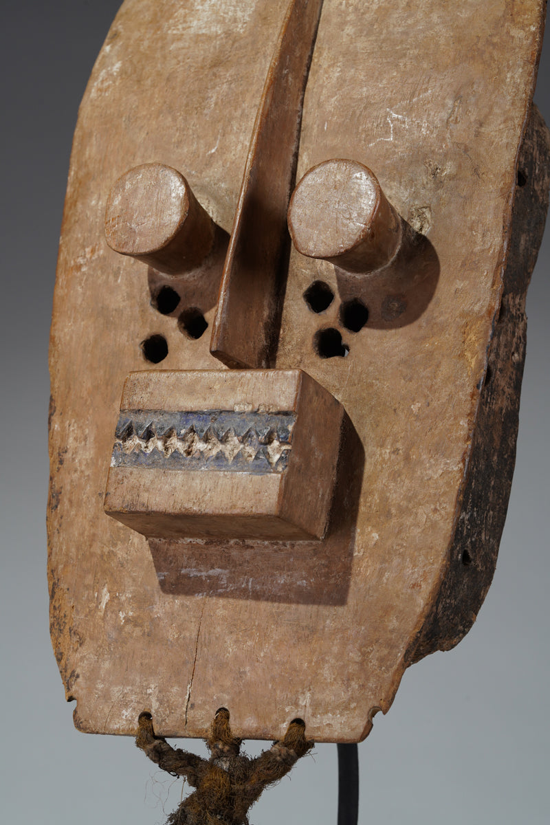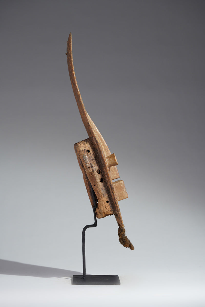 An elegant Grebo mask, Ivory Coast/Liberia, from the Sassandra region, southeastern Liberia and in the western coastal region of Côte d’Ivoire, near the Sassandra River.with an elongated, slender nose, framed by bulging, tubelike eyes and a rectangular mouth, the elongated, flattened forehead slightly bent; natural brownish to occhre patina, incl. stand, provenance Bakari Bouaflé, Abidjan.