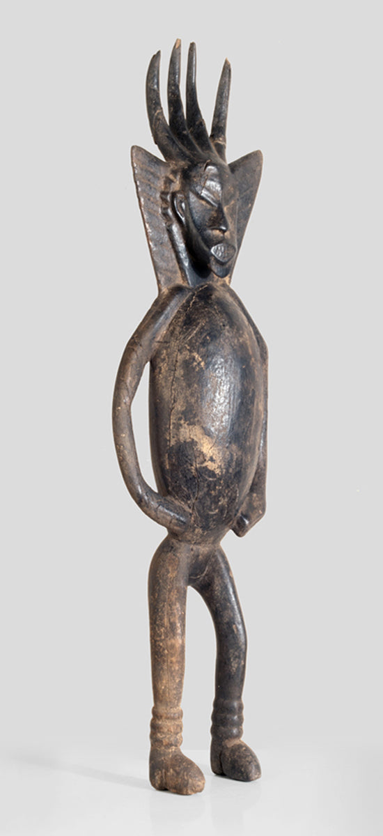 An extremely rare Bamana sculpture of a "wakoulo", the mystic "devil", an "animal", who is living near the Niger river and whose "bones" are required by special fetishes like for important Kono masks. It is the first time I collected a sculpture of this anthropomorphic animal