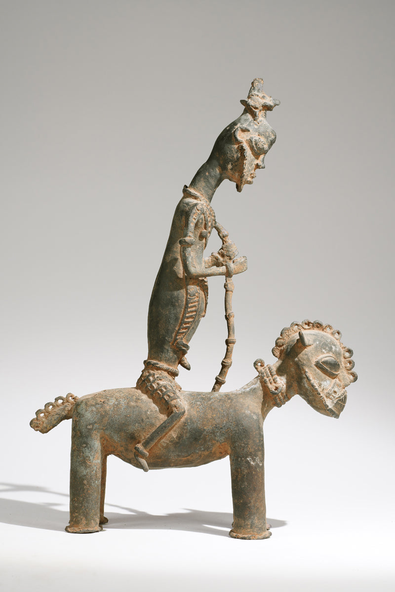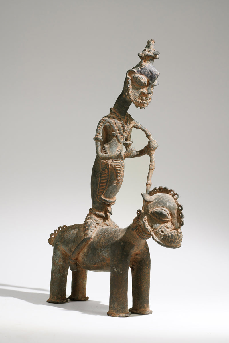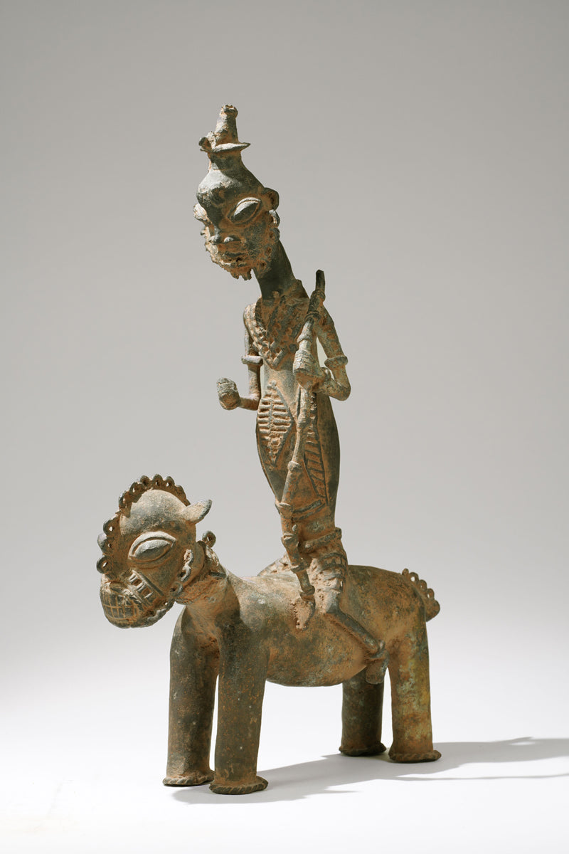 An Ogboni bronze in shape of a horserider, holding a cerimonial staff in its hands.