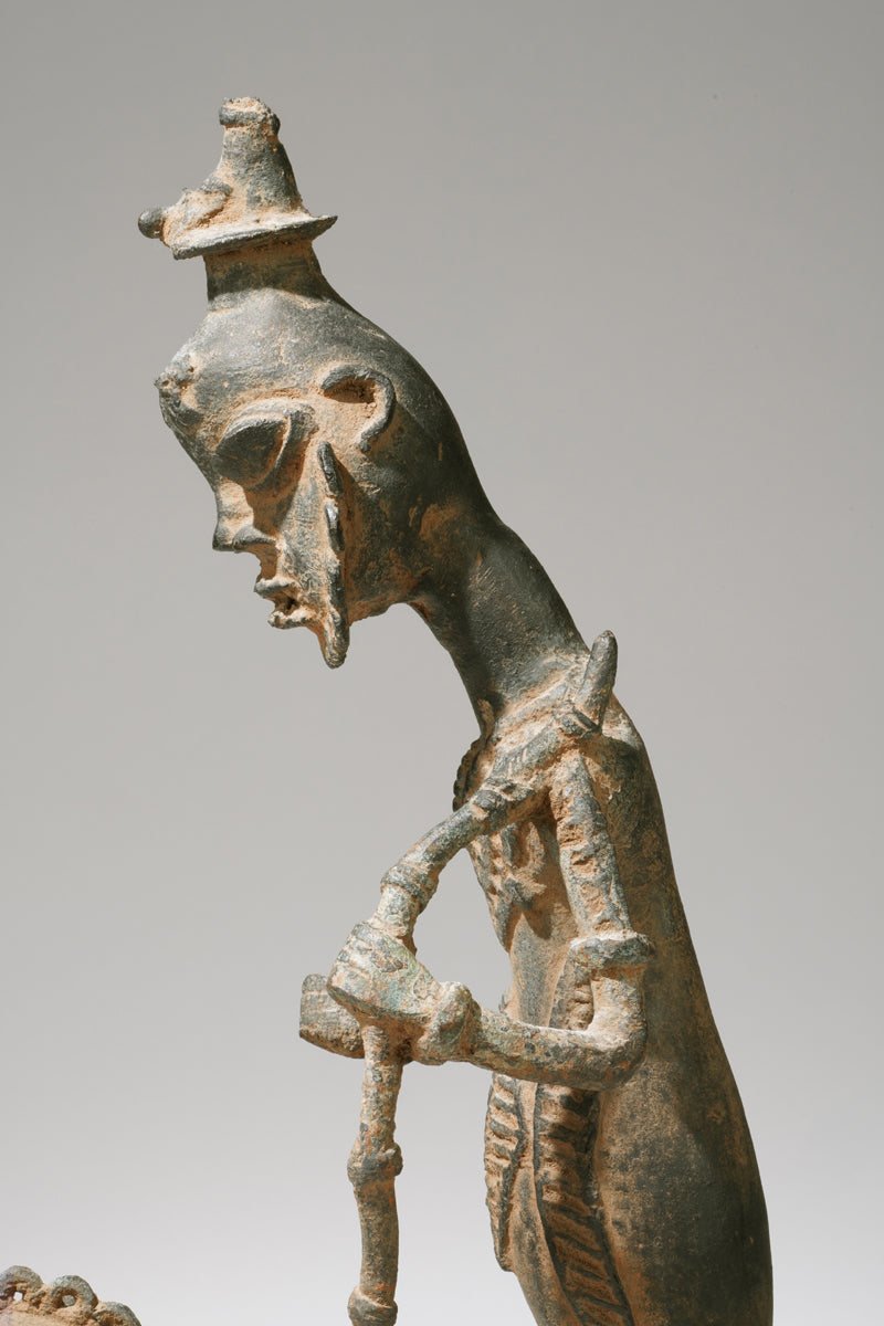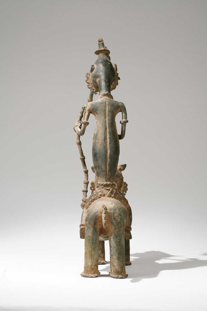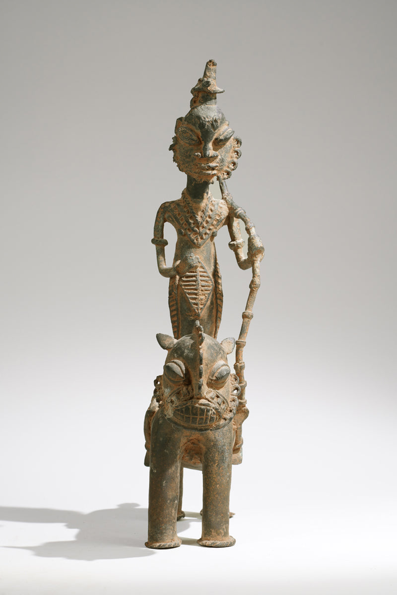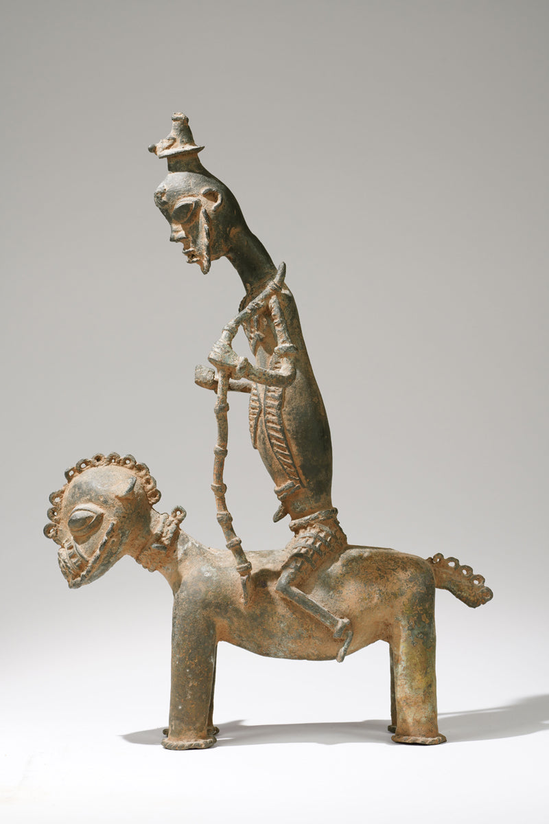 An Ogboni bronze in shape of a horserider, holding a cerimonial staff in its hands.