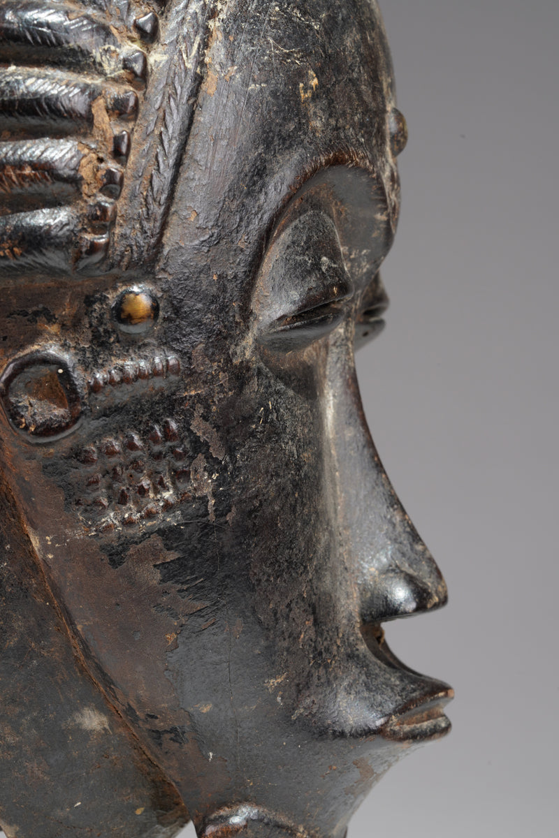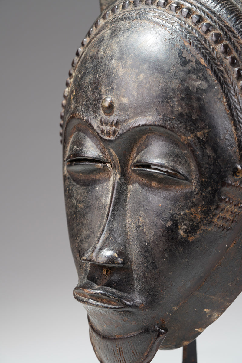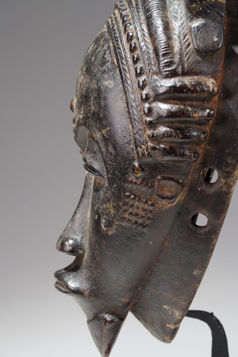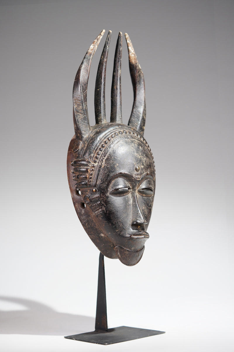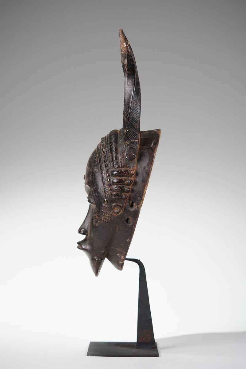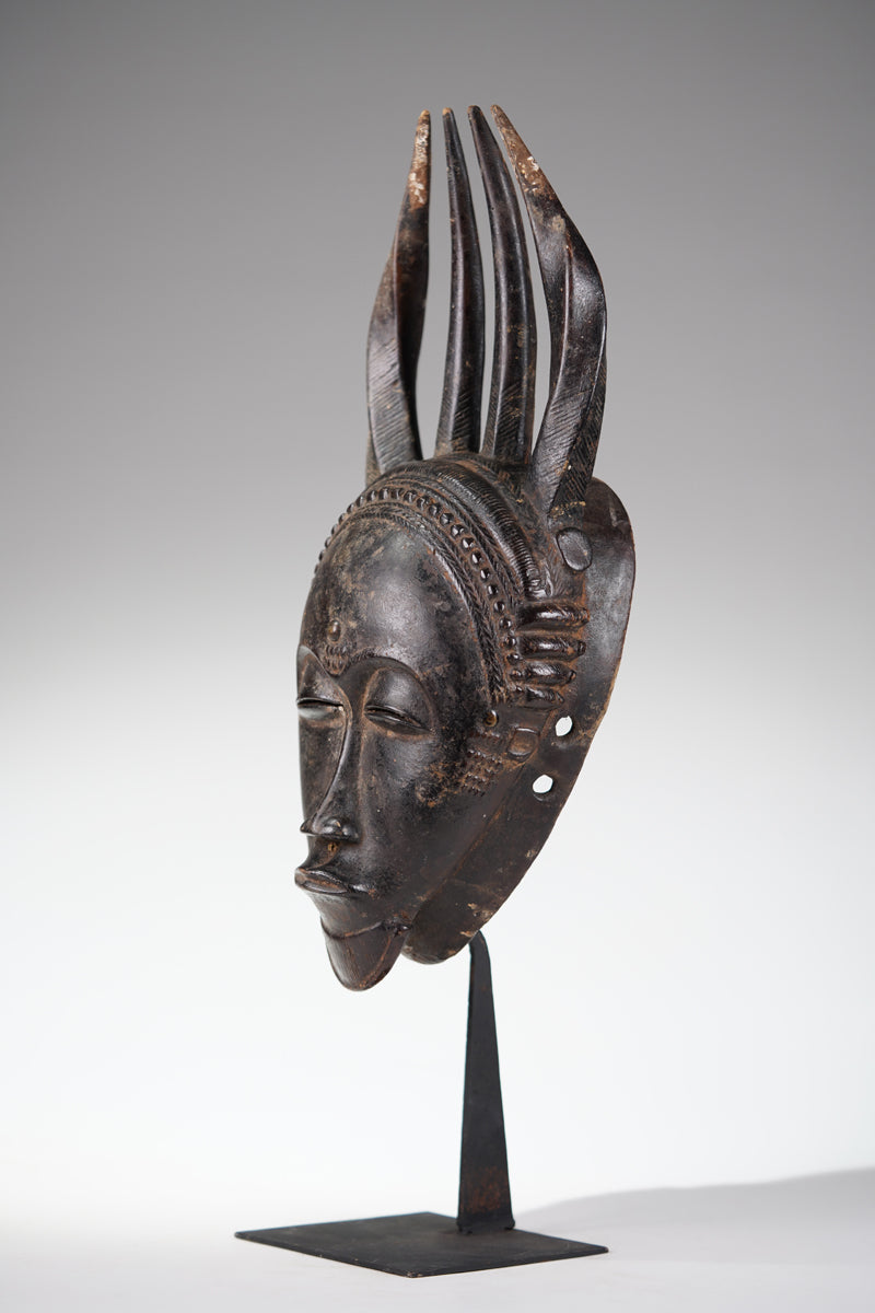 Lit: Baule: African Art, Western Eyes. Susan M.Vogel 1997."Portrait masks embody the core Baule sculptural style that is echoed in figural sculpture and decorative arts. They also have provided Baule sculptors with their prime opportunity for artistic invention, and the corpus demonstrates enormous formal diversity. This diversity is often apparent in imaginative decorative passages extending above the face […] Such masks appeared as the final sequence of an operatic public entertainment known as Mblo. Mblo performances consist of a succession of dances that escalate in complexity and importance, culminating ultimately in tributes to the community's most distinguished member. Individuals honored in this way are depicted by a mask conceived of as their artistic double or namesake."