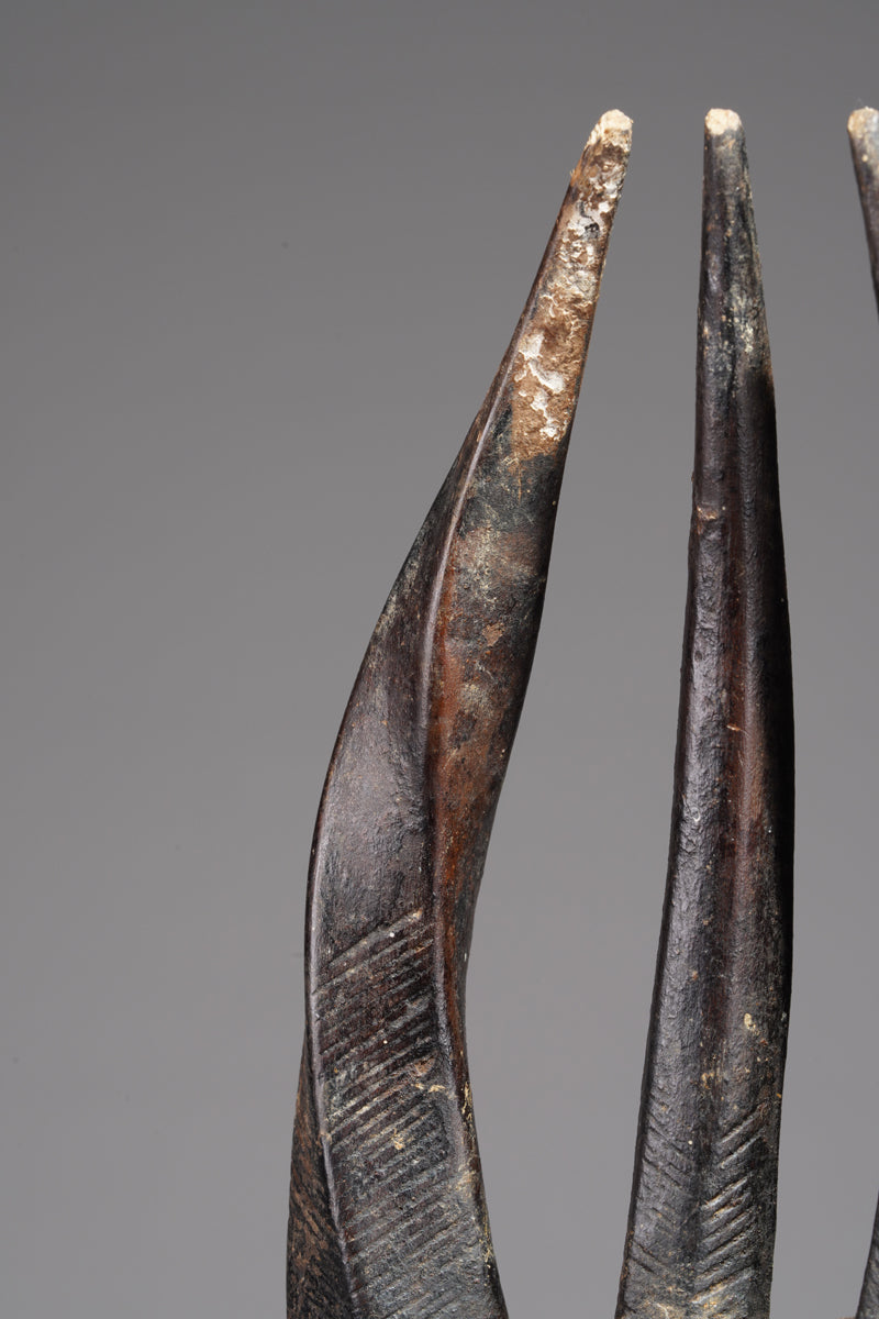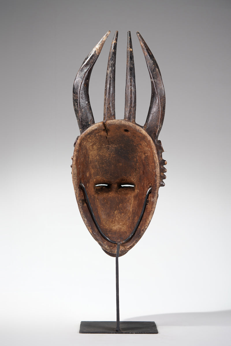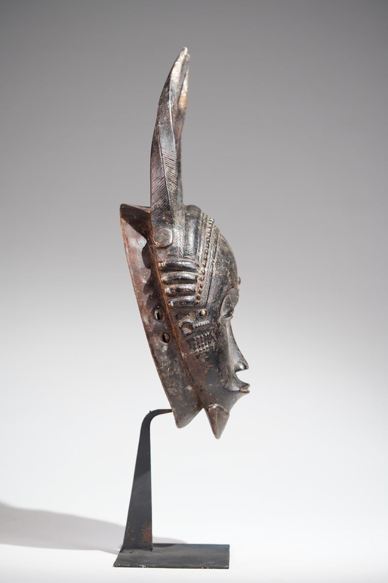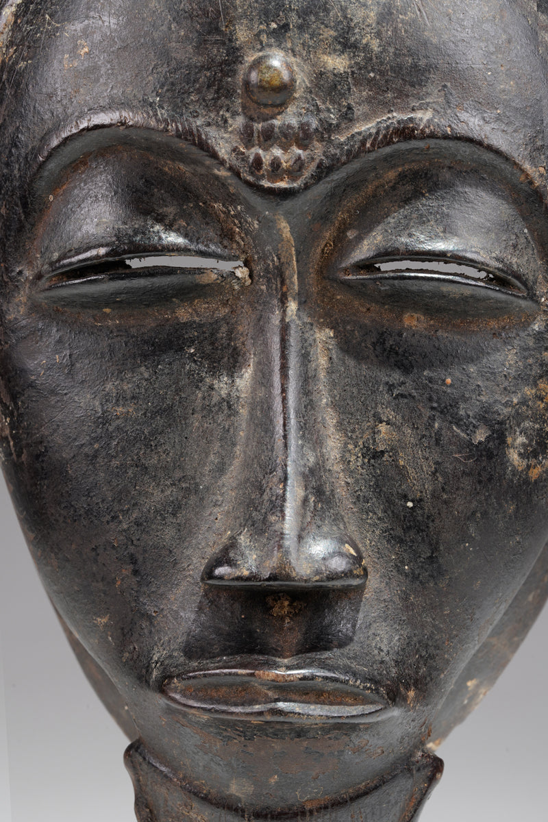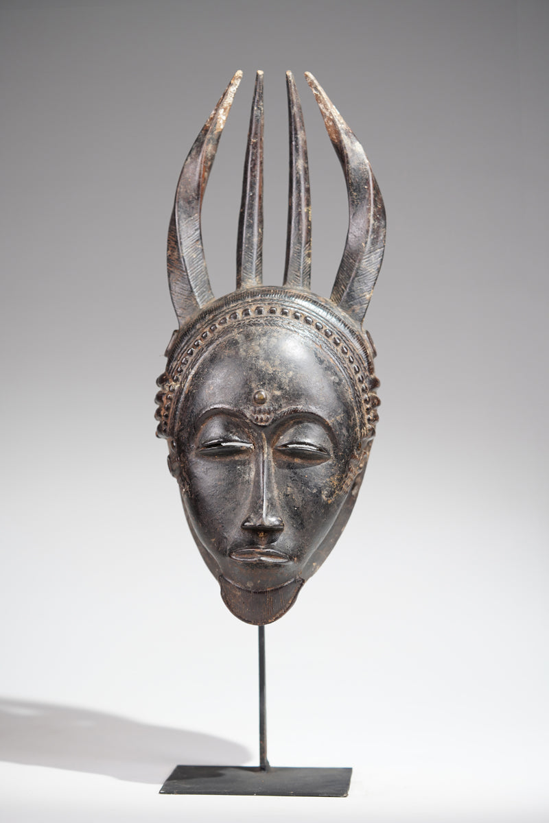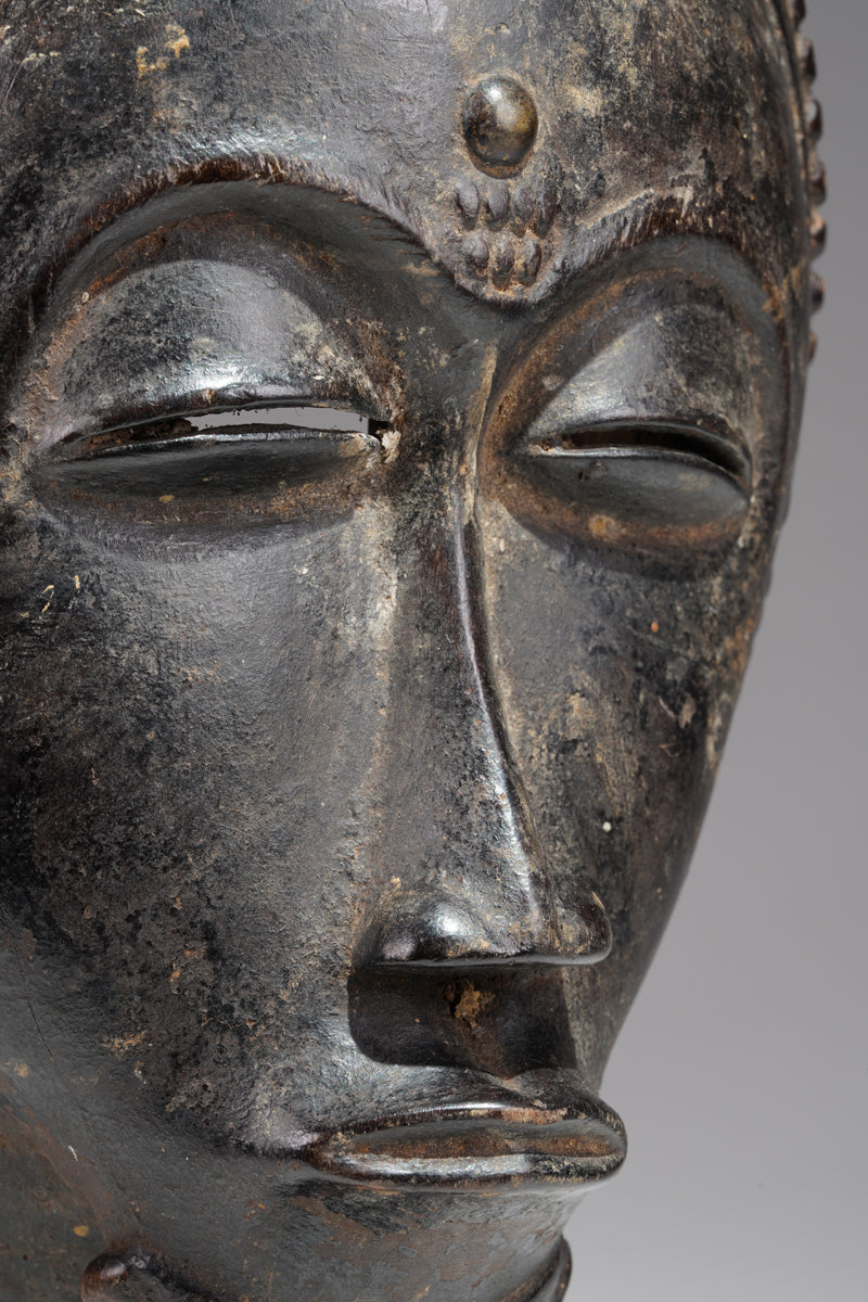 Lit: Baule: African Art, Western Eyes. Susan M.Vogel 1997."Portrait masks embody the core Baule sculptural style that is echoed in figural sculpture and decorative arts. They also have provided Baule sculptors with their prime opportunity for artistic invention, and the corpus demonstrates enormous formal diversity. This diversity is often apparent in imaginative decorative passages extending above the face […] Such masks appeared as the final sequence of an operatic public entertainment known as Mblo. Mblo performances consist of a succession of dances that escalate in complexity and importance, culminating ultimately in tributes to the community's most distinguished member. Individuals honored in this way are depicted by a mask conceived of as their artistic double or namesake."
