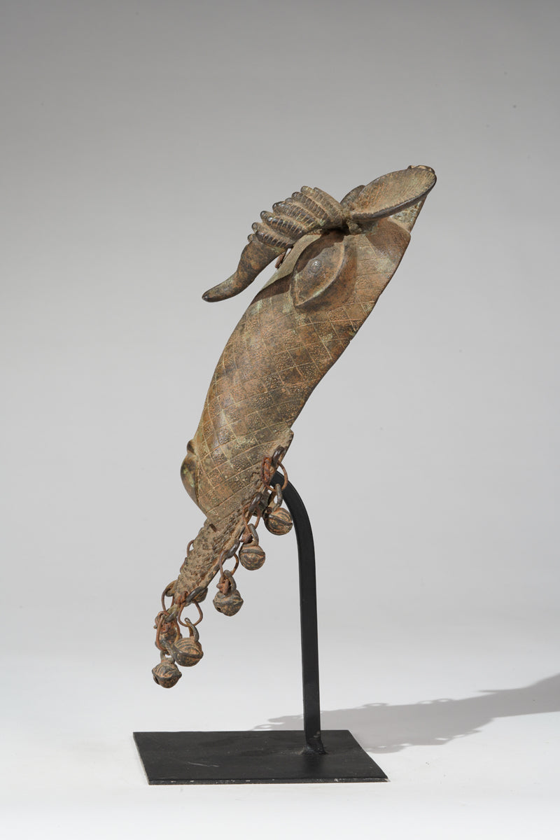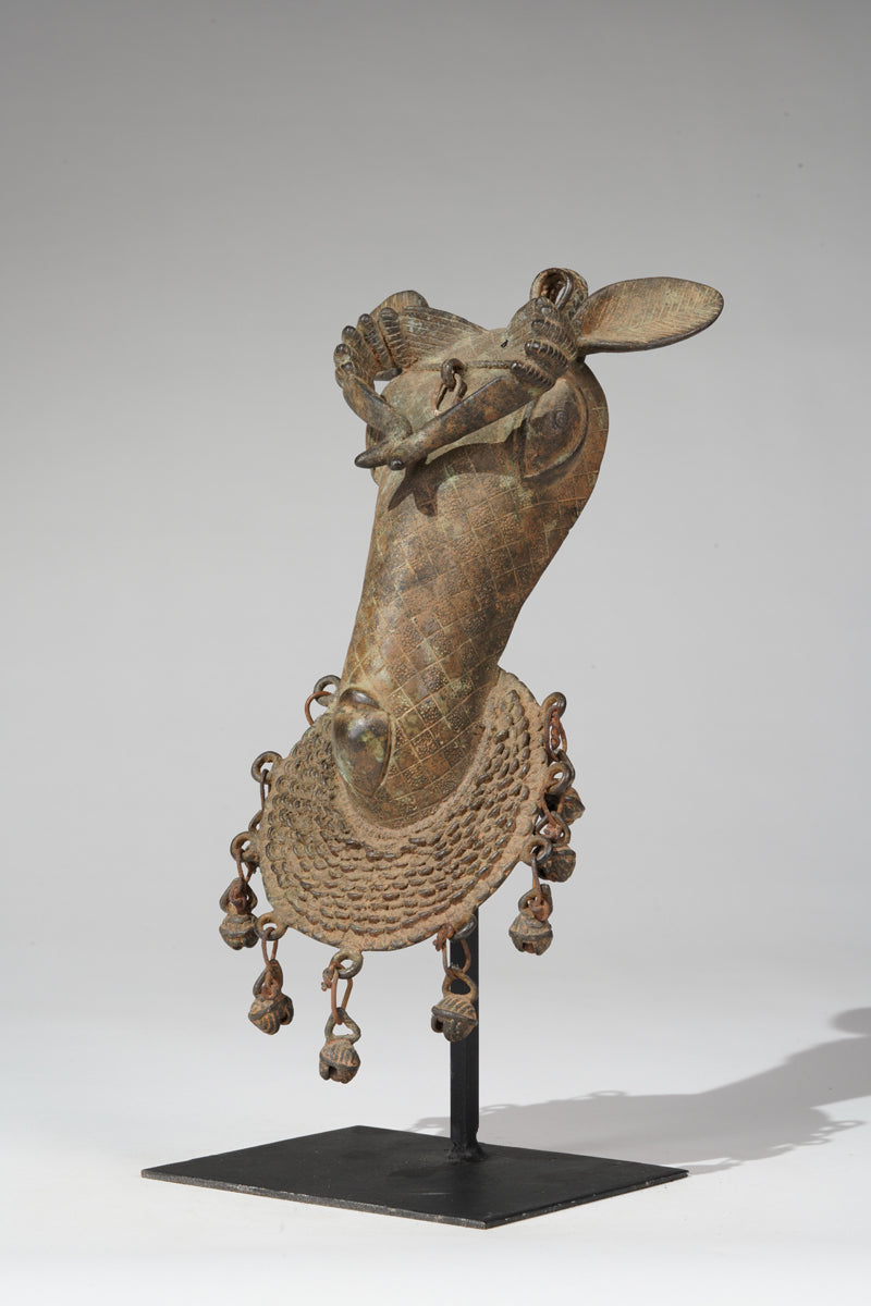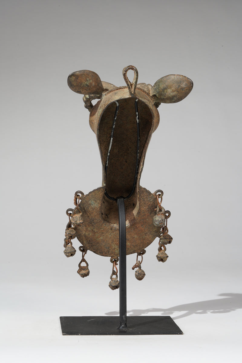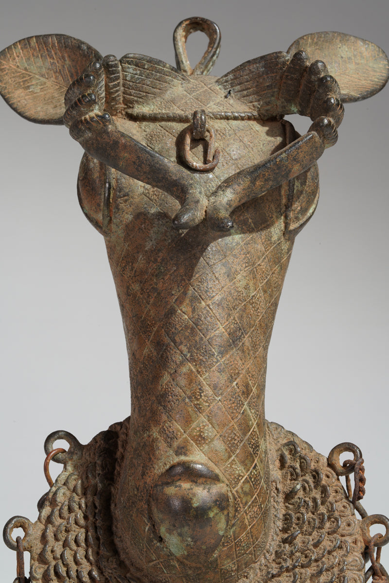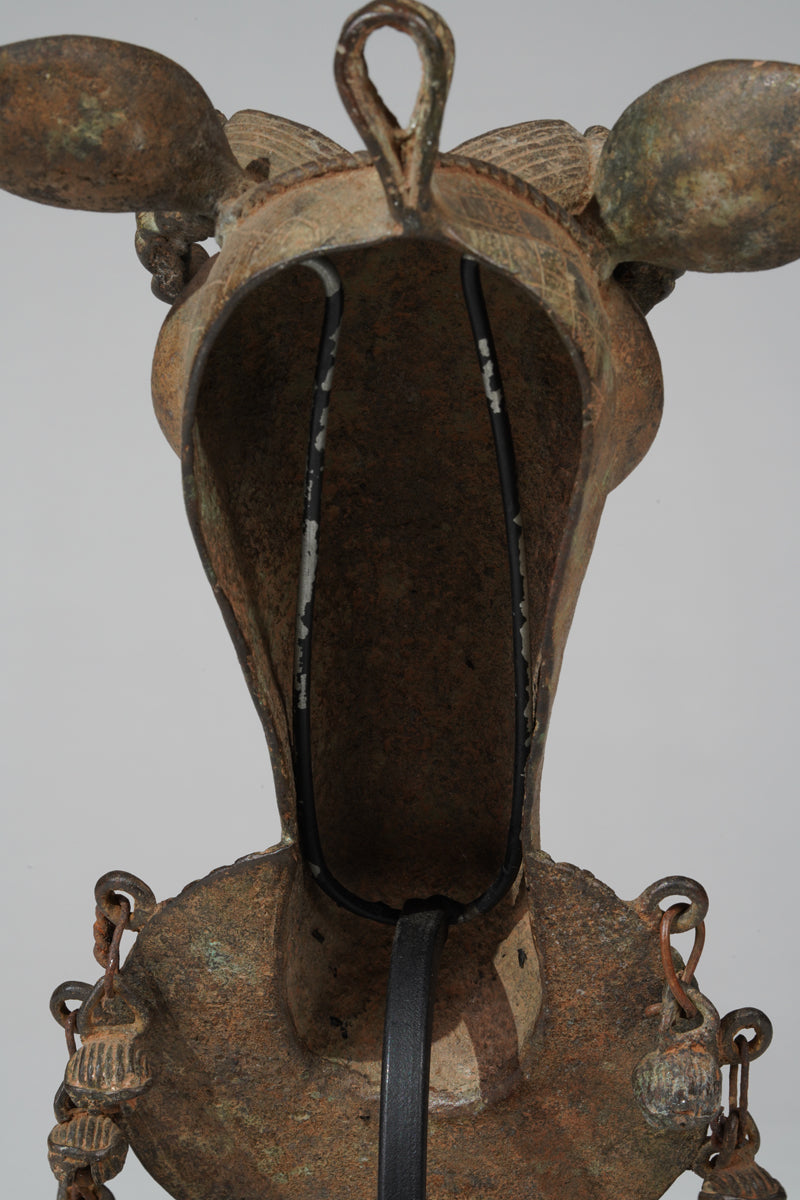 Benin ram or leopard masks—like other Benin hip masks—are inormaly hip ornaments, traditionally worn at the waist by high-ranking individuals in the Benin Kingdom (now southern Nigeria). But according of its height itt seems to be more a pendant or an object of the royal regalia of the Oba or a high ranking personaly in the Benin kingdom.