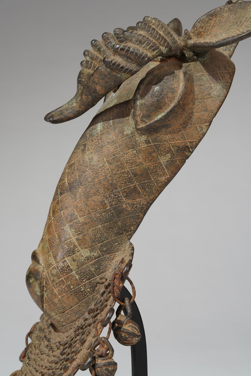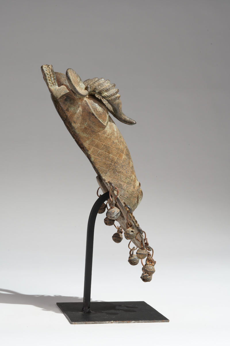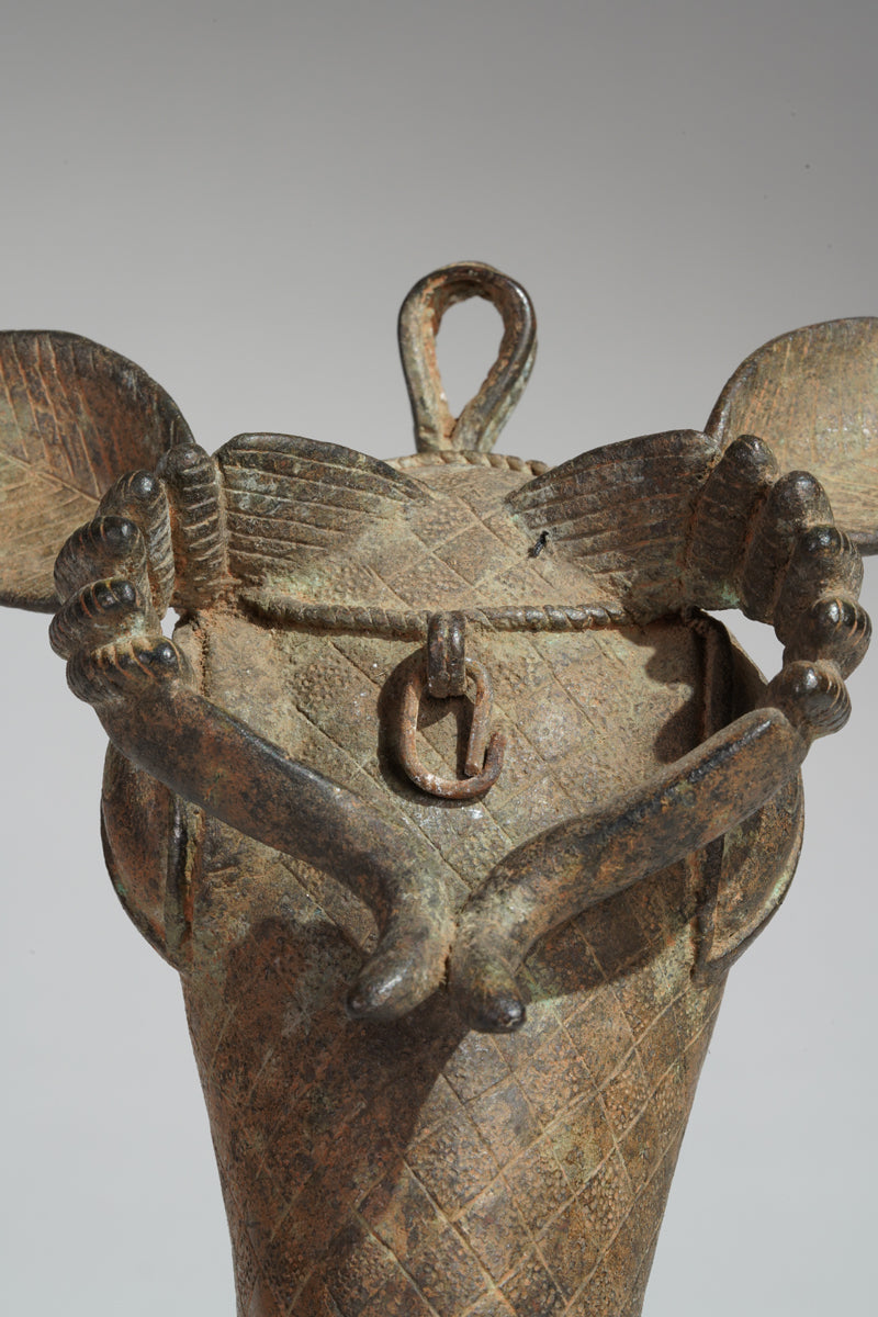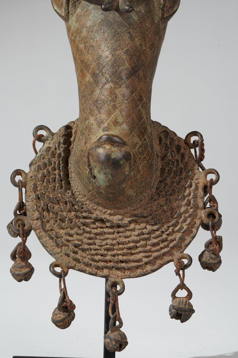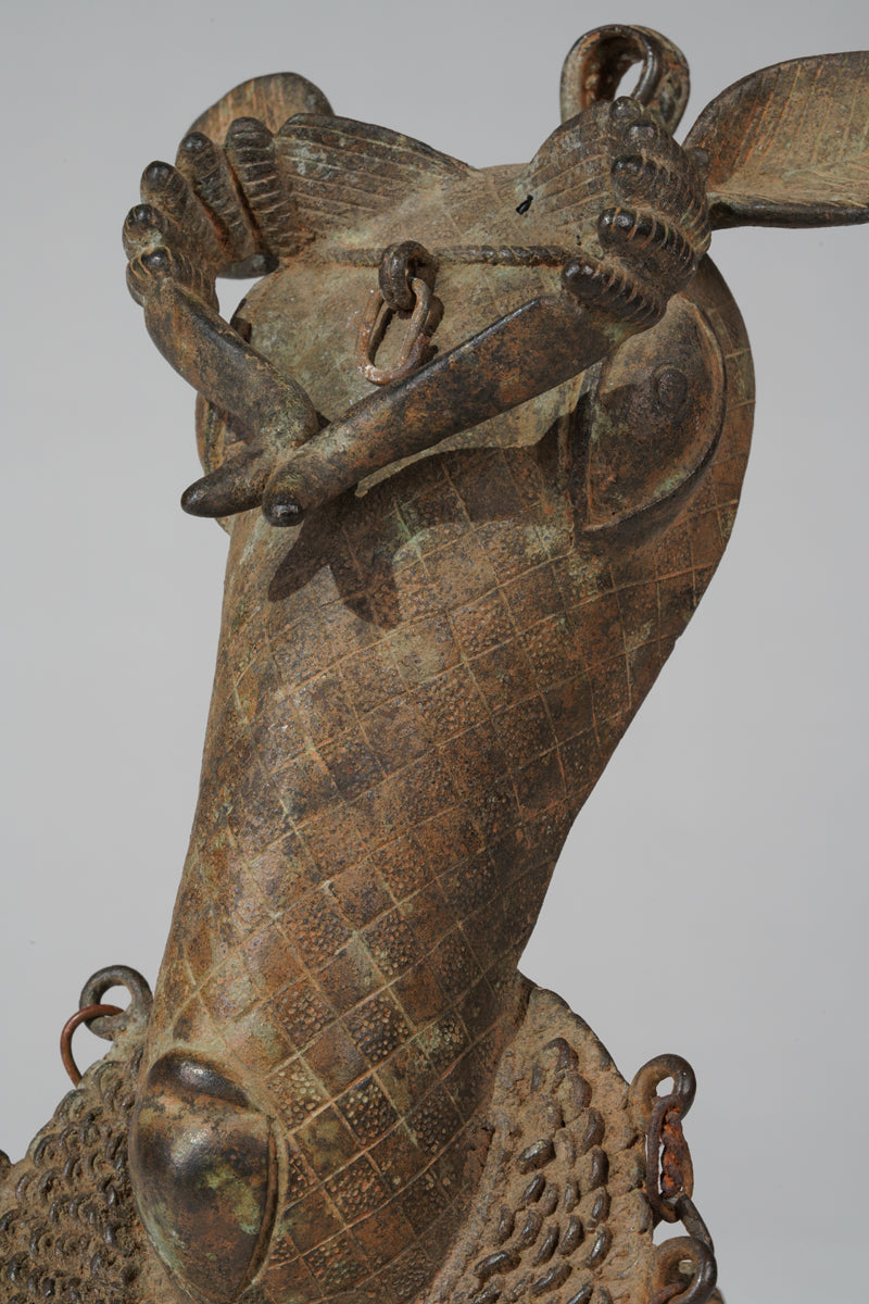 Benin ram or leopard masks—like other Benin hip masks—are inormaly hip ornaments, traditionally worn at the waist by high-ranking individuals in the Benin Kingdom (now southern Nigeria). But according of its height itt seems to be more a pendant or an object of the royal regalia of the Oba or a high ranking personaly in the Benin kingdom.