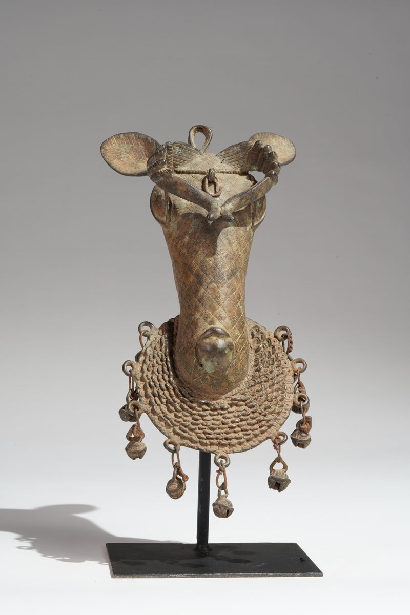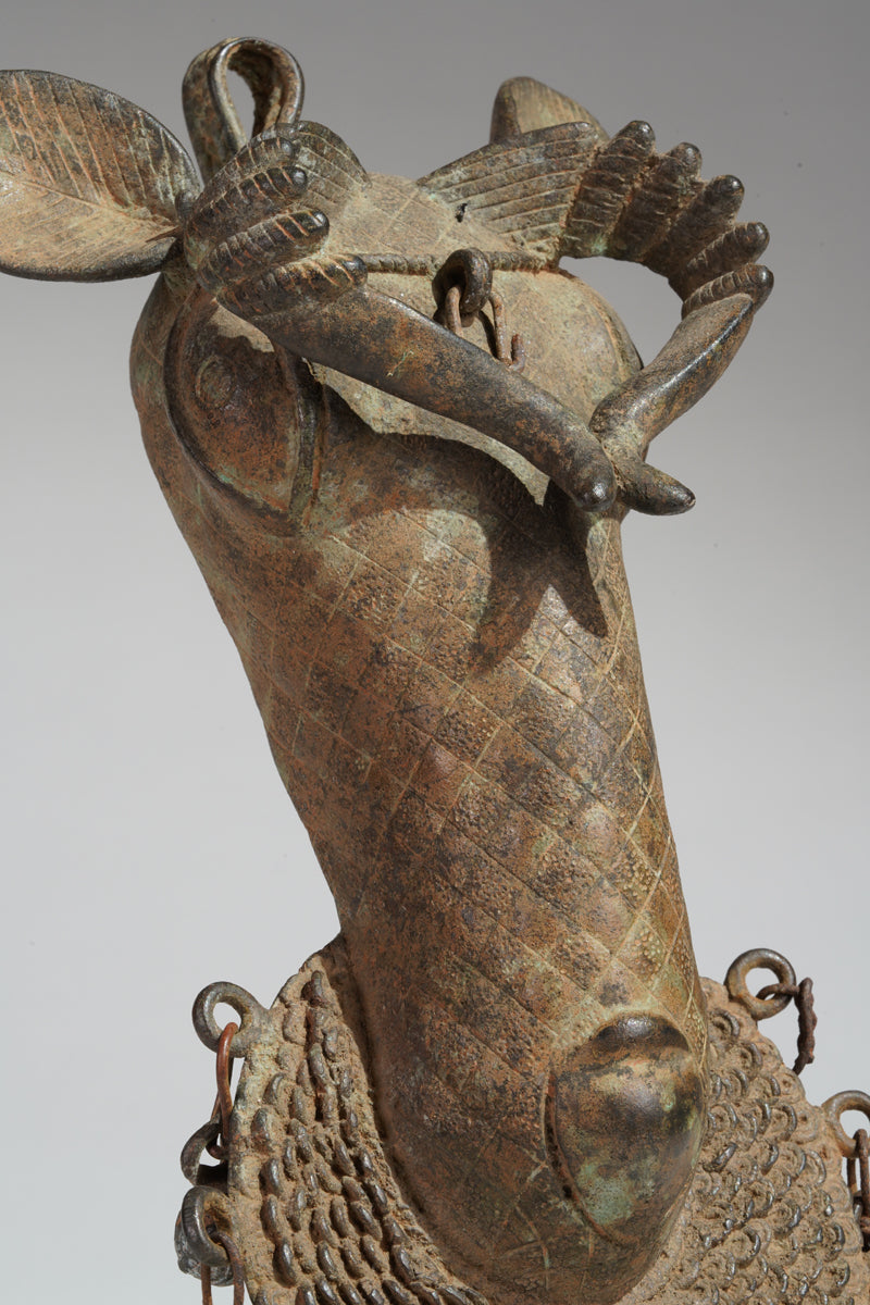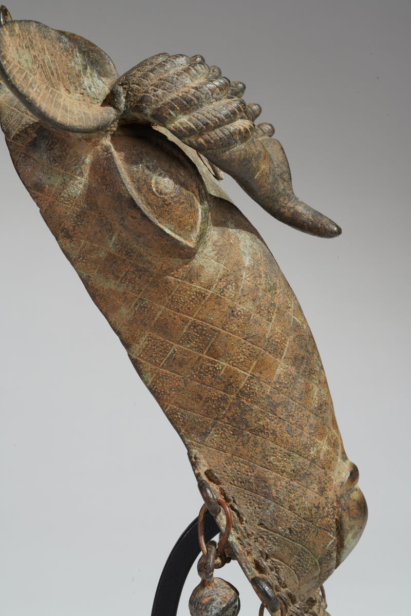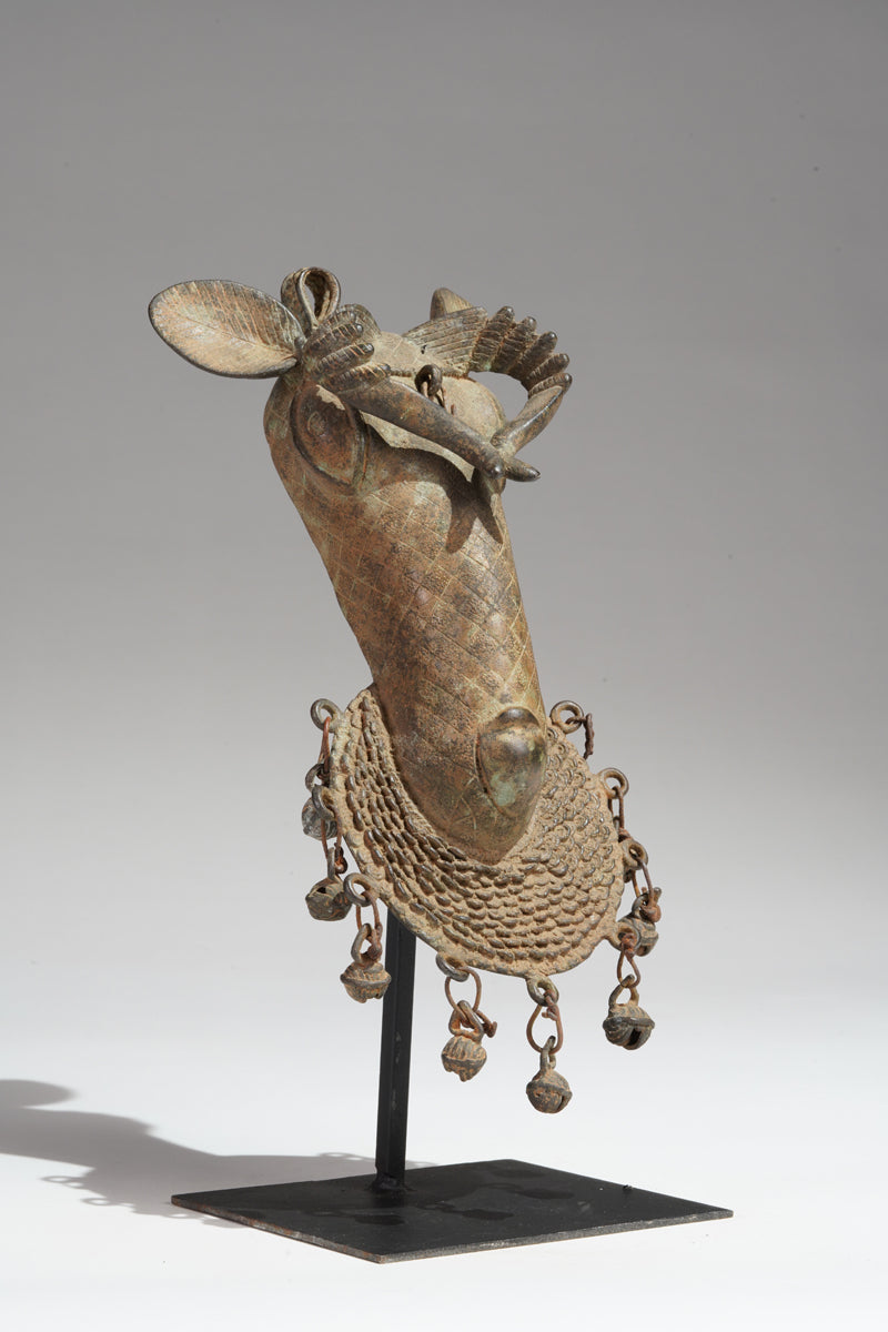 An Uhunmwu-Ẹkuẹ bronze in shape of a ram pendant or hip mask, Nigeria, partly greenish oxidised patina.
