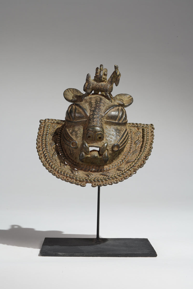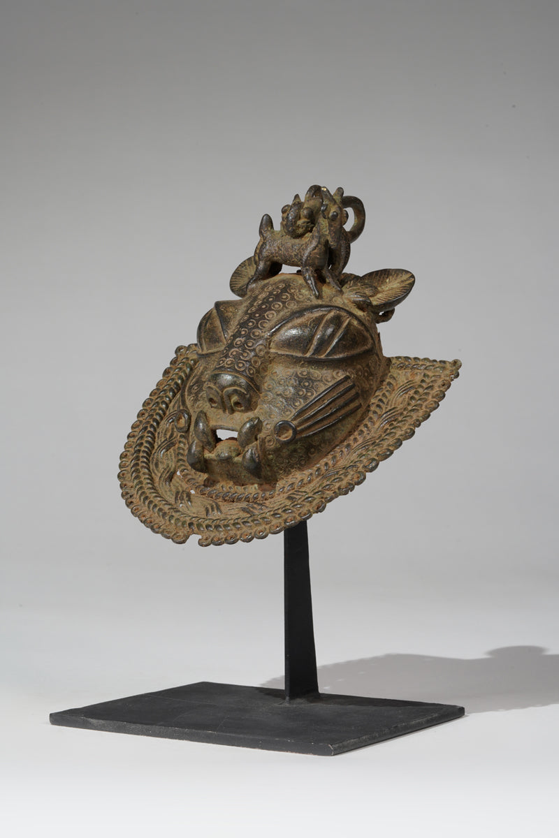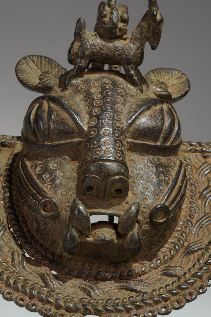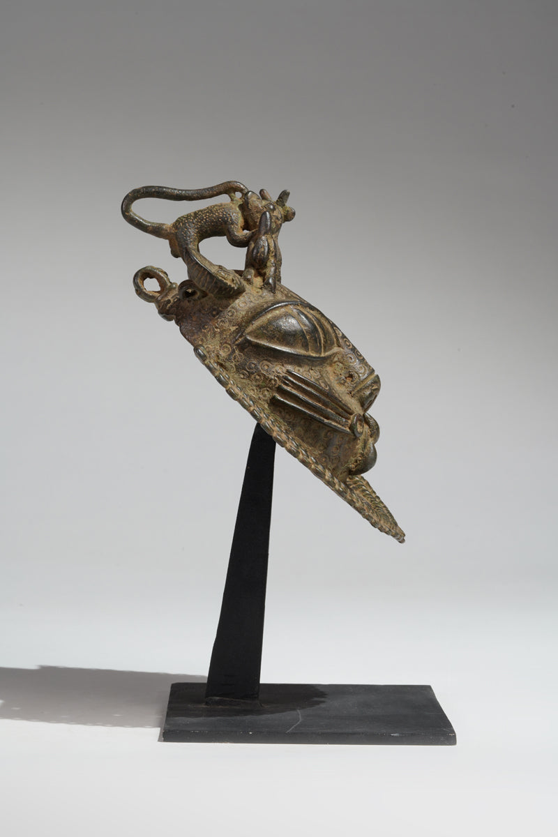 Uhunmwu-Ẹkuẹ are one of the best-known categories of Benin artworks. A range of human and animal heads are depicted, hence the term ‘mask’, although they were not used to cover the face. Sometimes known as ‘hip masks’, they may be worn on the belt or hung at the hip as seen cast on relief plaques and in the carved motifs on altar tusks. Many pendant masks have a series of eyelets around the edge of the lower portion, to which small crotal bells were attached, and as the wearer moved they would have chimed.