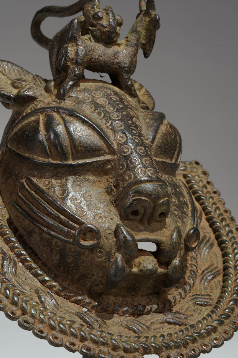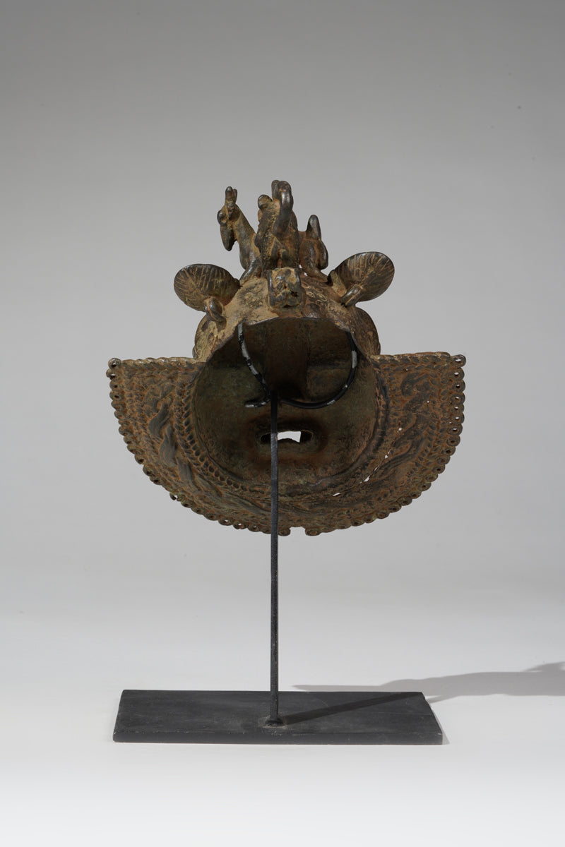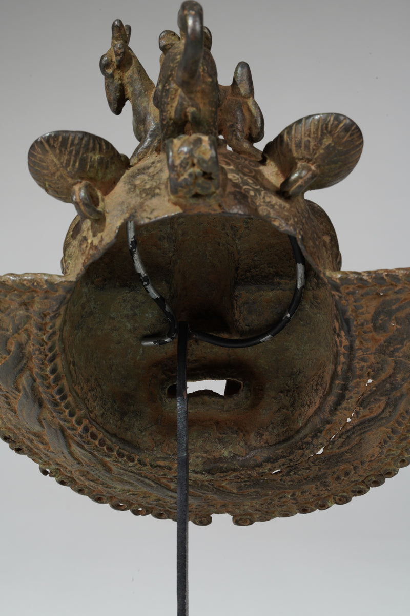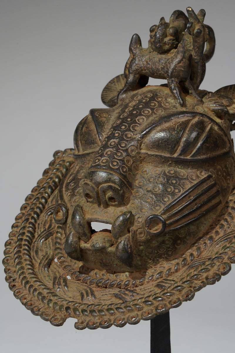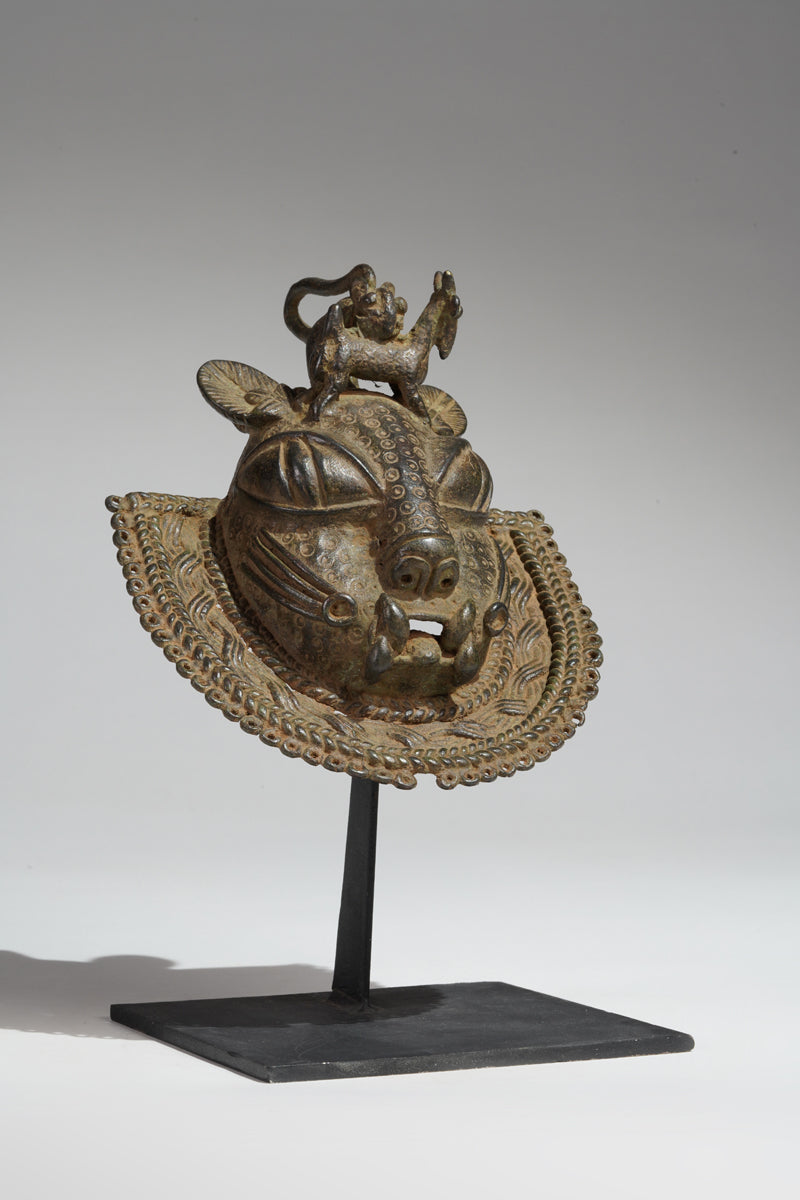 Uhunmwu-Ẹkuẹ are one of the best-known categories of Benin artworks. A range of human and animal heads are depicted, hence the term ‘mask’, although they were not used to cover the face. Sometimes known as ‘hip masks’, they may be worn on the belt or hung at the hip as seen cast on relief plaques and in the carved motifs on altar tusks. Many pendant masks have a series of eyelets around the edge of the lower portion, to which small crotal bells were attached, and as the wearer moved they would have chimed.