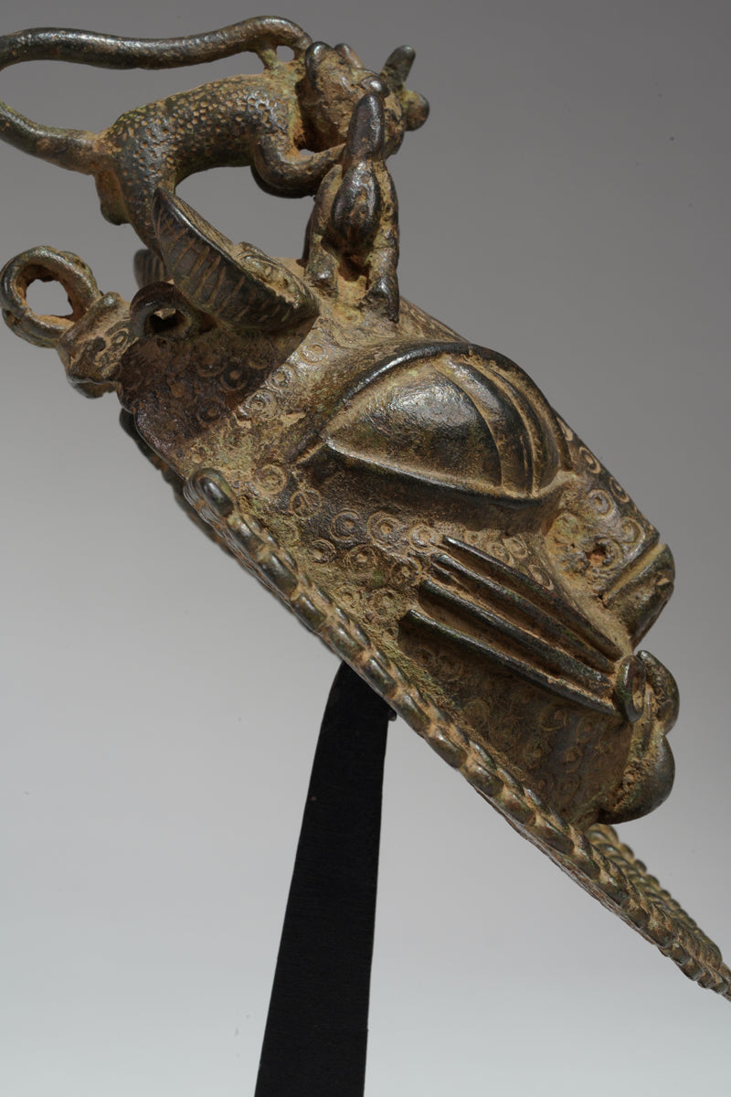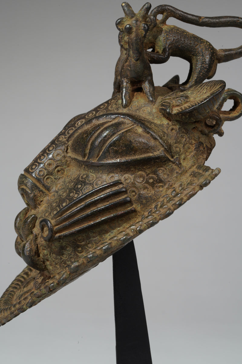 Benin hip masks and pendants depicting leopards—especially in the style of the Benin bronzes—are powerful symbols that originate from the Benin Kingdom (in present-day Edo State, Nigeria). These artifacts are part of a larger body of royal and ceremonial art created by the Edo people, primarily from the 13th to 19th centuries.