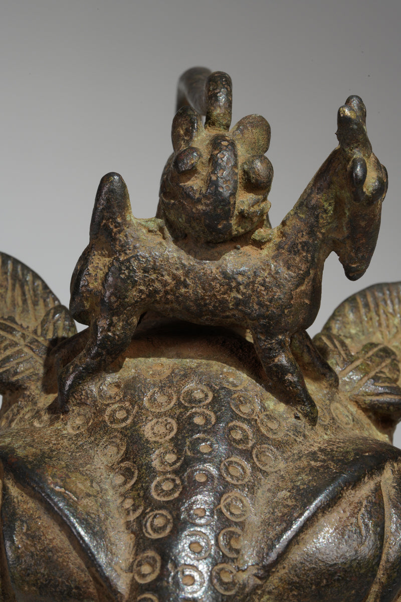An Uhunmwu-Ẹkuẹ bronze leopard pendant or hip mask, Nigeria, on top a leopard hunting an antelope.