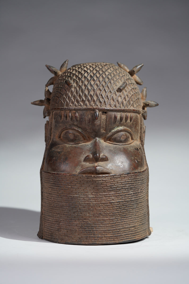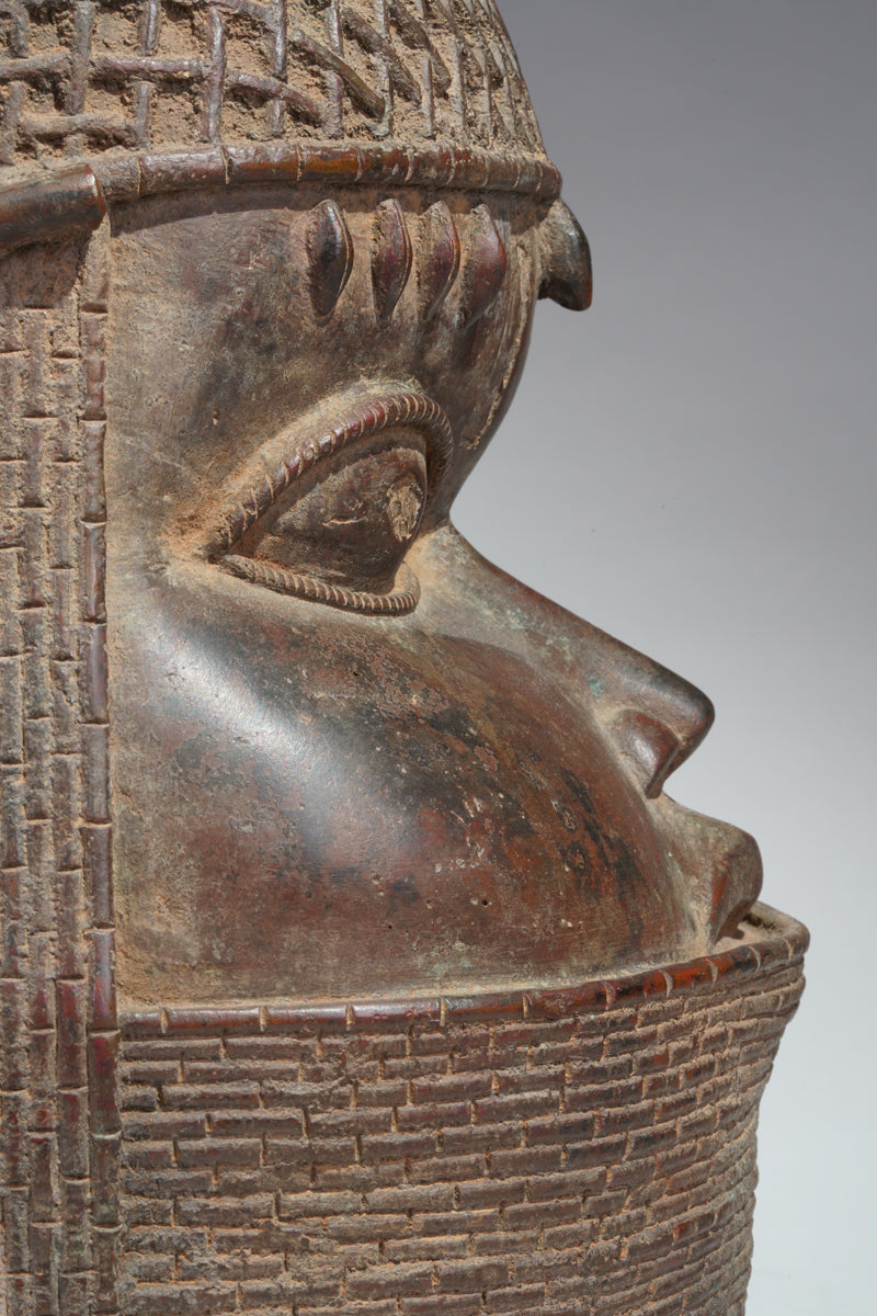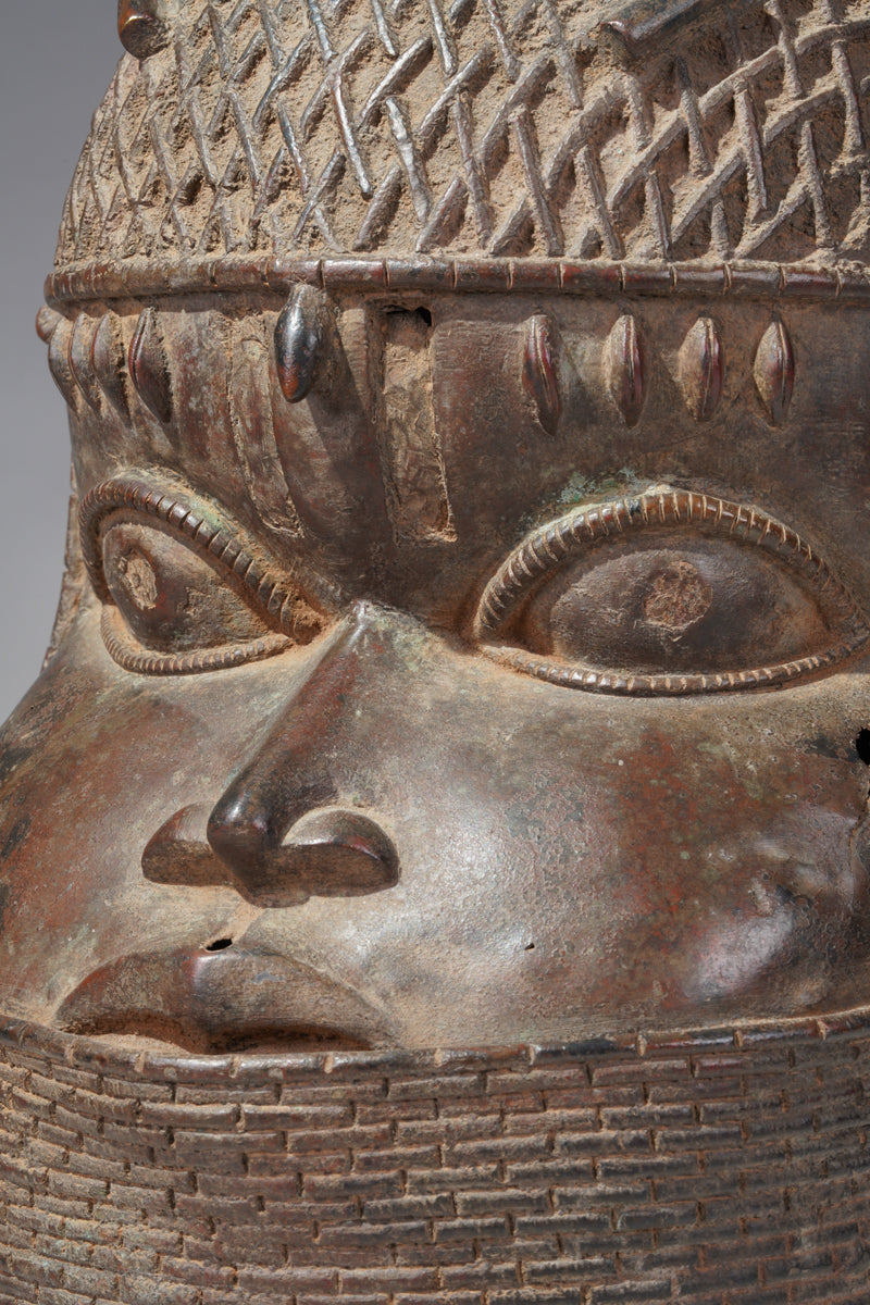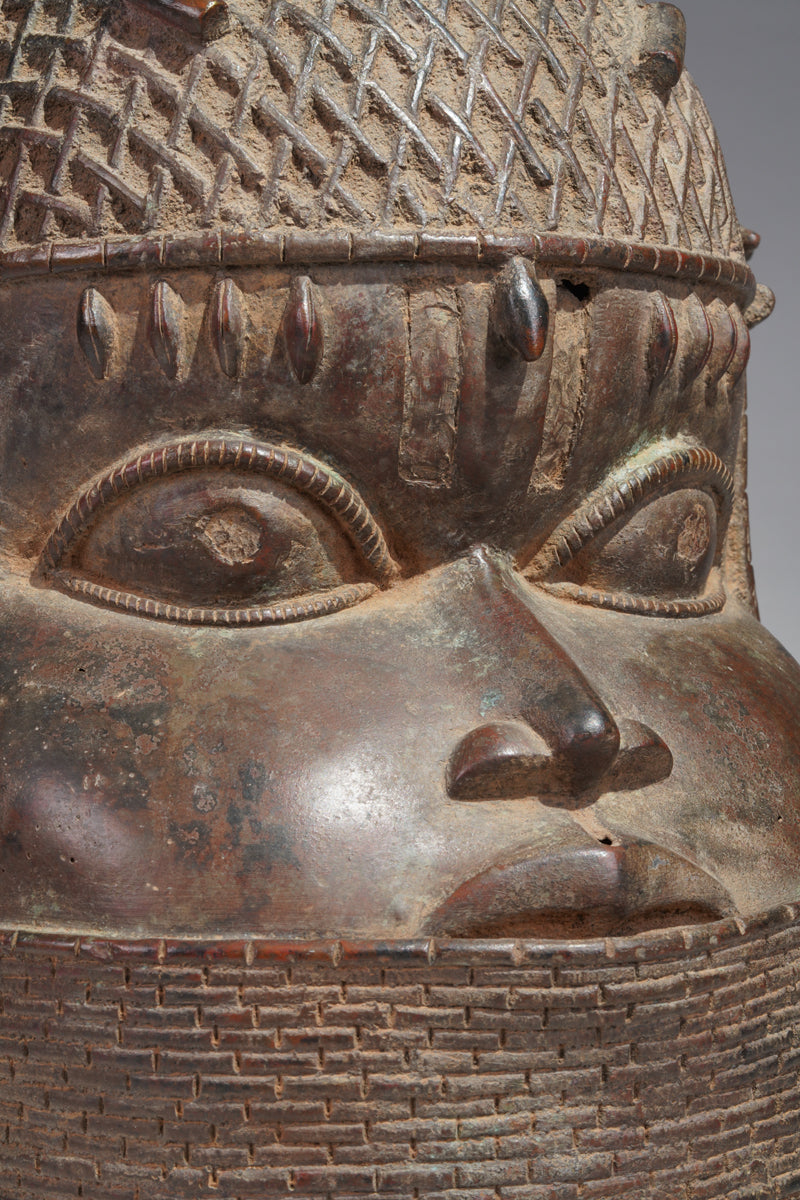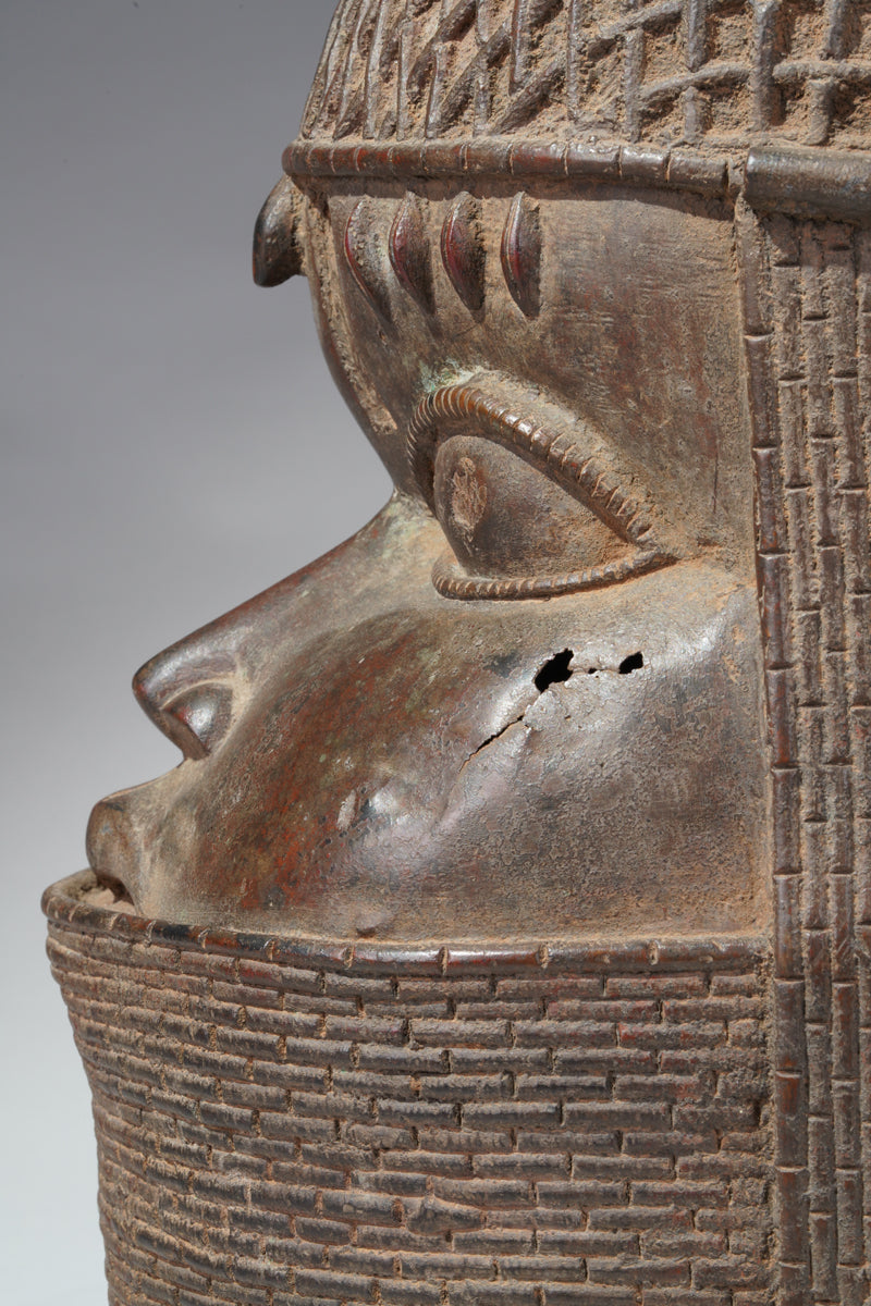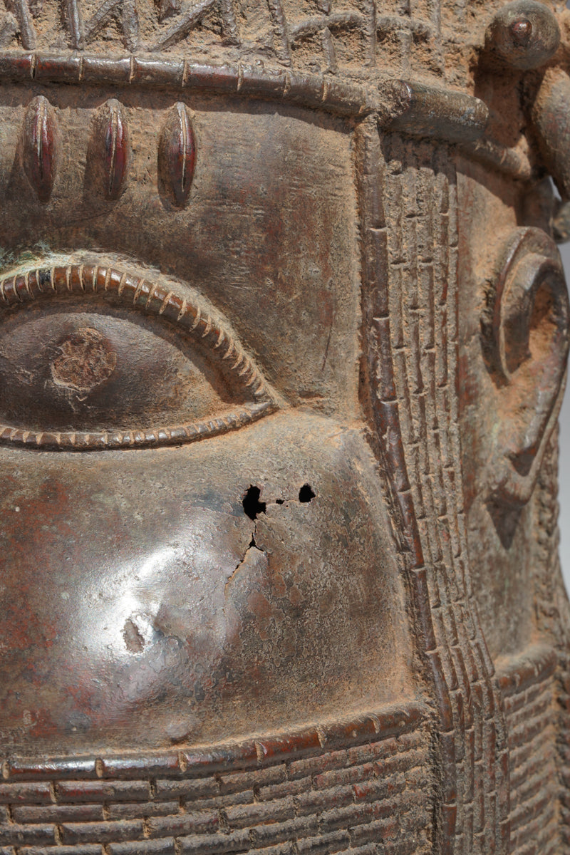 An Uhunmwu-Elao commemorative head of an Ọba, in the style of Benin, casted in bronze, iron inlays as pupils, regalia of coral beads, a cap-like crown and a high collar of coral necklaces, symbolizing the power and dignity of the Oba. Different layers of encrusted oxidations. The Uhunmwu-Elao commemorative head has not been cleaned and is nevertheless relatively well preserved. It shows only traces of a dust patina and breakouts, which are difficult to determine whether they are minor casting defects or whether they were caused by corrosion.