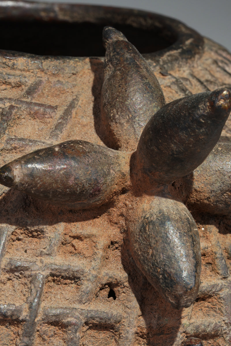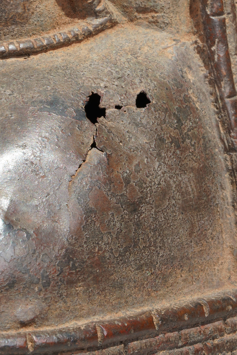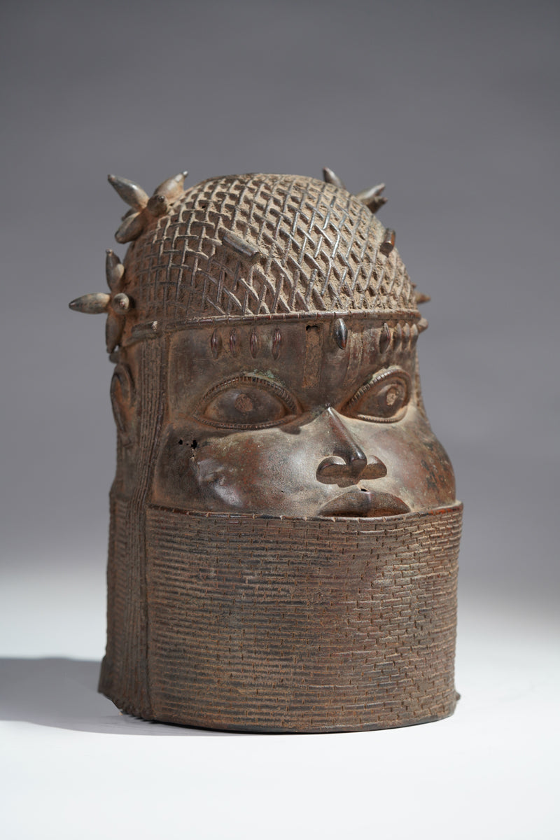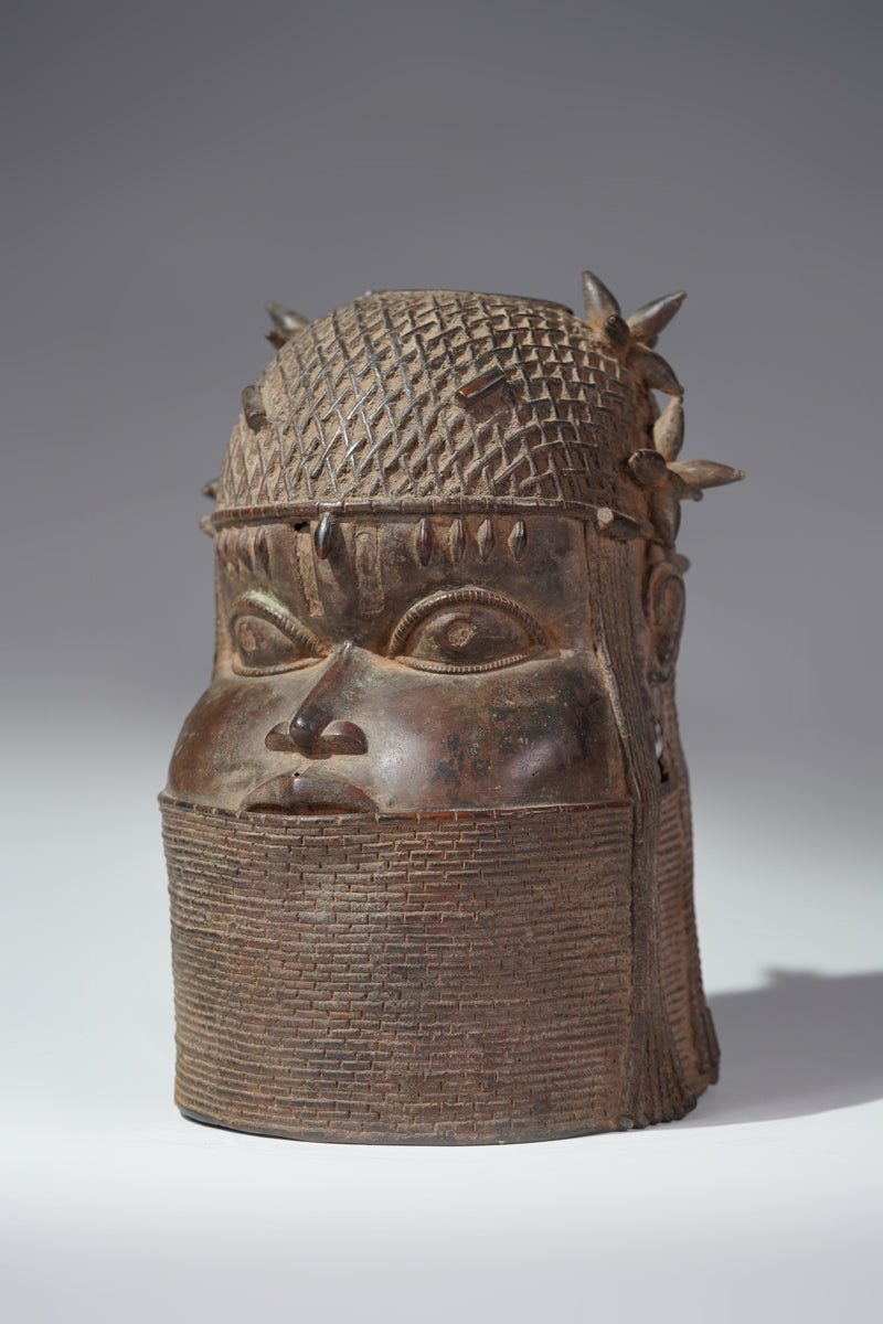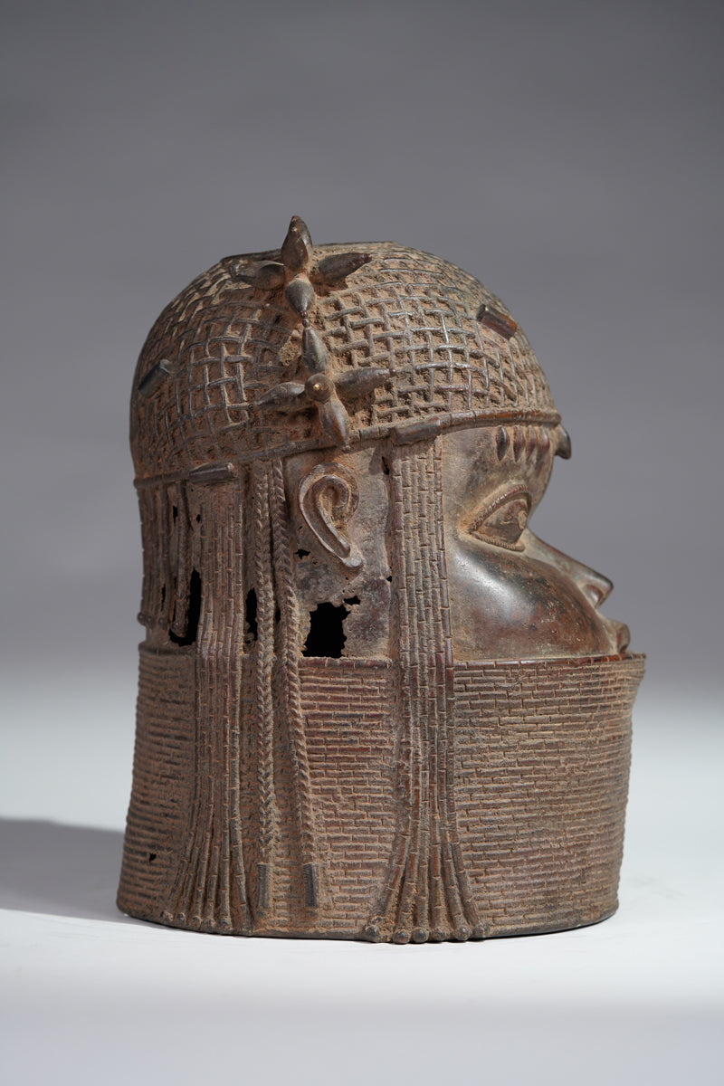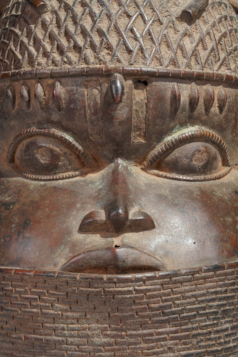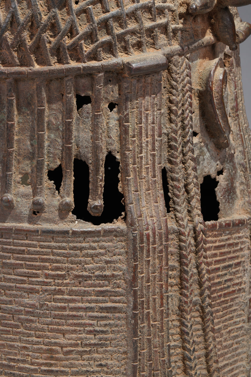 An Uhunmwu-Elao commemorative head of an Ọba, in the style of Benin, casted in bronze, iron inlays as pupils, regalia of coral beads, a cap-like crown and a high collar of coral necklaces, symbolizing the power and dignity of the Oba. Different layers of encrusted oxidations. The Uhunmwu-Elao commemorative head has not been cleaned and is nevertheless relatively well preserved. It shows only traces of a dust patina and breakouts, which are difficult to determine whether they are minor casting defects or whether they were caused by corrosion.