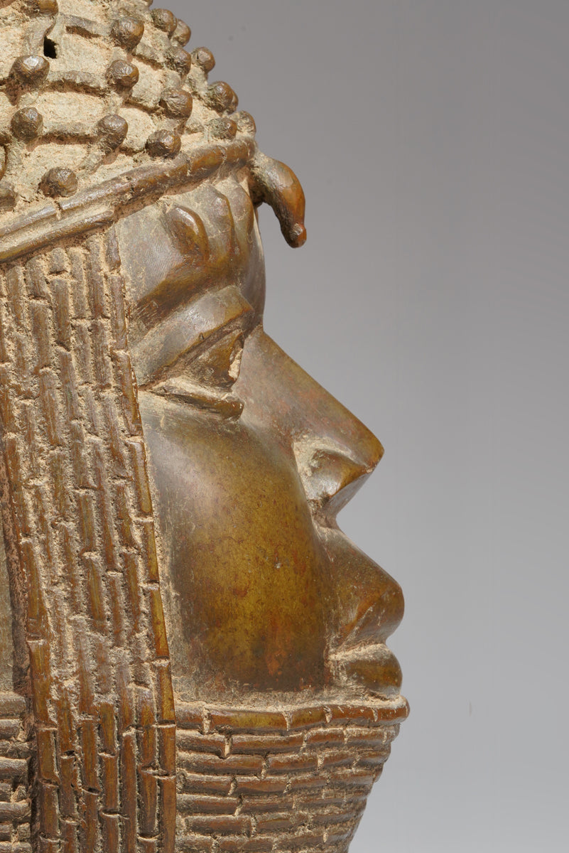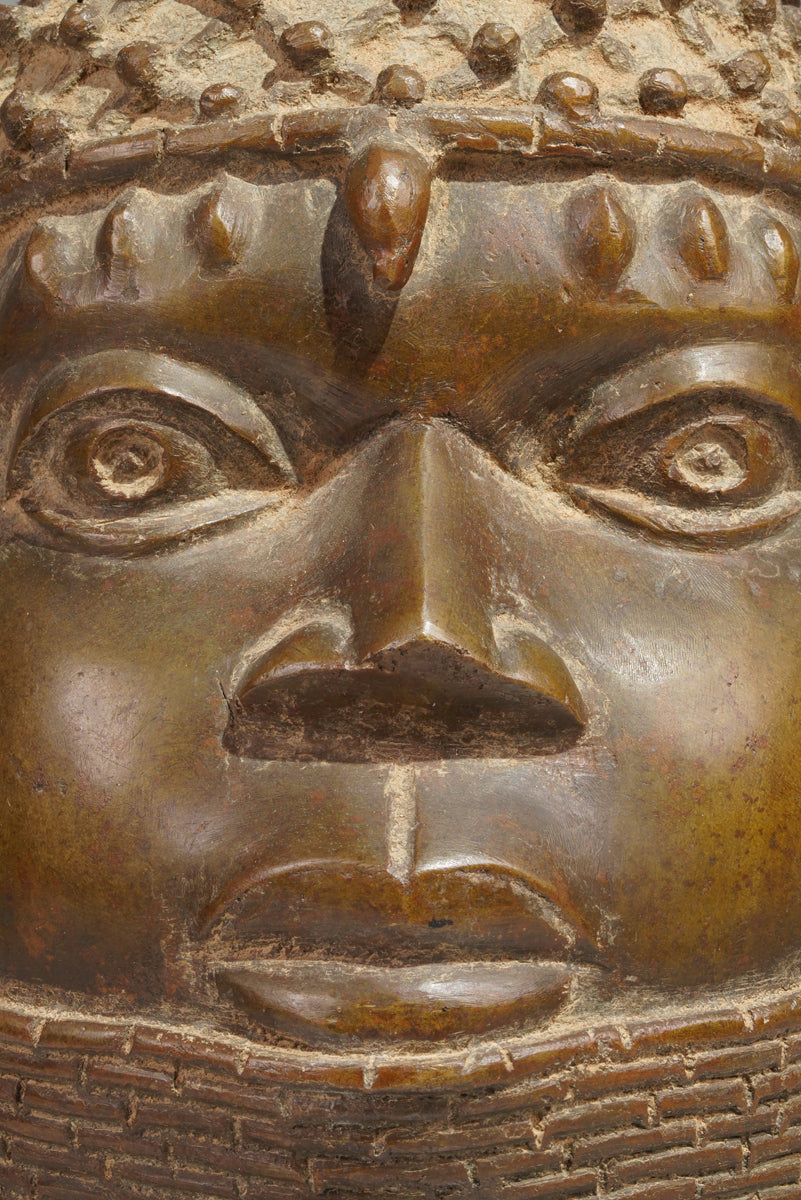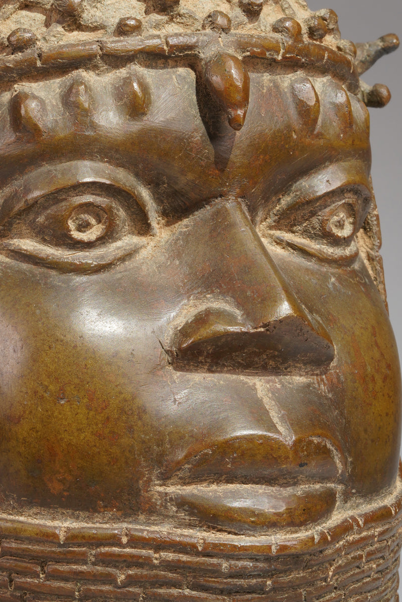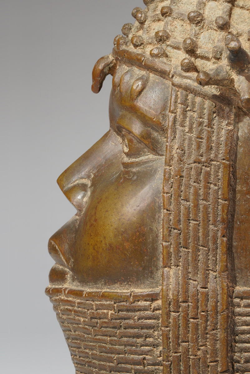 The commemorative heads that have survived in large numbers from this period are strongly formalized. Their faces are largely identical, but the royal insignia are more elaborate and their shapes vary. What they all have in common is the cap made of coral beads. Various motifs on a plinth around the base refer to the king's spiritual power. At the same time, the heads are becoming larger and their wall thickness is significantly thicker. In fact, on the altars of the 18th and 19th centuries, the commemorative heads also serve as a basis for large elephant teeth carved with motifs that were depicted on the relief panels in the early days of Benin, in the 16th and 17th centuries.