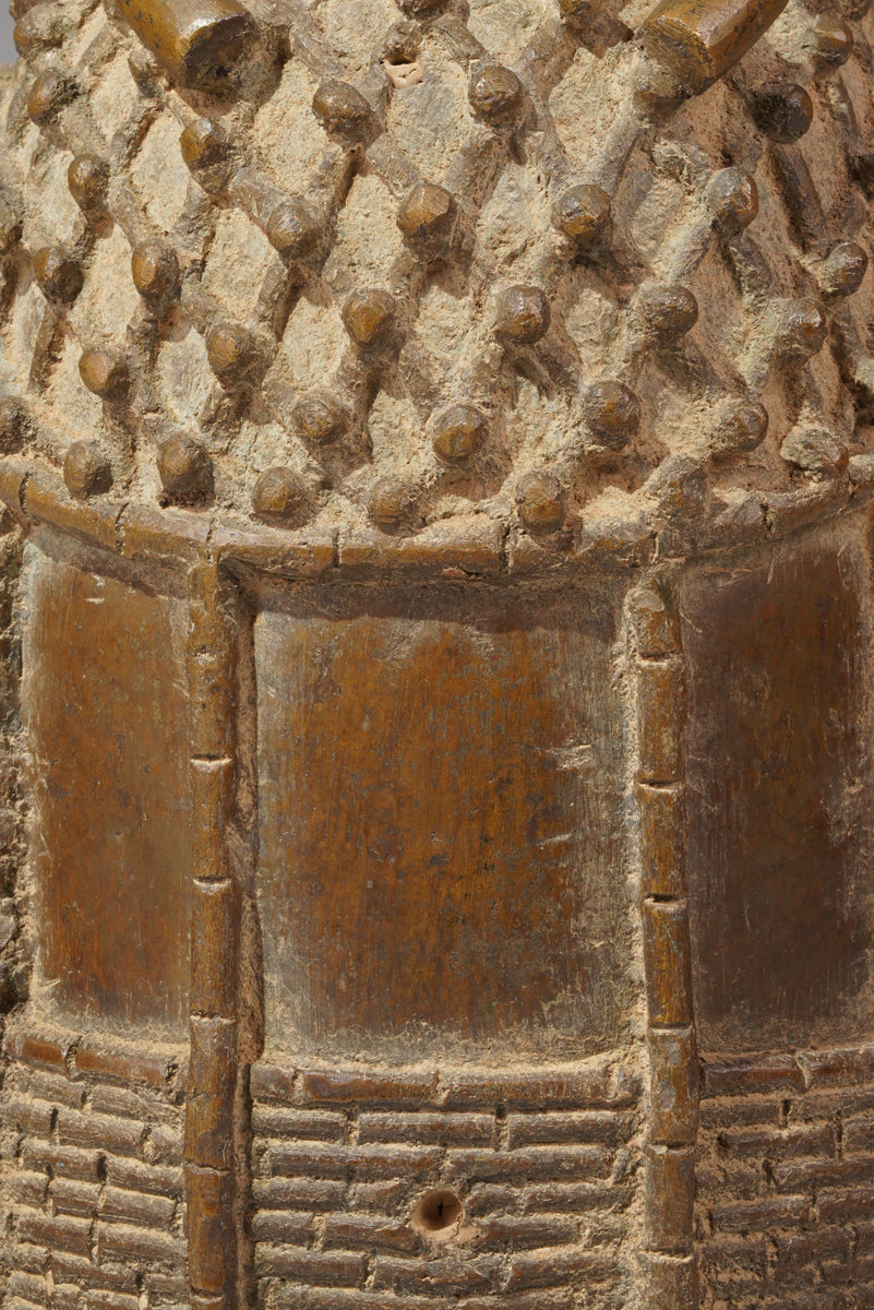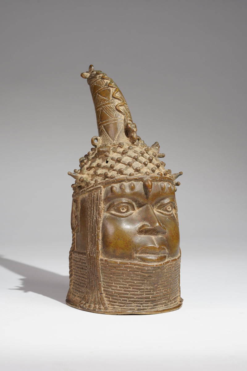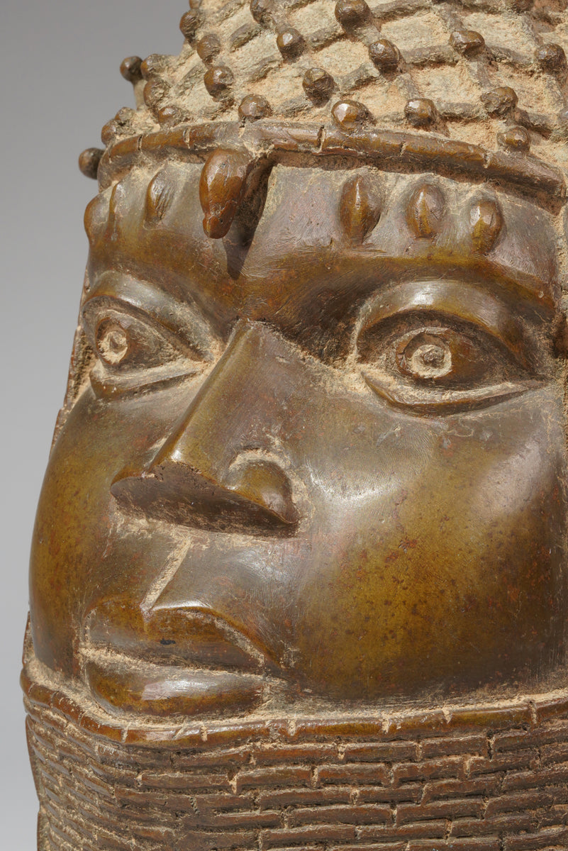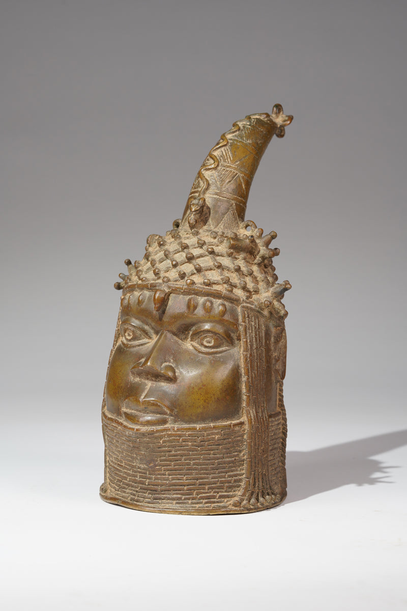 The commemorative heads that have survived in large numbers from this period are strongly formalized. Their faces are largely identical, but the royal insignia are more elaborate and their shapes vary. What they all have in common is the cap made of coral beads. Various motifs on a plinth around the base refer to the king's spiritual power. At the same time, the heads are becoming larger and their wall thickness is significantly thicker. In fact, on the altars of the 18th and 19th centuries, the commemorative heads also serve as a basis for large elephant teeth carved with motifs that were depicted on the relief panels in the early days of Benin, in the 16th and 17th centuries.