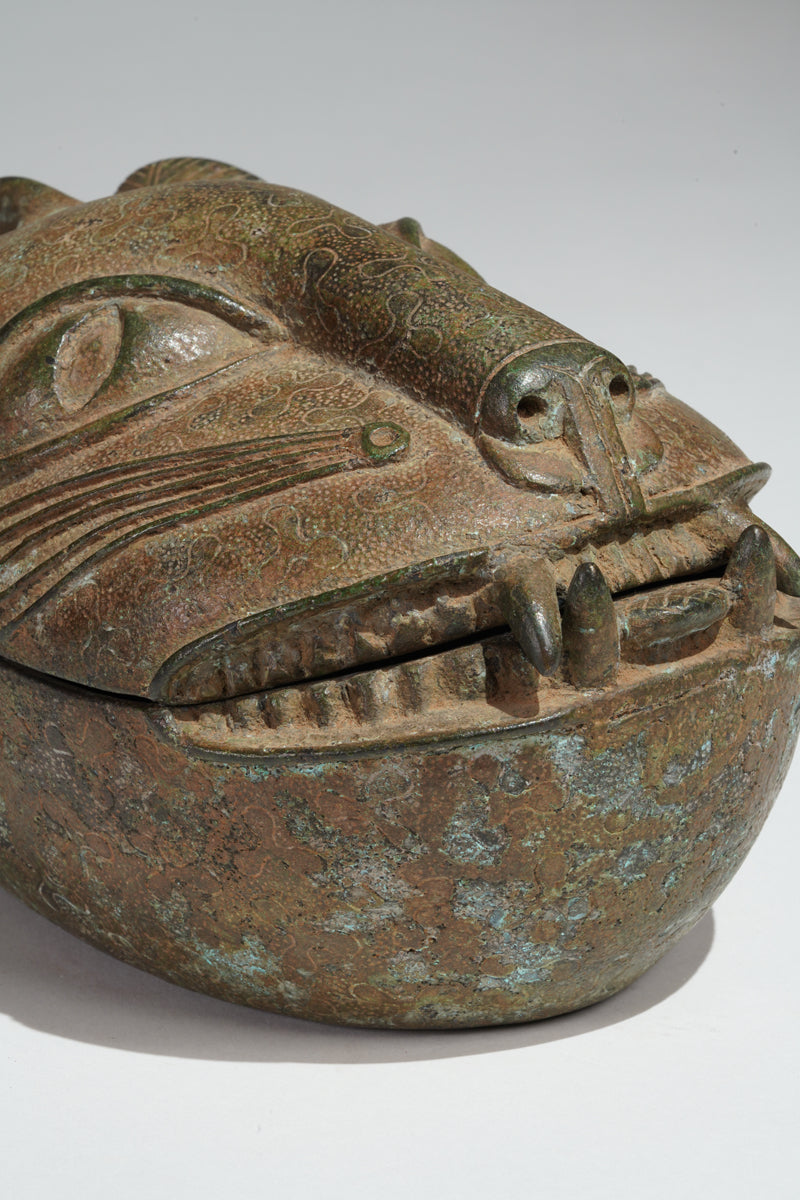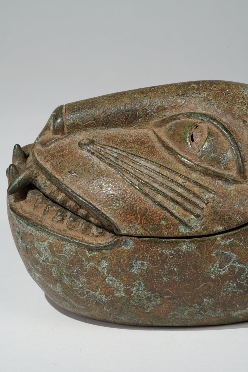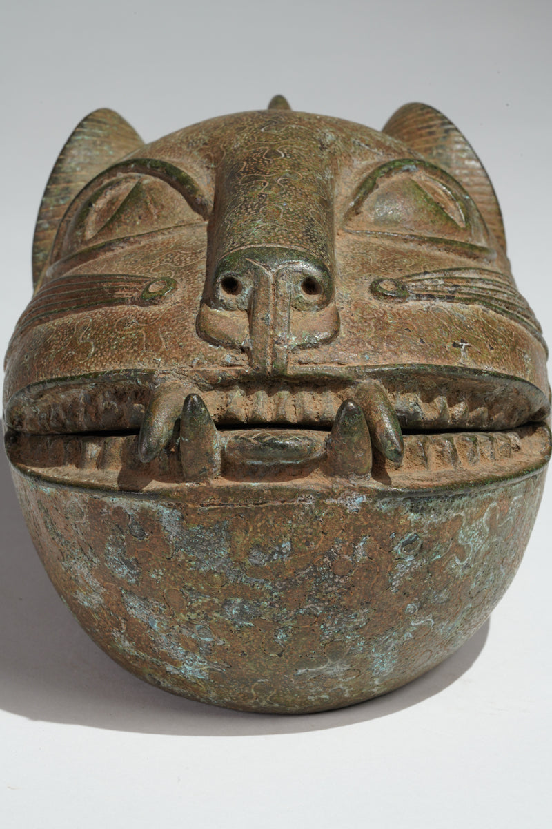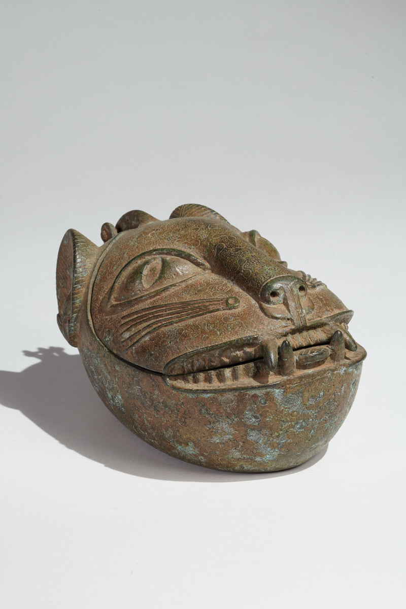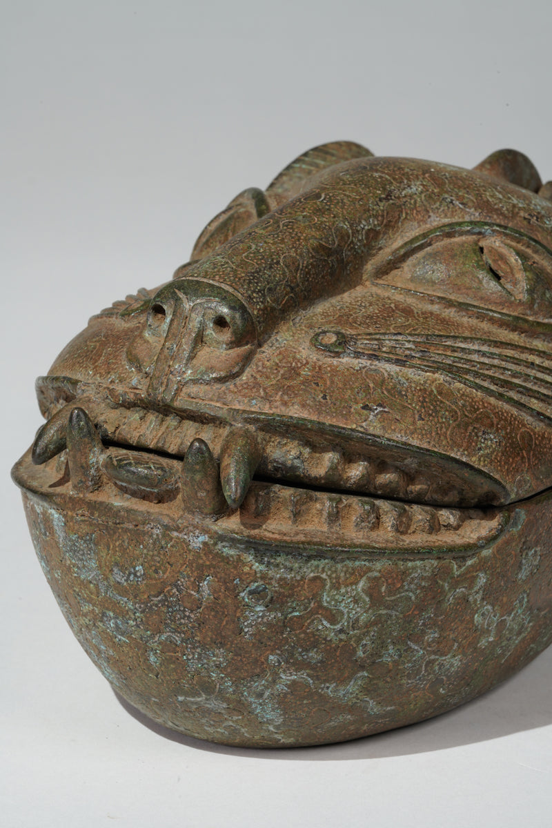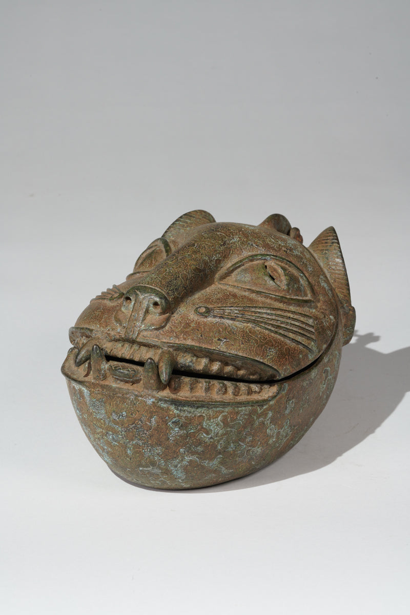 An Uzokpo (lidded bowls) bronze leopard container for kola nuts or for storing regalia or ritual items. Often decorated and important in court life. Nigeria, high aged, signs of use and greenish oxidised patina.