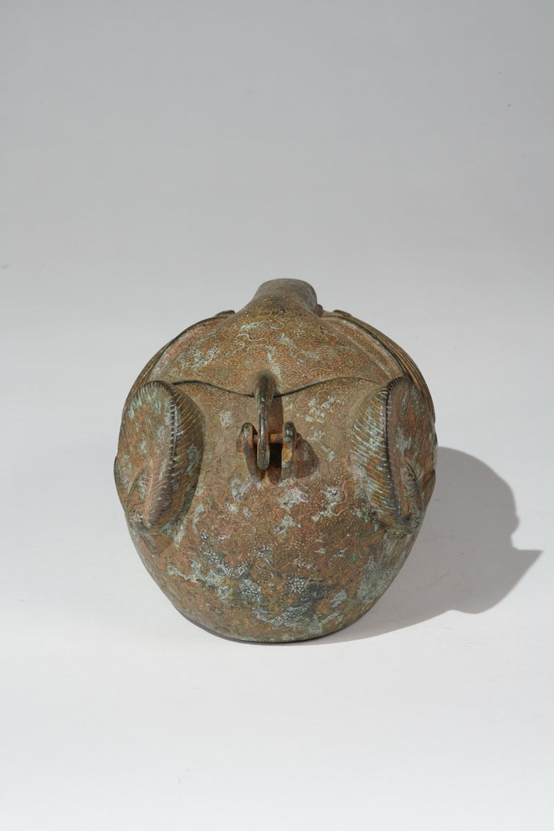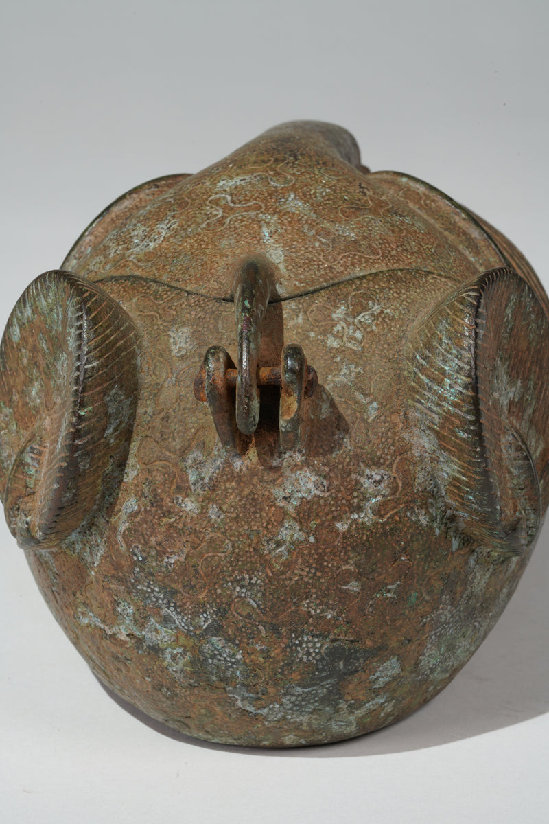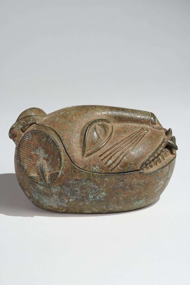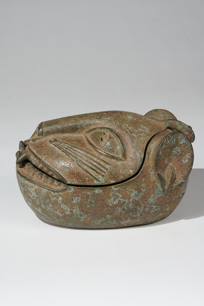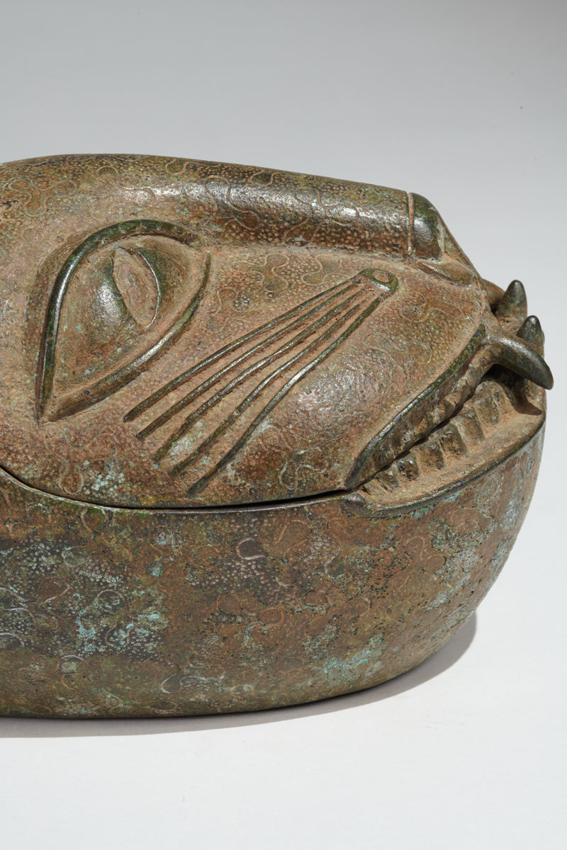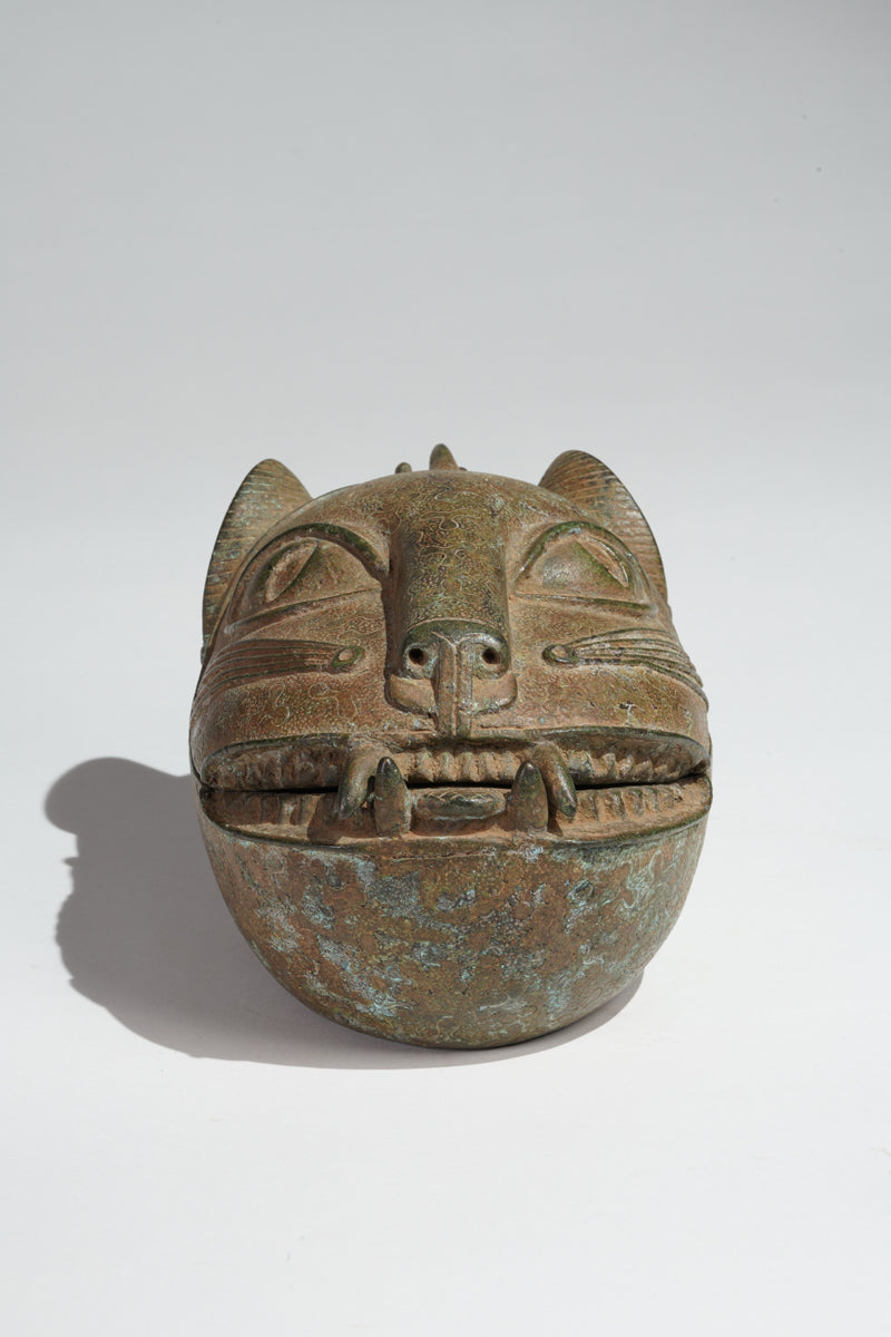 An Uzokpo (lidded bowls) bronze leopard container for kola nuts or for storing regalia or ritual items. Often decorated and important in court life. Nigeria, high aged, signs of use and greenish oxidised patina.