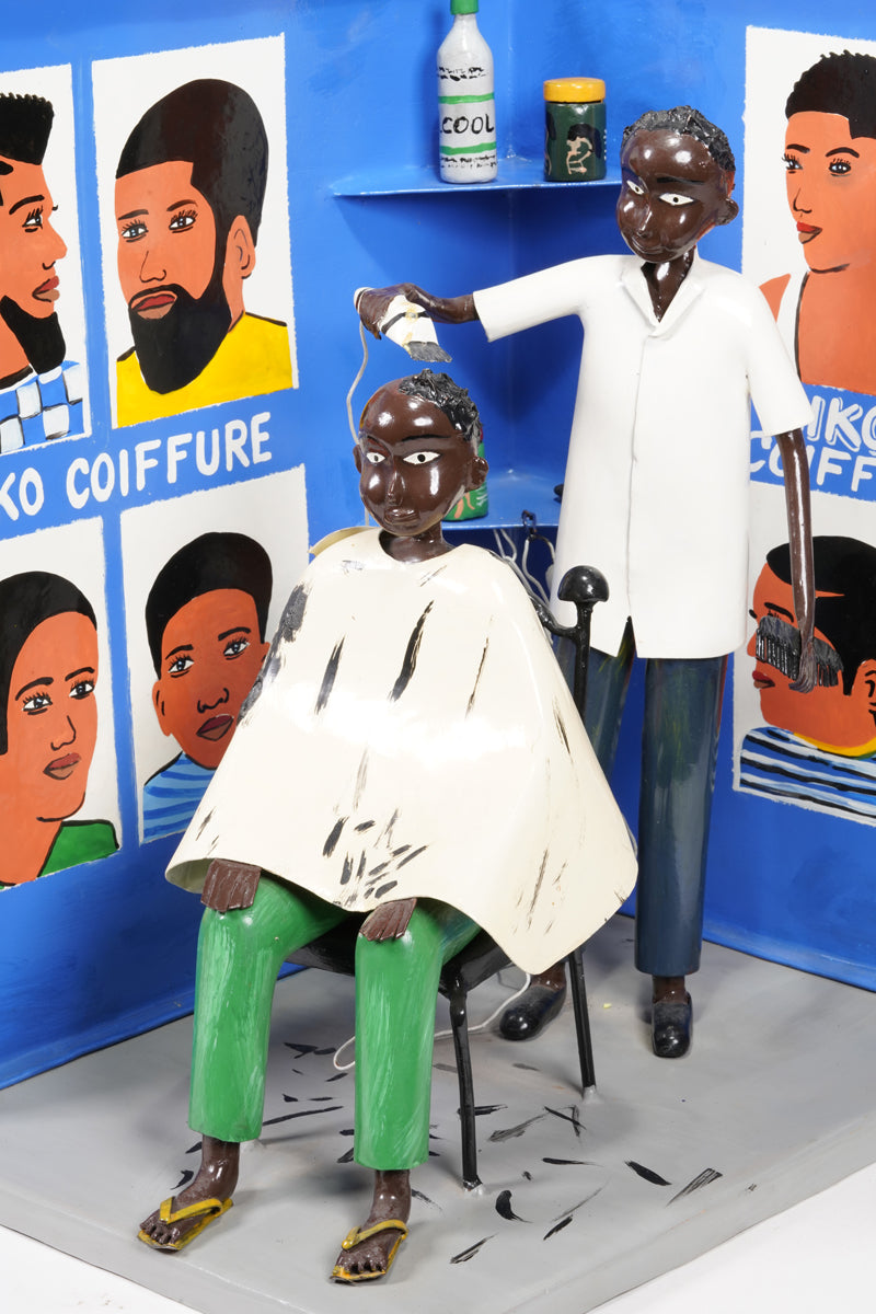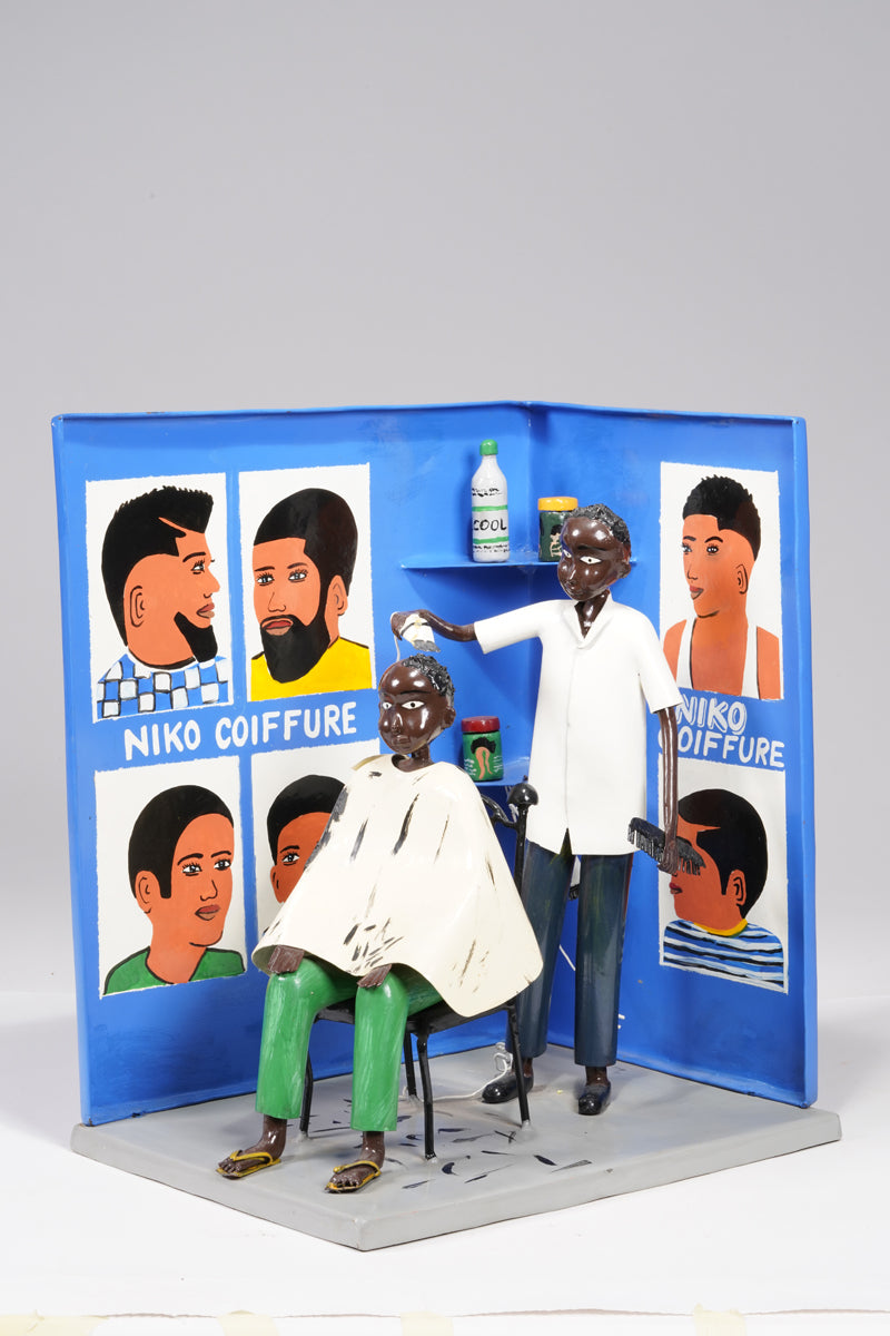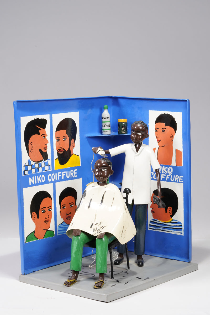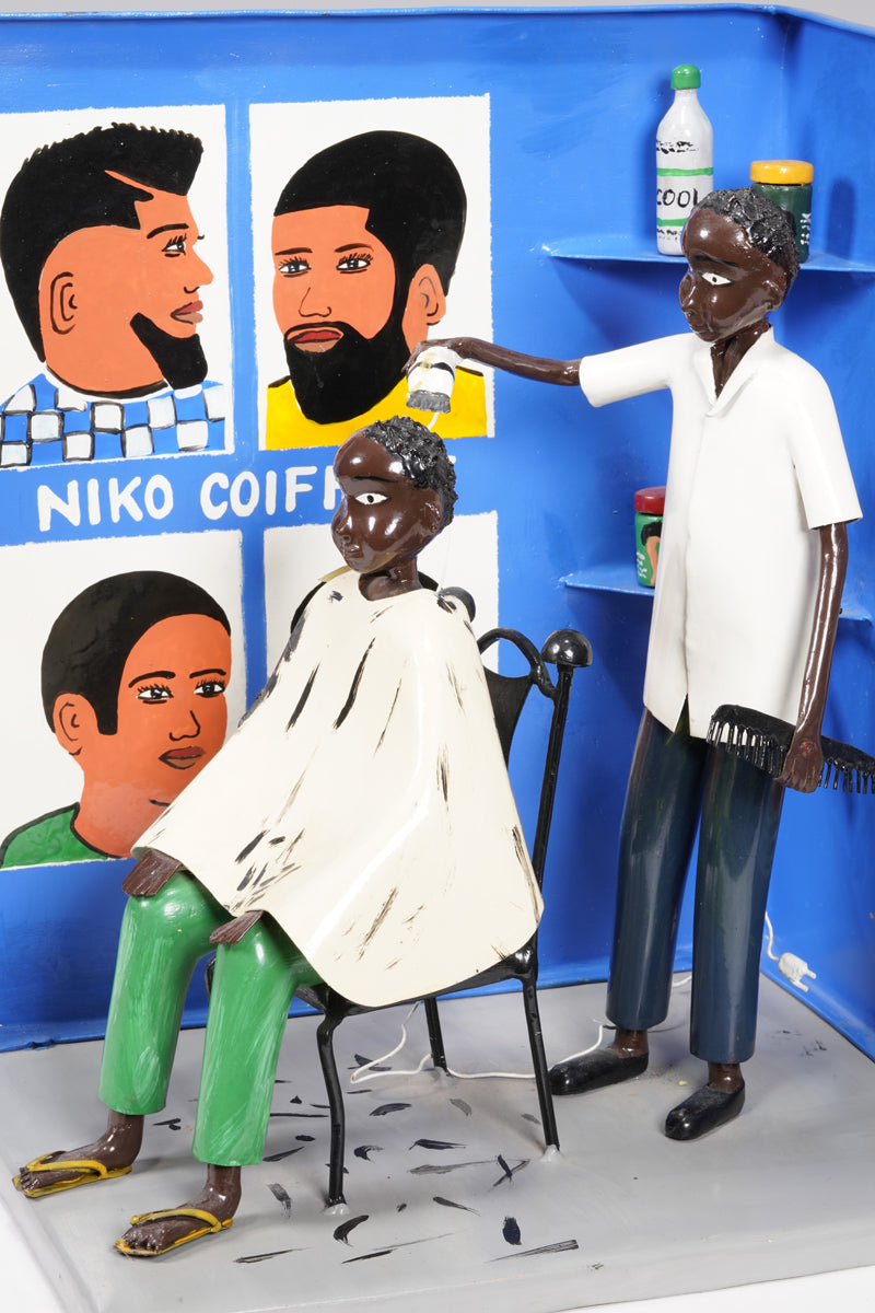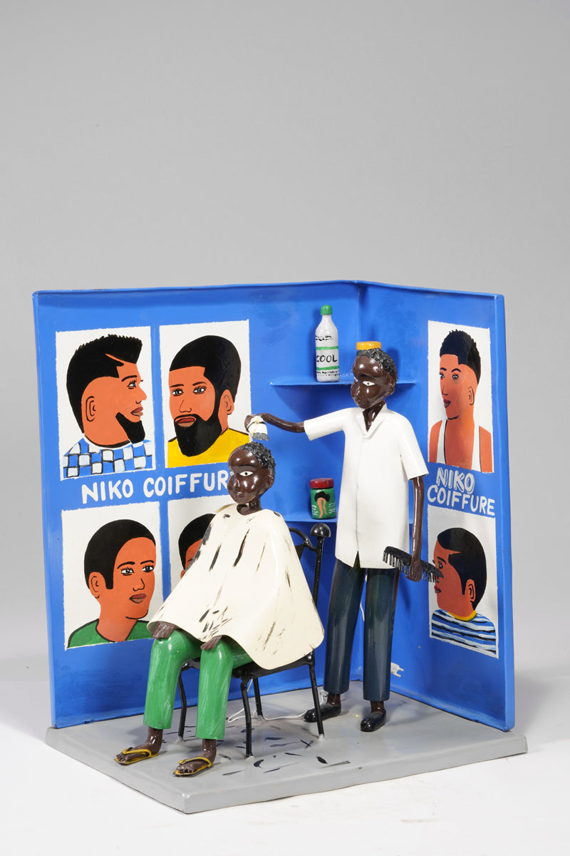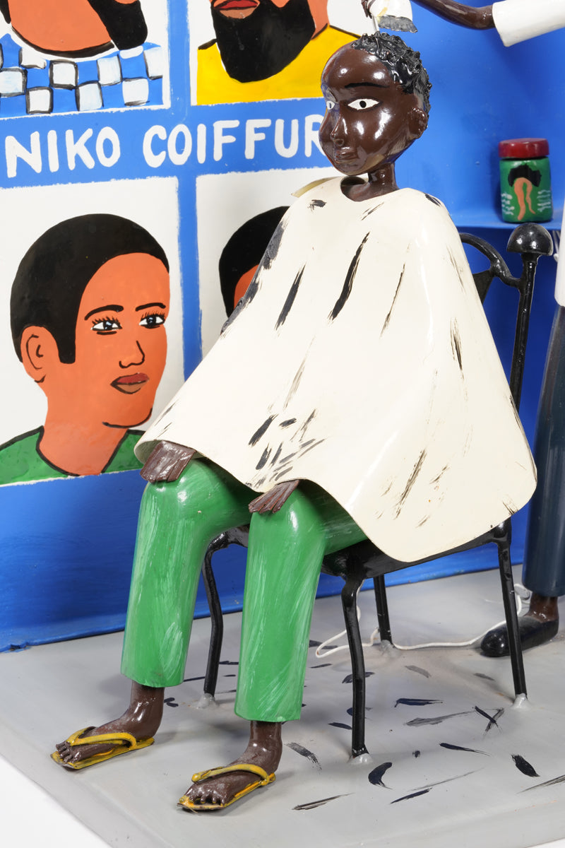 Didier Ahadsi, born 1970, near Lomé, Togo Didier Ahadsi, born 1970, near Lomé, Togo. barbershop scene where a customer sits in an onrnamentally curve-top chair in sandals, green pants, and a cream-colored cap. On the cape and grey floor, flecks of black paint represent cut hair. The barber, in shoes, black pants, and white shirt holds an electric razer and comb. On the blue walls are painted six portriats that portray various mens' hairstyles and 'Niko Coiffure', the shop's name. Two corner wall shelves hold three jars of hair products and another electric clipper.