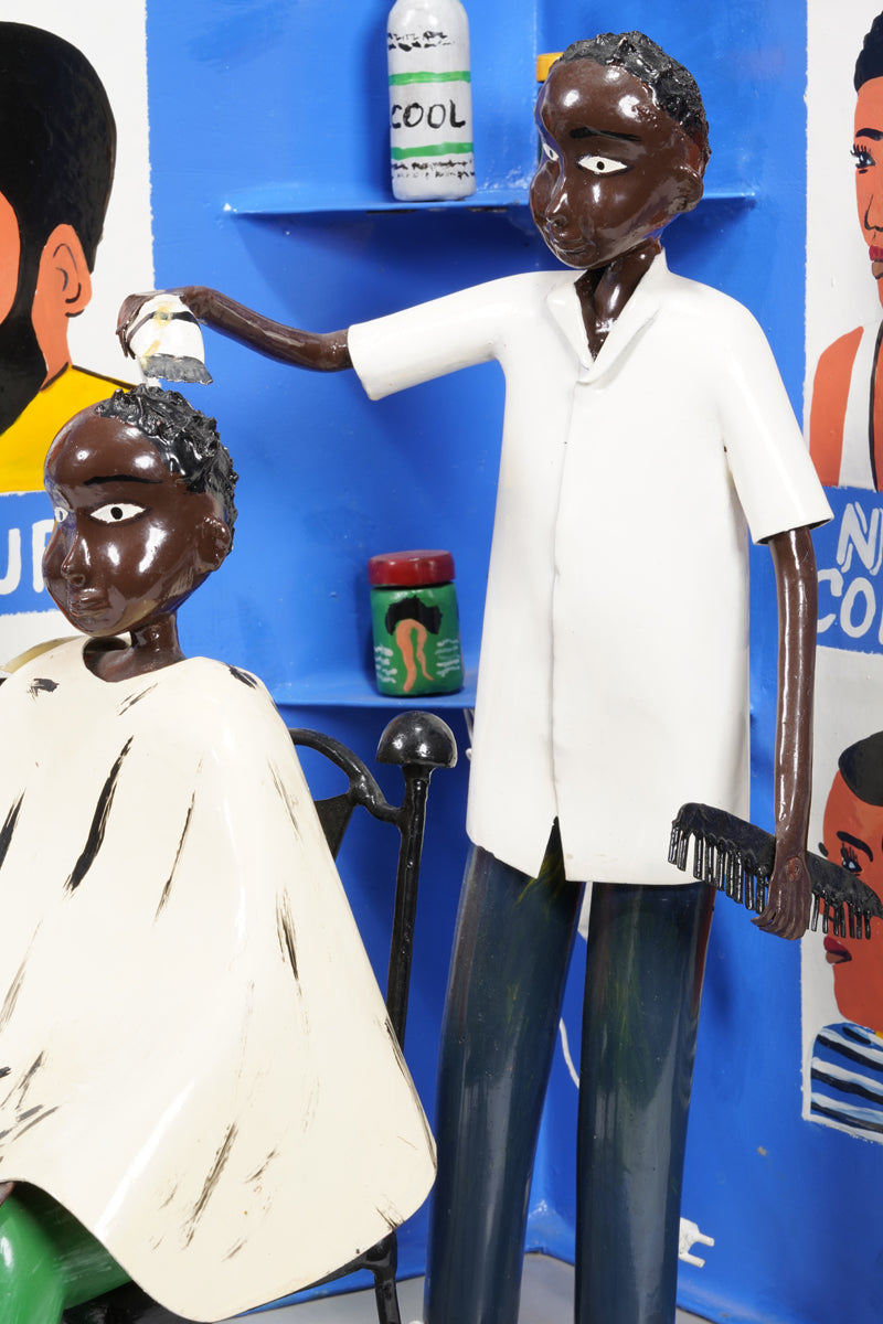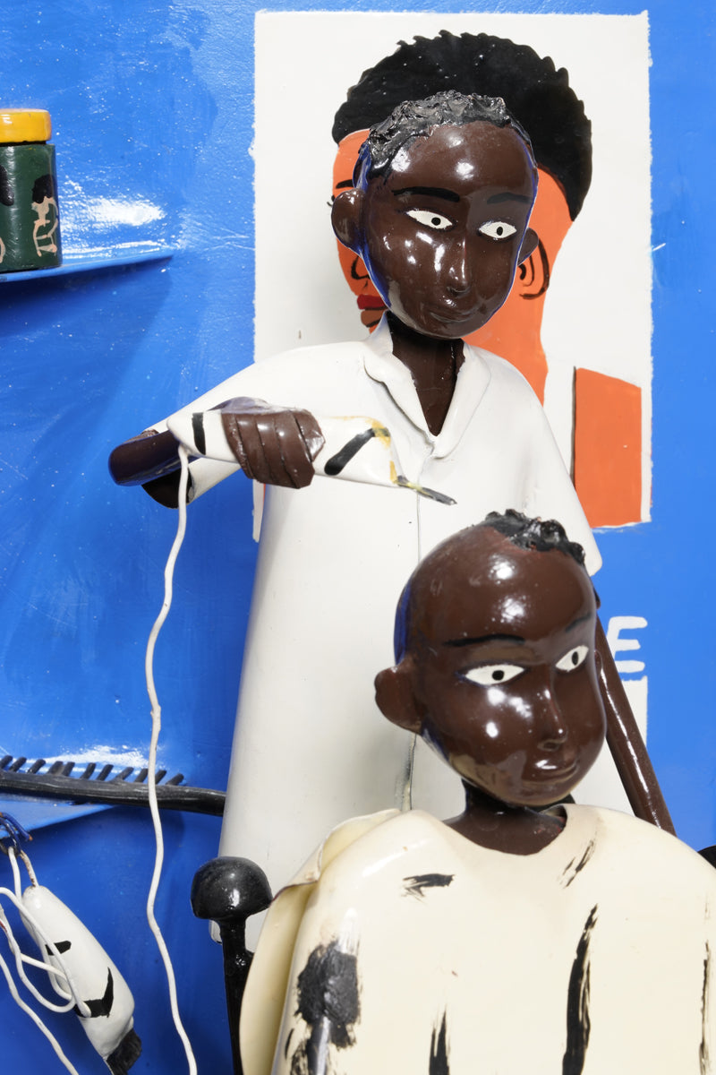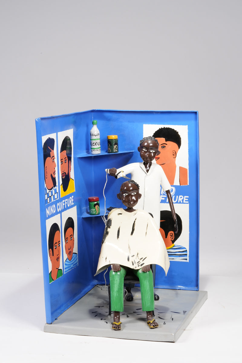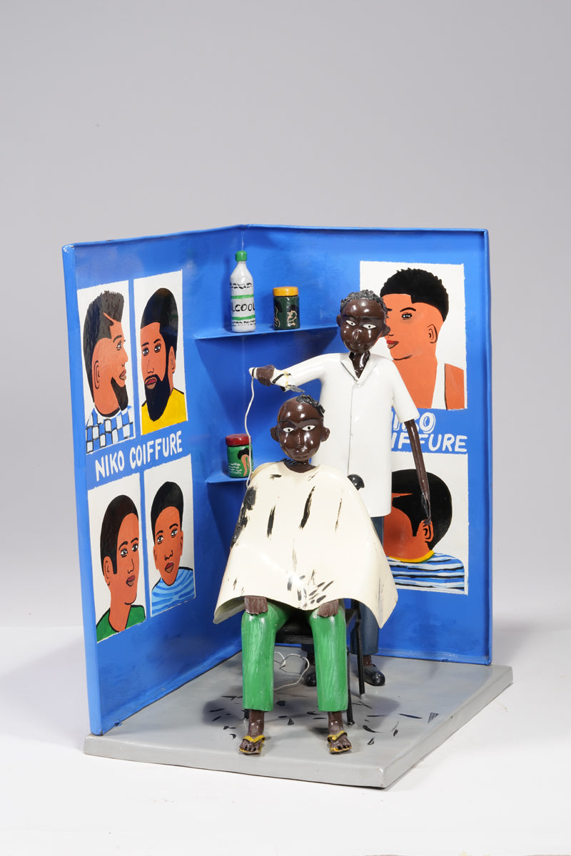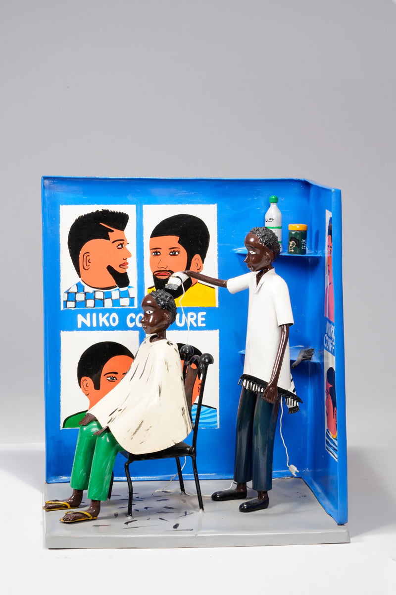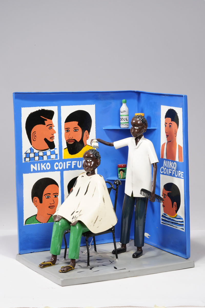Didier Ahadsi, born 1970, near Lomé, Togo Didier Ahadsi, born 1970, near Lomé, Togo. barbershop scene where a customer sits in an onrnamentally curve-top chair in sandals, green pants, and a cream-colored cap. On the cape and grey floor, flecks of black paint represent cut hair. The barber, in shoes, black pants, and white shirt holds an electric razer and comb. On the blue walls are painted six portriats that portray various mens' hairstyles and 'Niko Coiffure', the shop's name. Two corner wall shelves hold three jars of hair products and another electric clipper.