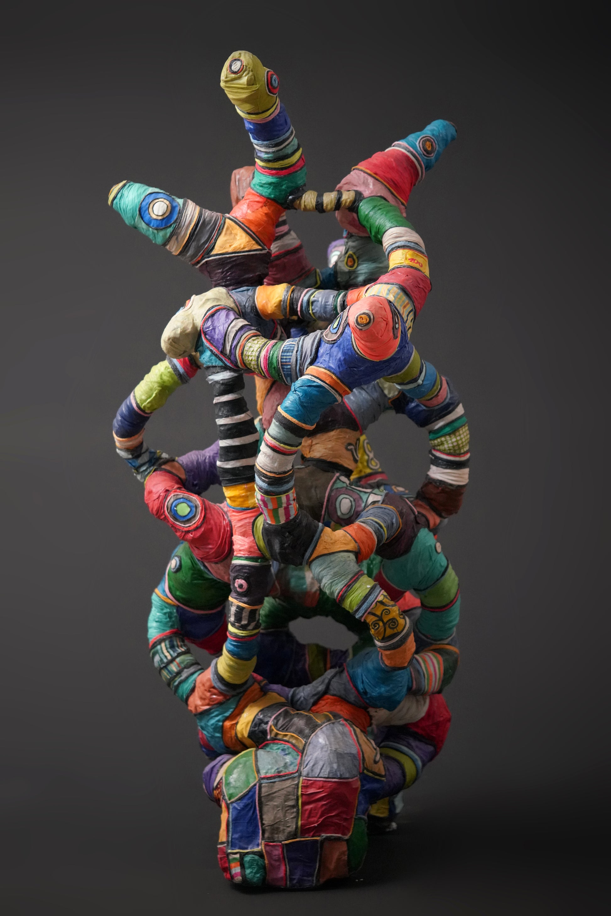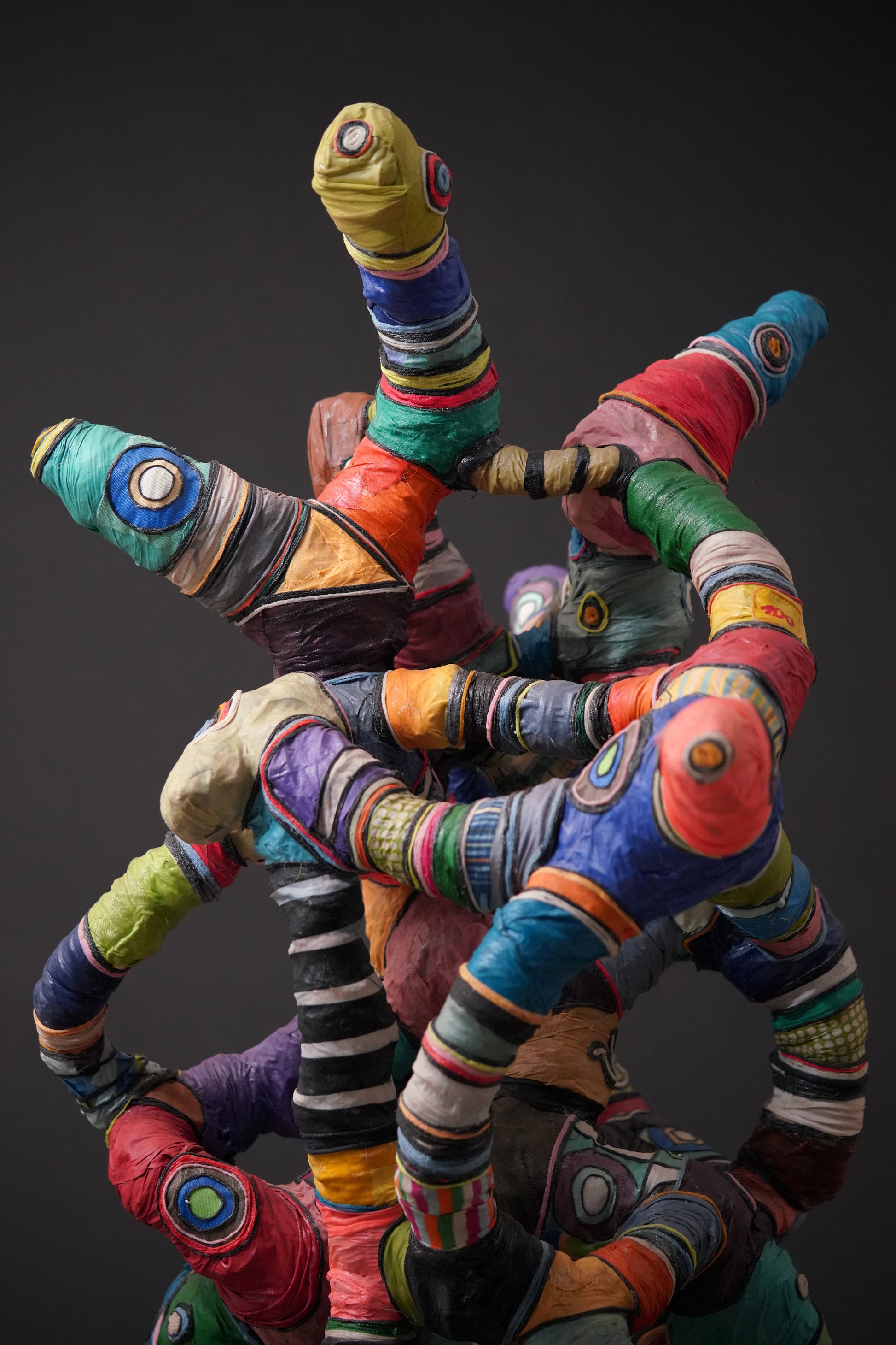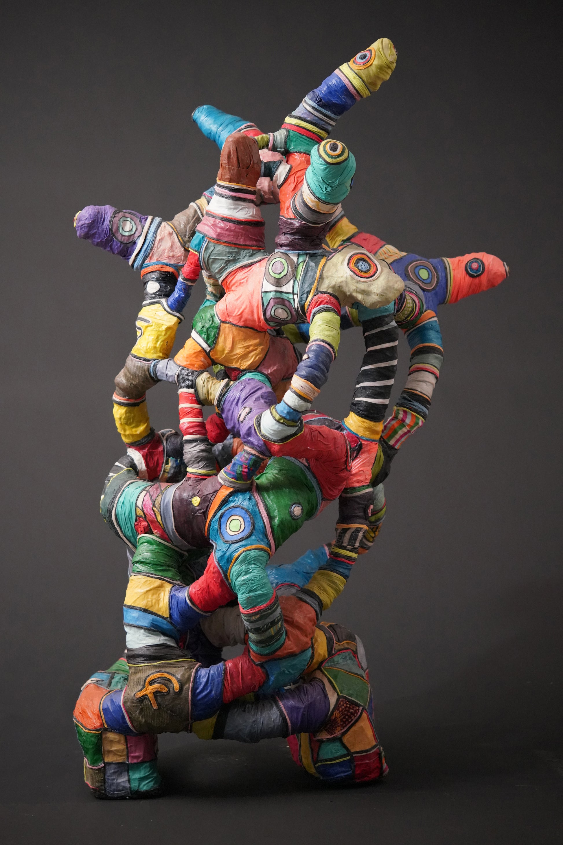 Contemporary artwork by Serge Anoumou, who endows his sculptures with intense colours, gifted at assembling and recycling, breathes new life into materials such as loincloth or fabric, woollen thread or rope, using them to create his large, complex sculptures.