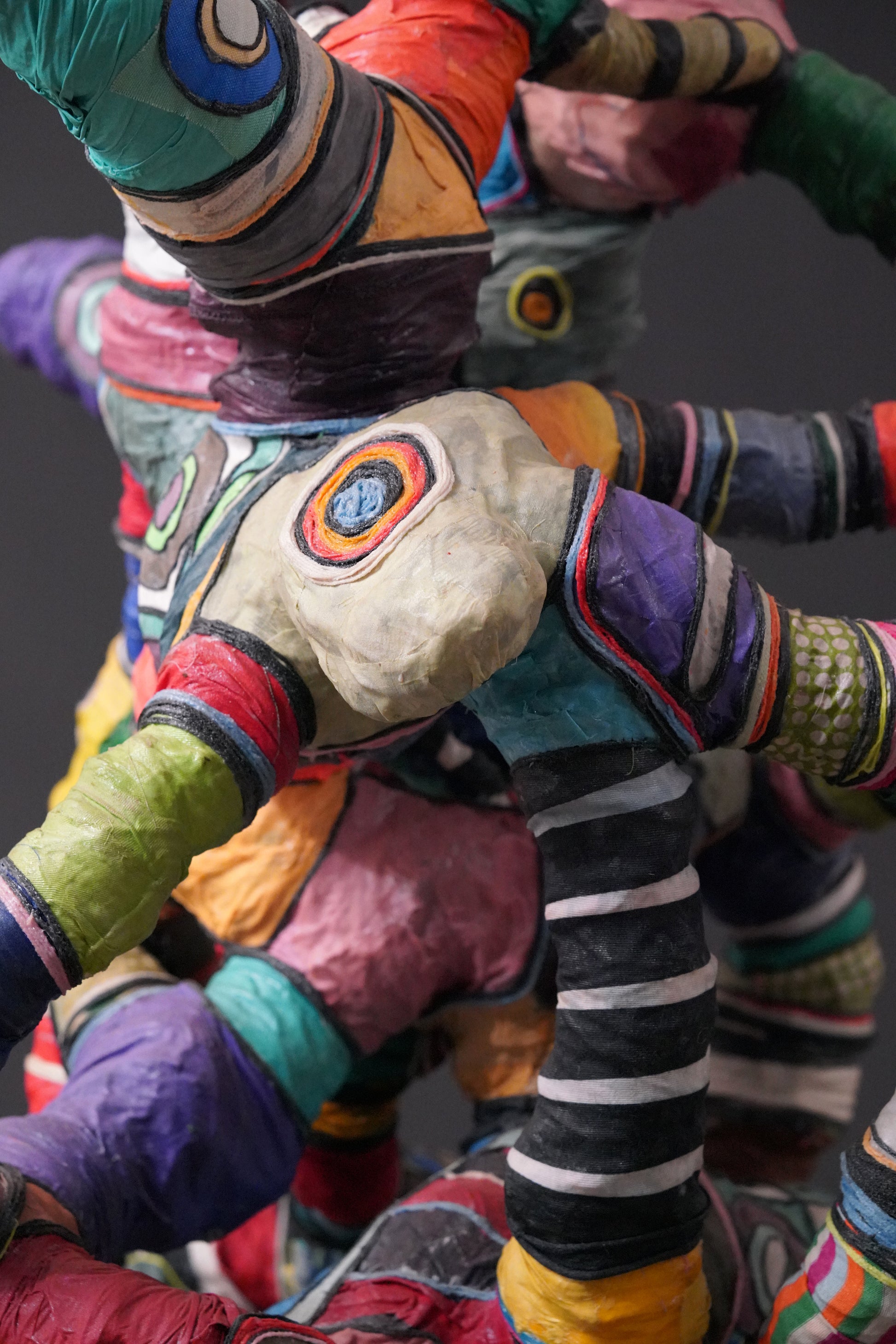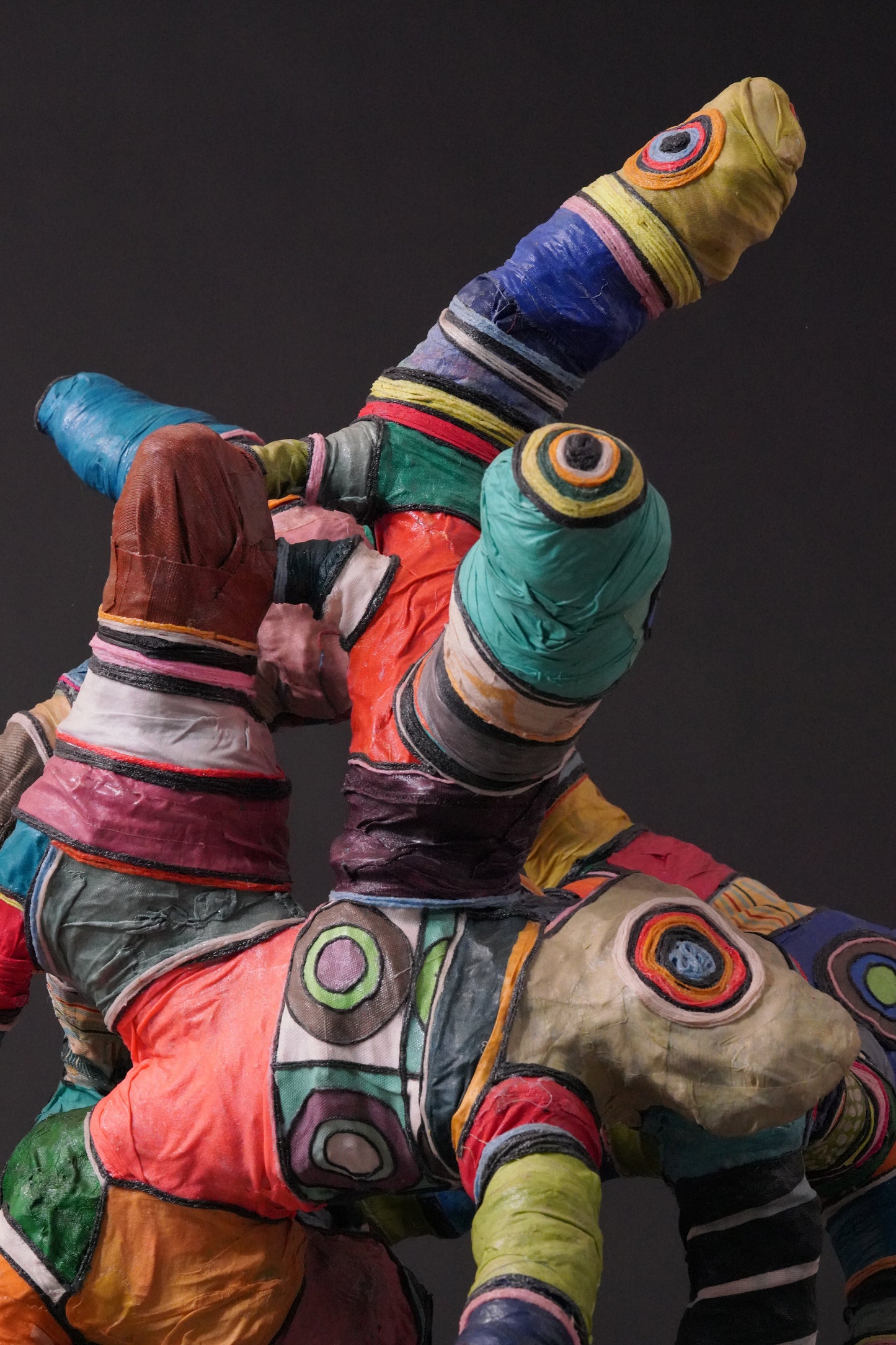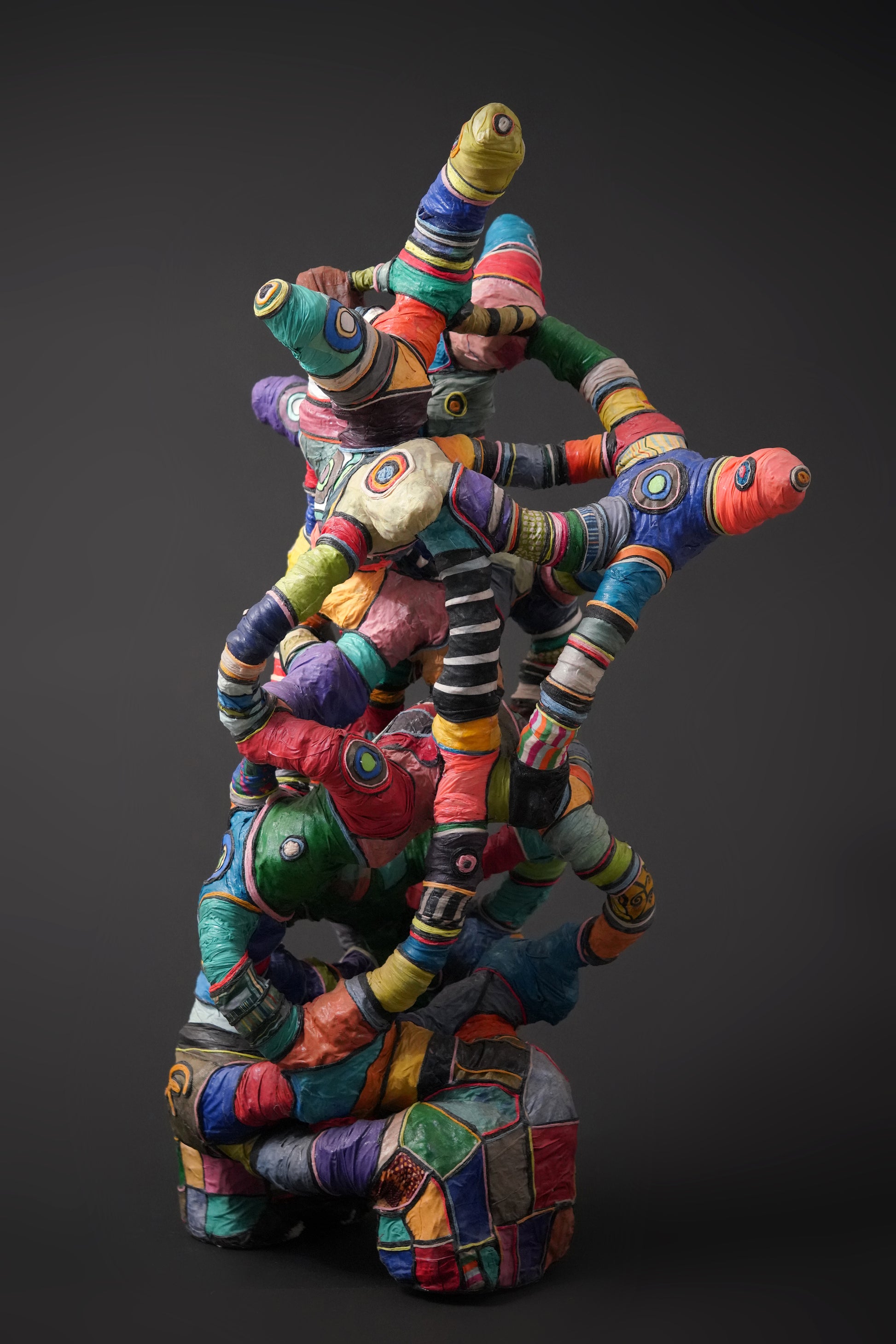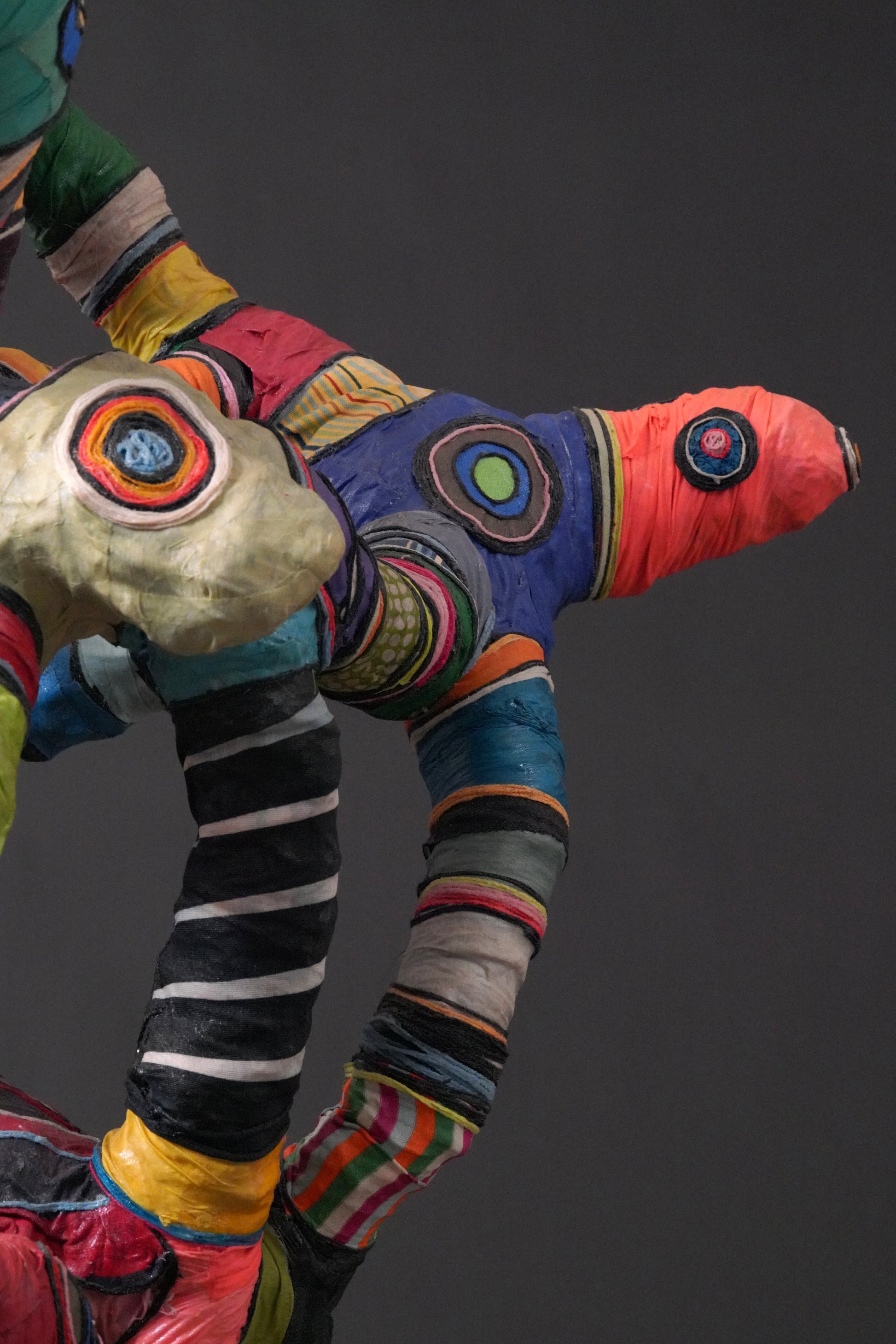 Contemporary artwork by Serge Anoumou, who endows his sculptures with intense colours, gifted at assembling and recycling, breathes new life into materials such as loincloth or fabric, woollen thread or rope, using them to create his large, complex sculptures.