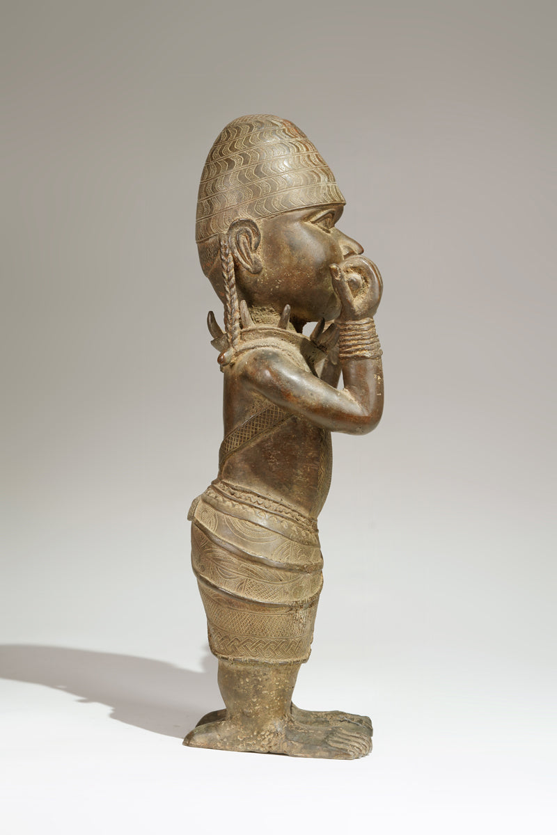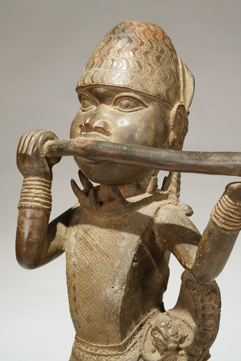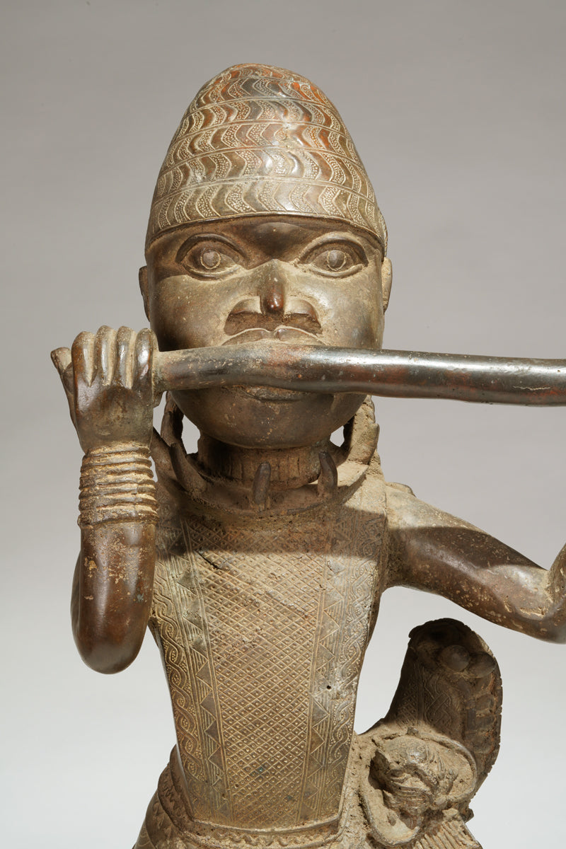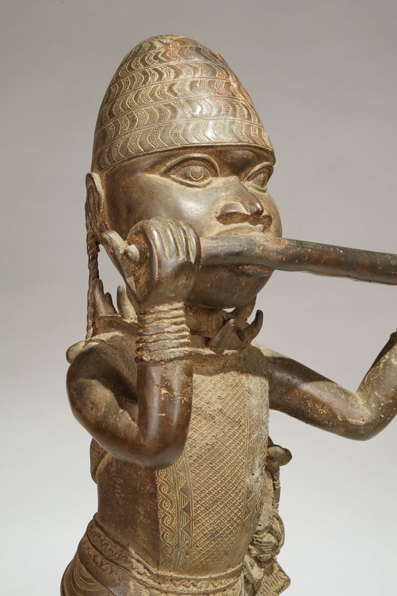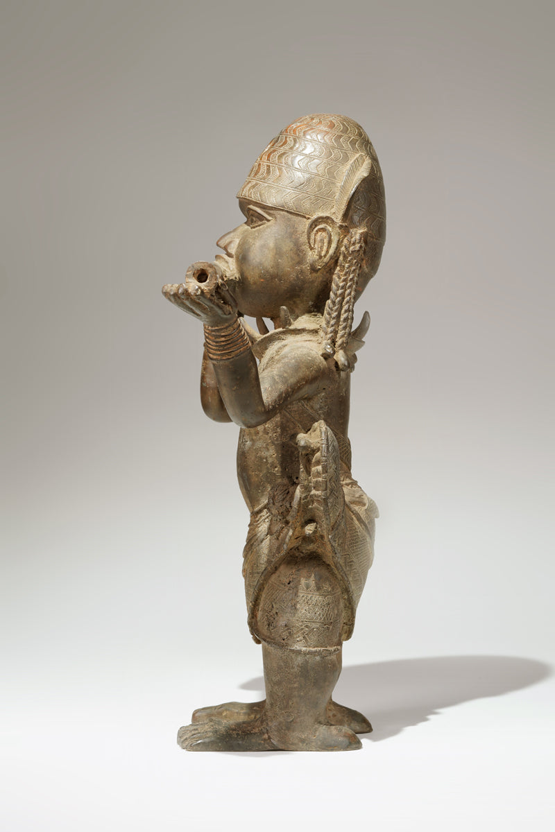 Hornblower Figures, cast brass, Nigeria, Benin; 17th or 18th century. Standing male figure of an Oba's hornblower playing a sideblown horn. He wears a feathered cap, a collar of leopard's teeth, a decorated chest-covering secured by straps across his sides, & a wrapper with an elaborate upturned tie ornamented at the hip with a leopard's mask. Cast in brass using the lost-wax method. Condition: complete, except for the loss of the top part of the cap feather, & two broken teeth at the back of the collar. An imperfect cutting with much contemporary patching on the back & sides. See: Supplementary File; "New Benin Discoveries in Scotland", by Dale Idiens, African Arts 14 (4), August, 1986, 52. Wider World Gallery Label Text, 2001: Hornblower. Nigeria, Benin. Seventeenth or eighteenth century. Cast brass figure of court attendant playing an ivory horn. He wears a hat with feather (damaged), a collar of leopard's teeth, a decorated chest covering secured by straps, and a wrapper with an elaborate upturned tie ornamented at the hip with a leopard mask. Three-dimensional figures of various forms were manufactured to stand on the altars of the obas (kings) in the palace courtyard. The hornblower figures are the rarest, and until the example here was discovered in Greenock, only four others in this style were known to exist. One belongs to a private collector on the continent, one is in a museum in Berlin, and two (including a badly damaged example) are in the British Museum, London. || The four Benin figures (A.1985.630-633) were donated to the McLean Museum and Art Gallery, 9 Union Street, Greenock in 1925 by Sir William Northrup McMillan (a wealthy American of Scots descent). The McLean Museum and Art Gallery lent the four figures to the Royal Scottish Museum on 1 February 1973 (A.L.468.1-4). The Inverclyde district Council (then responsible for the McLean Museum and Art Gallery), Municipal Buildings, Greenock sold the four figures to the Royal Museum of Scotland on 18 November 1985.