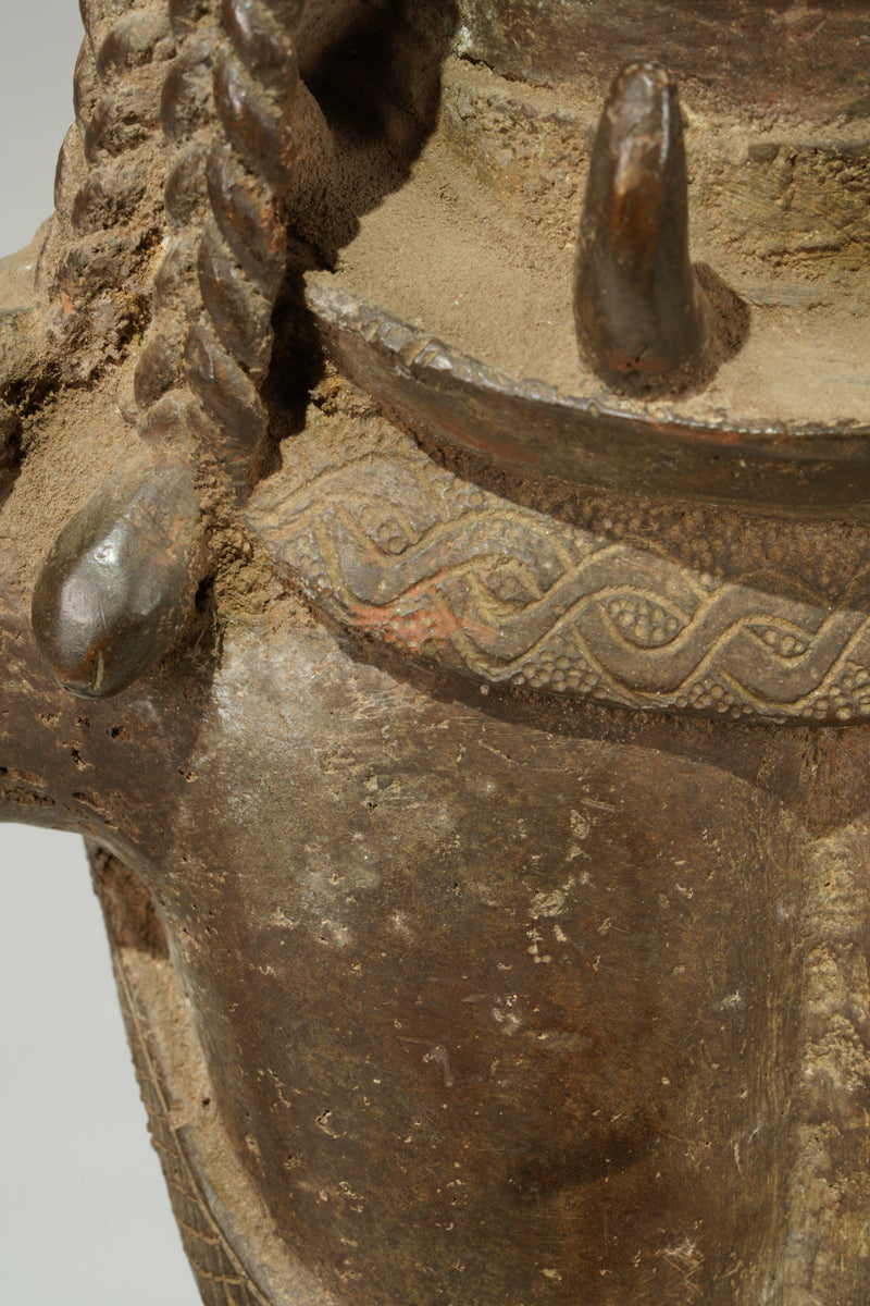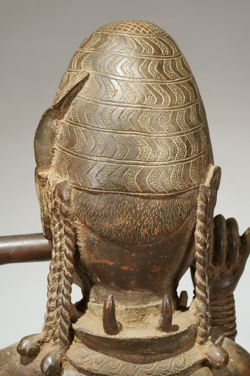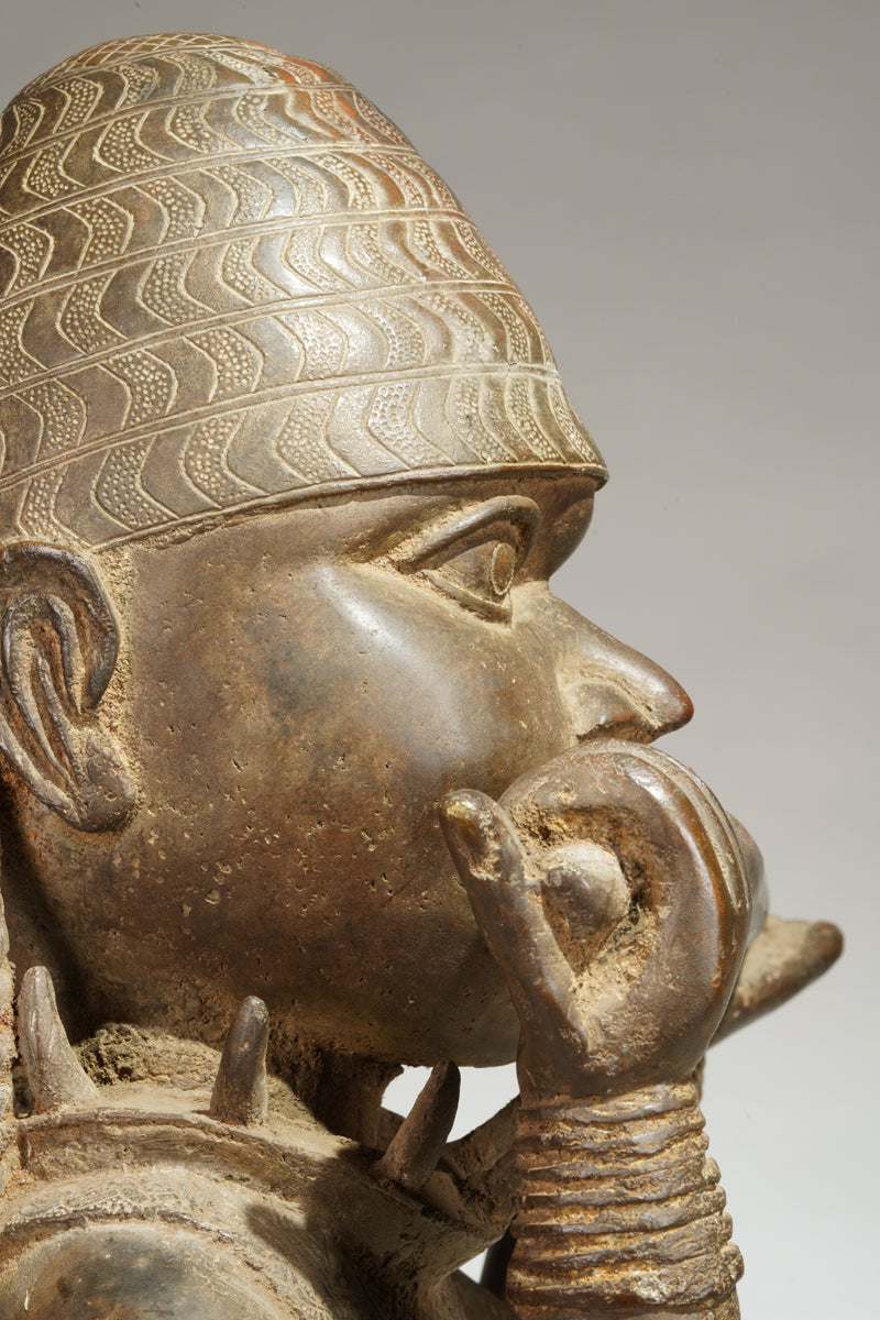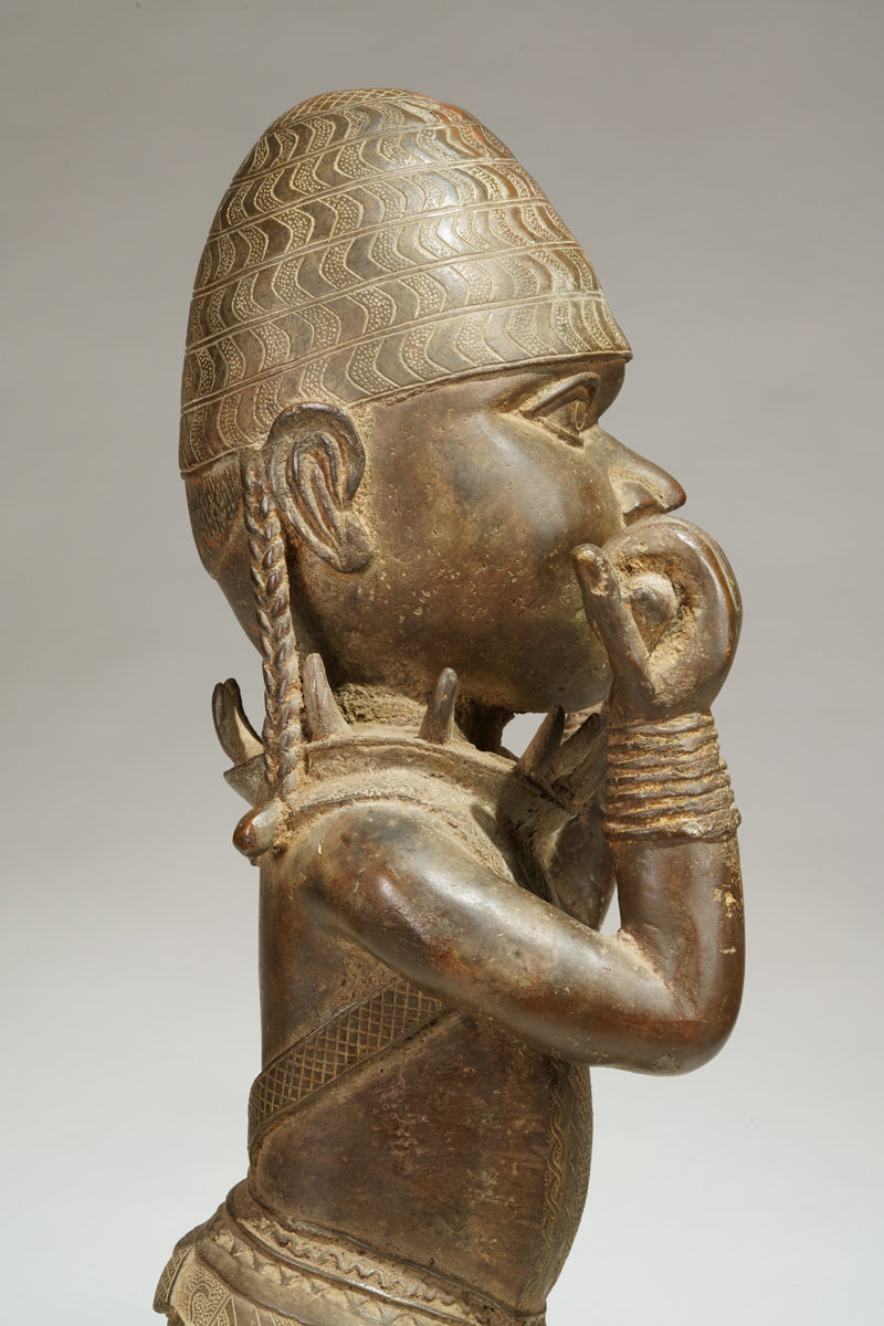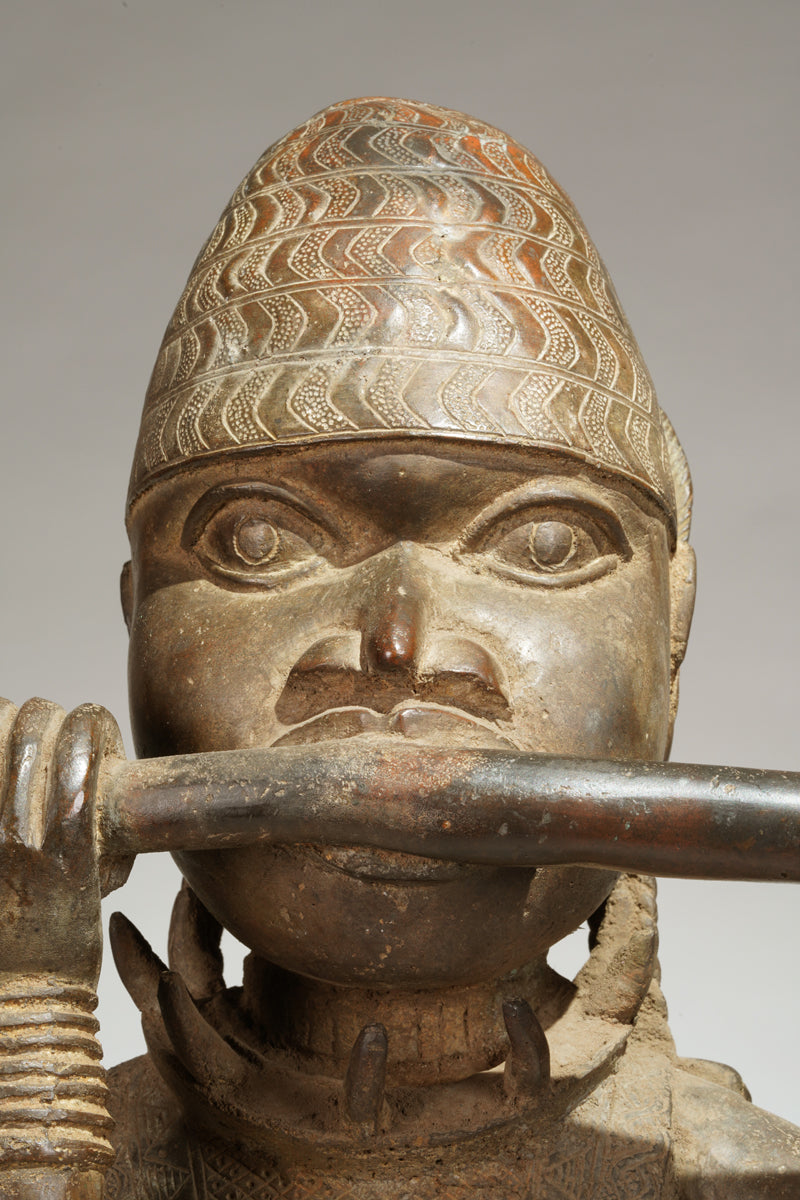 Hornblower Figures, cast brass, Nigeria, Benin; 17th or 18th century. Standing male figure of an Oba's hornblower playing a sideblown horn. He wears a feathered cap, a collar of leopard's teeth, a decorated chest-covering secured by straps across his sides, & a wrapper with an elaborate upturned tie ornamented at the hip with a leopard's mask. Cast in brass using the lost-wax method. Condition: complete, except for the loss of the top part of the cap feather, & two broken teeth at the back of the collar. An imperfect cutting with much contemporary patching on the back & sides. See: Supplementary File; "New Benin Discoveries in Scotland", by Dale Idiens, African Arts 14 (4), August, 1986, 52. Wider World Gallery Label Text, 2001: Hornblower. Nigeria, Benin. Seventeenth or eighteenth century. Cast brass figure of court attendant playing an ivory horn. He wears a hat with feather (damaged), a collar of leopard's teeth, a decorated chest covering secured by straps, and a wrapper with an elaborate upturned tie ornamented at the hip with a leopard mask. Three-dimensional figures of various forms were manufactured to stand on the altars of the obas (kings) in the palace courtyard. The hornblower figures are the rarest, and until the example here was discovered in Greenock, only four others in this style were known to exist. One belongs to a private collector on the continent, one is in a museum in Berlin, and two (including a badly damaged example) are in the British Museum, London. || The four Benin figures (A.1985.630-633) were donated to the McLean Museum and Art Gallery, 9 Union Street, Greenock in 1925 by Sir William Northrup McMillan (a wealthy American of Scots descent). The McLean Museum and Art Gallery lent the four figures to the Royal Scottish Museum on 1 February 1973 (A.L.468.1-4). The Inverclyde district Council (then responsible for the McLean Museum and Art Gallery), Municipal Buildings, Greenock sold the four figures to the Royal Museum of Scotland on 18 November 1985.