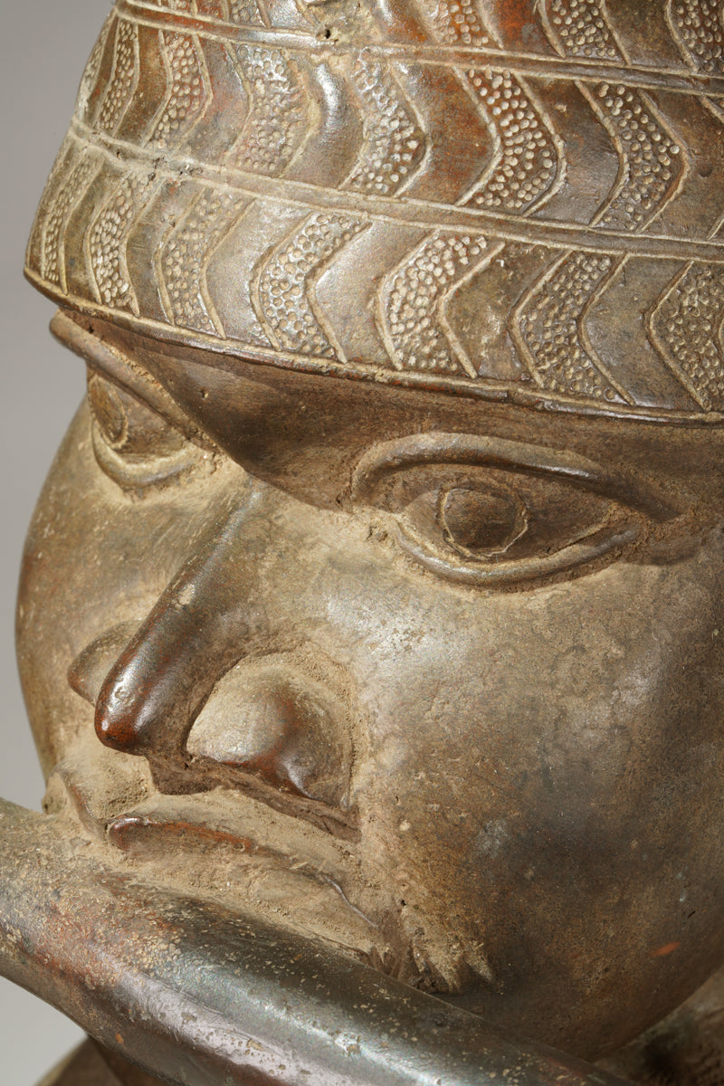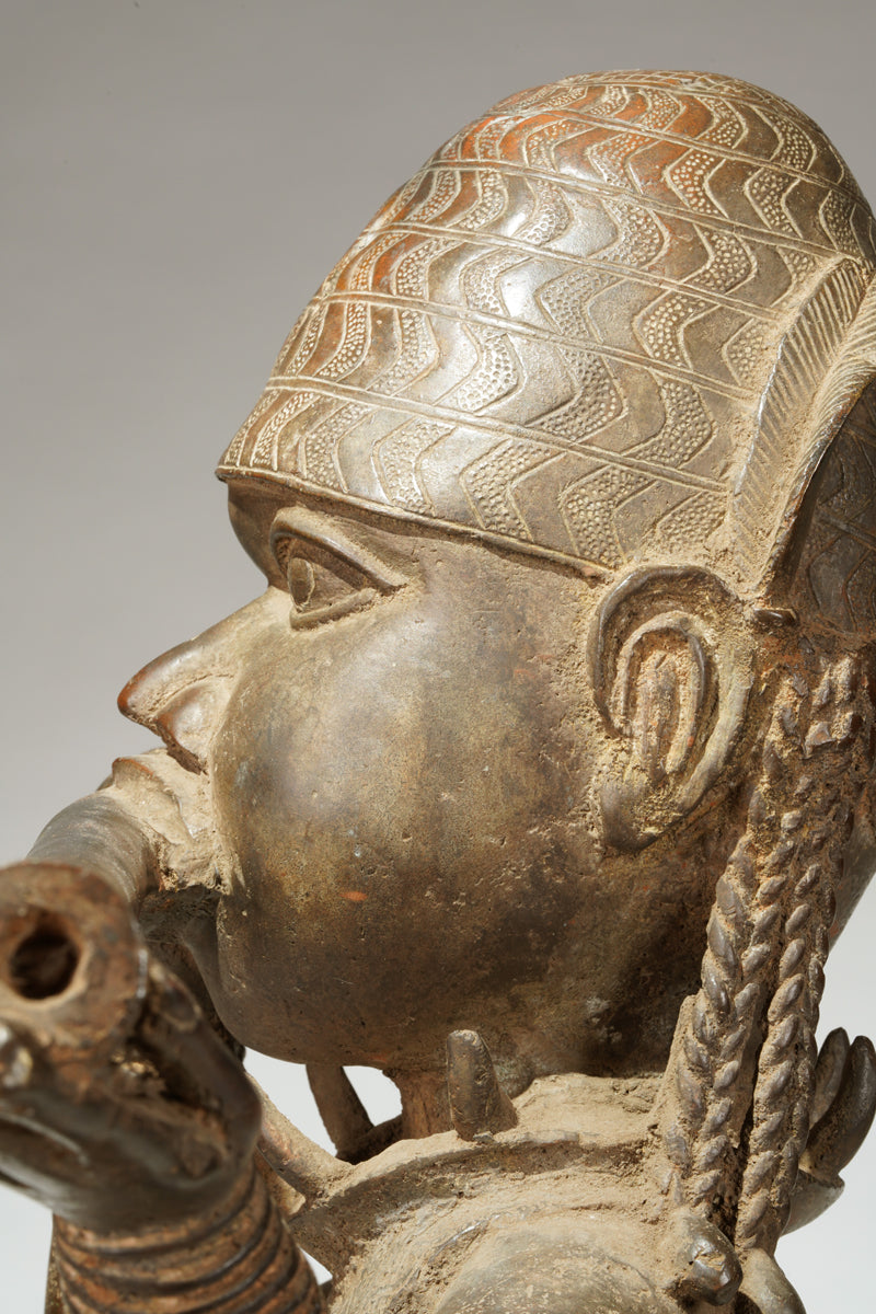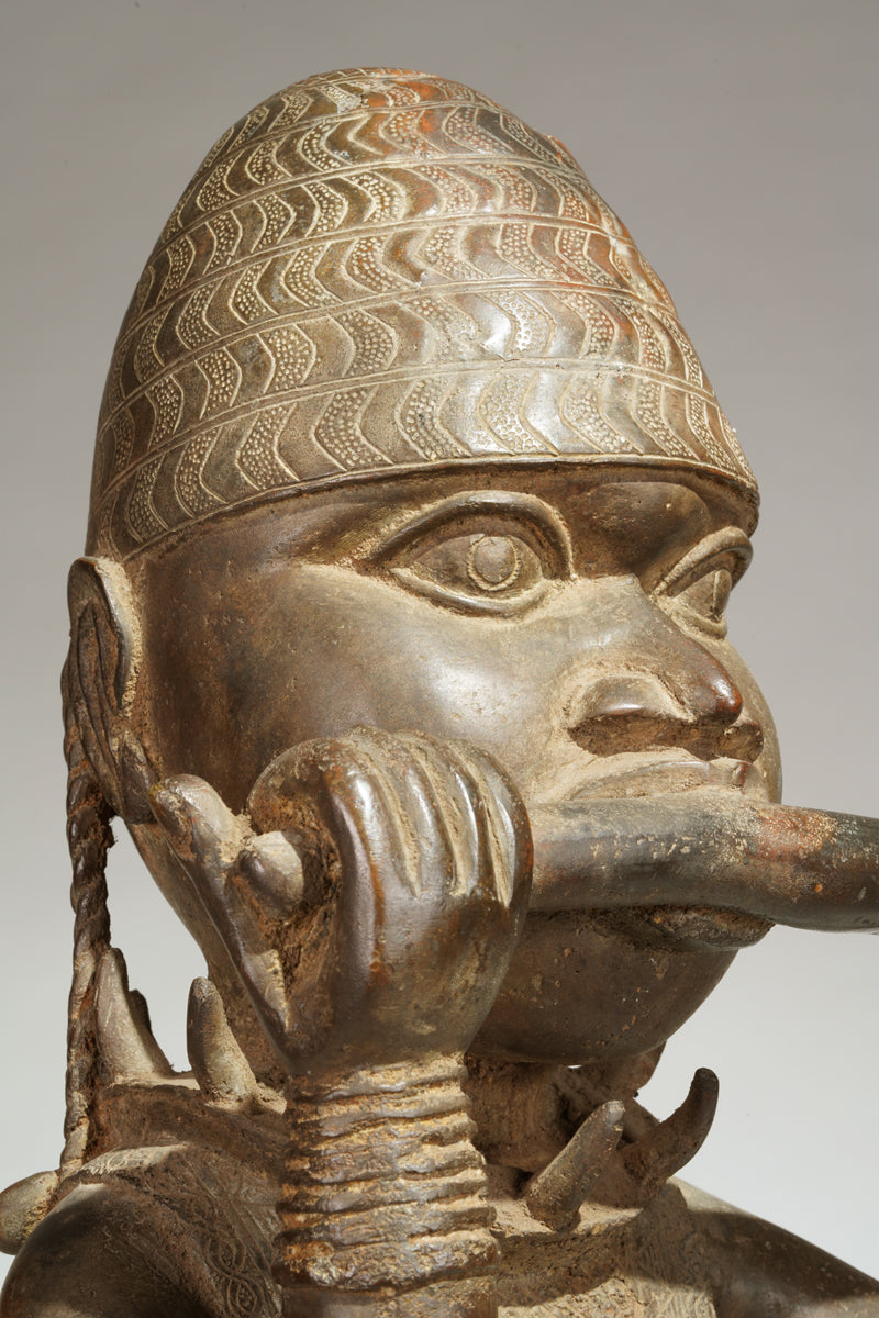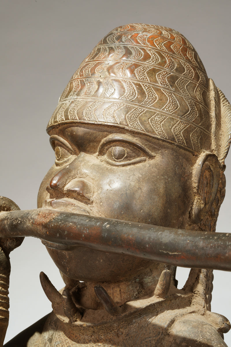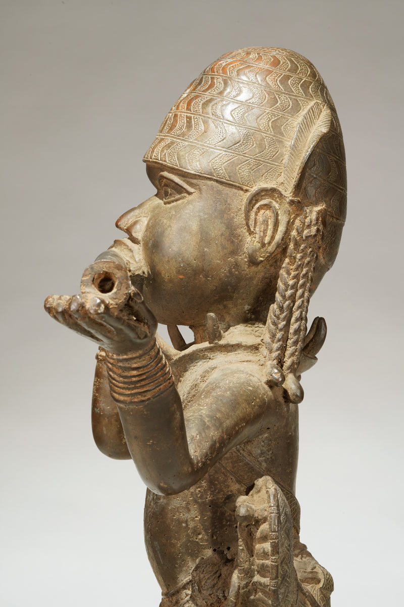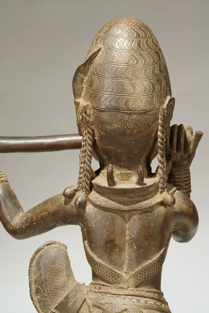 A Horn blower in the style of Benin, Ikpakohẹn (horn-blower or flute-player figures) provide entertainment at private or public functions, festivals or events. He is depicted as playing an Oko, a horn made of ivory. Ikpakohẹn are members of a guild of the same name.
