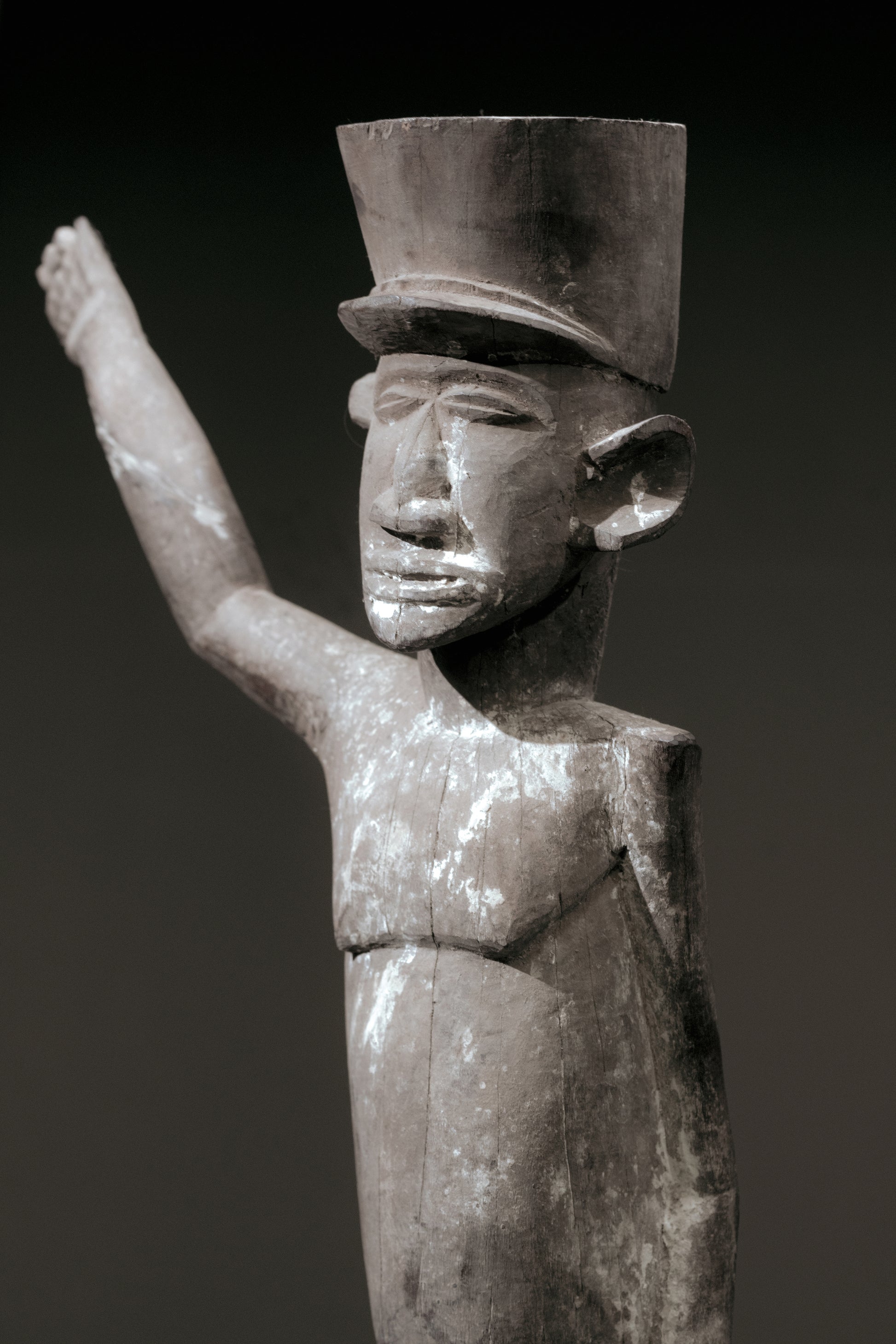 Lobi "Colonfigure", Ivory Coast; heavy, hard Sankolo wood. We collected 5 sculptures of this carver, all male figures were so-called "Colon" Figures. We suppose, that this carver is performing Africans in the shape of Europeans with the signs of a French Policeman or Soldier. A sculptural expression, which we know from Kilite Noufe. But this carver is - according to our information - dead for a long time and his sculptures are probably from the time before the Ivory Coast was independent of France.