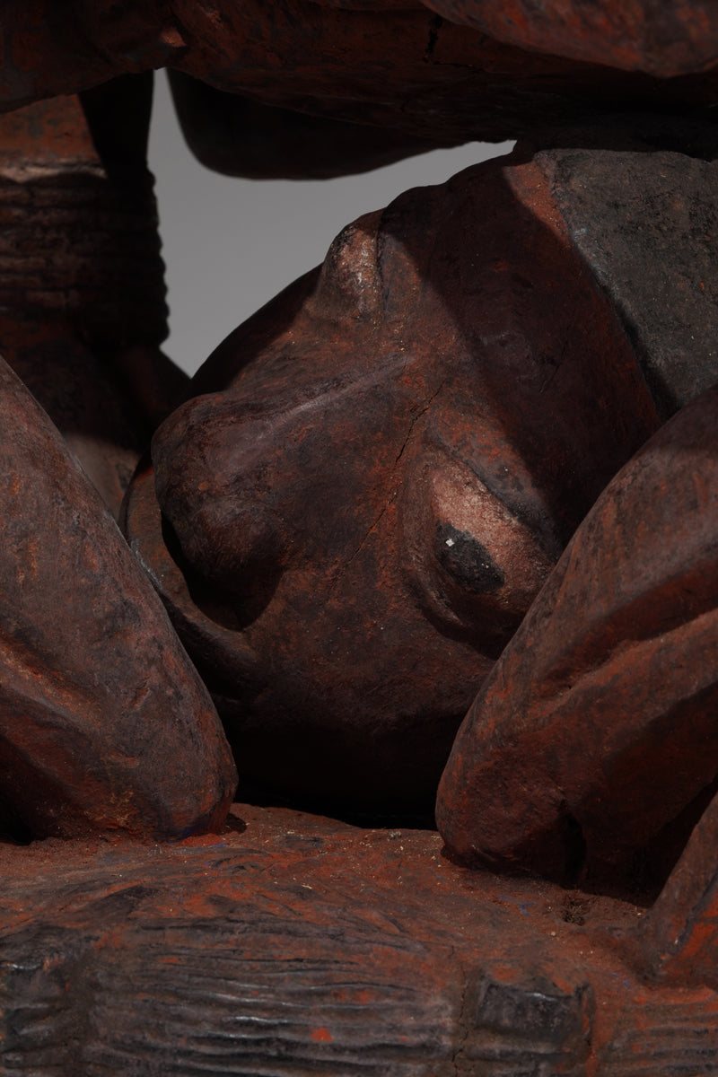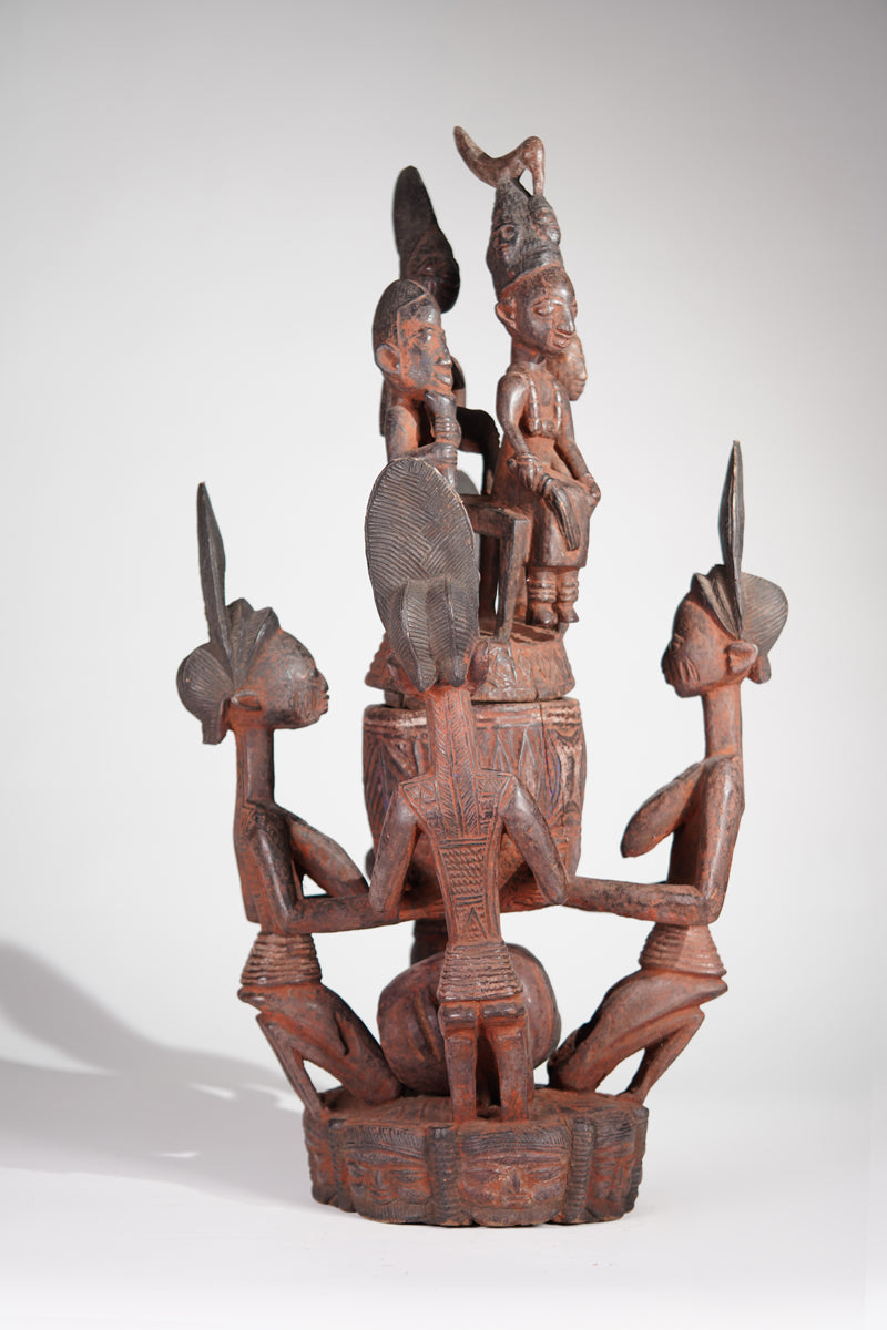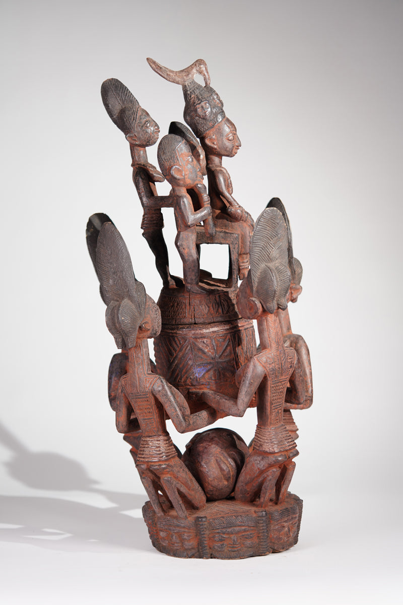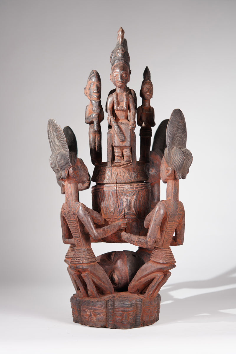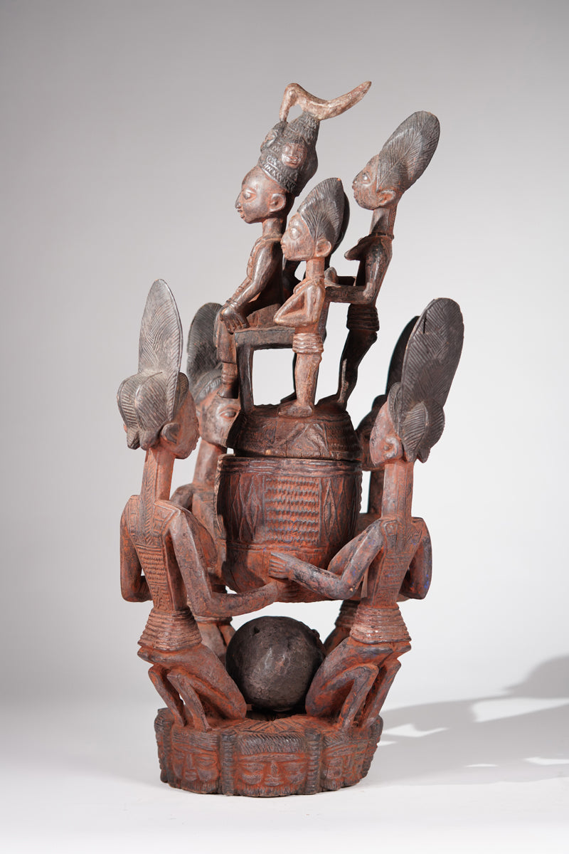 Two of Olowe’s most famous sculptures are similar in depicting a kneeling female figure holding a bowl, which is supported by smaller kneeling or standing figures from below and with additional figures on the lid. In one instance, the figures are four dancing women. On the other, two cocks face one another. Beneath the bowl and held within its own space is a man’s head that freely rolls about. One of the bowls is in the Walt Disney-Tishman African Art Collection; the other is in the collection of the National Museum of African Art. Now there is a third, slightly smaller in scale but equally brilliant in its complexity of composition and excellence of condition. Two of Olowe’s most famous sculptures are similar in depicting a kneeling female figure holding a bowl, which is supported by smaller kneeling or standing figures from below and with additional figures on the lid. In one instance, the figures are four dancing women. On the other, two cocks face one another. Beneath the bowl and held within its own space is a man’s head that freely rolls about. One of the bowls is in the Walt Disney-Tishman African Art Collection; the other is in the collection of the National Museum of African Art. Now there is a third, slightly smaller in scale but equally brilliant in its complexity of composition and excellence of condition.